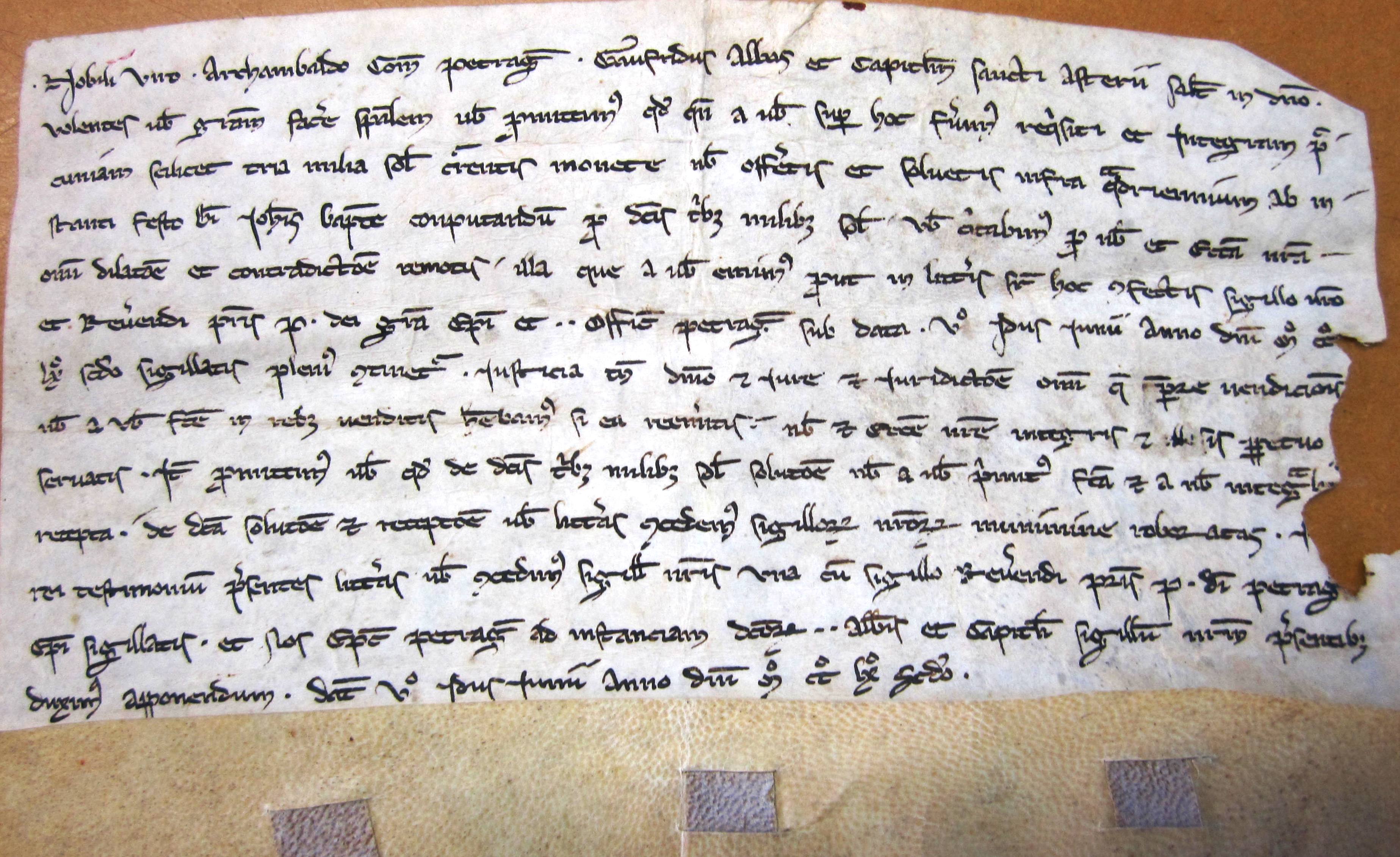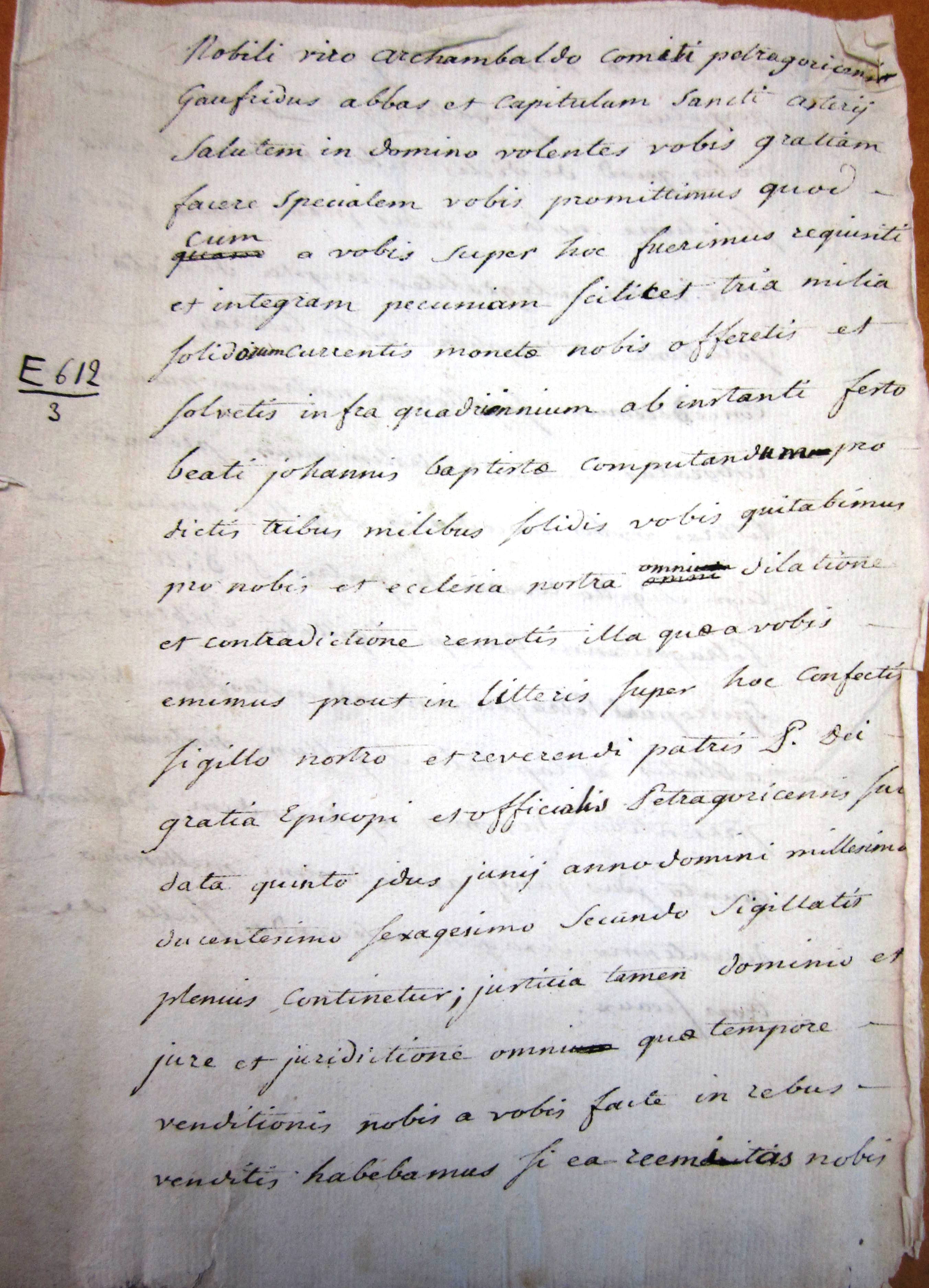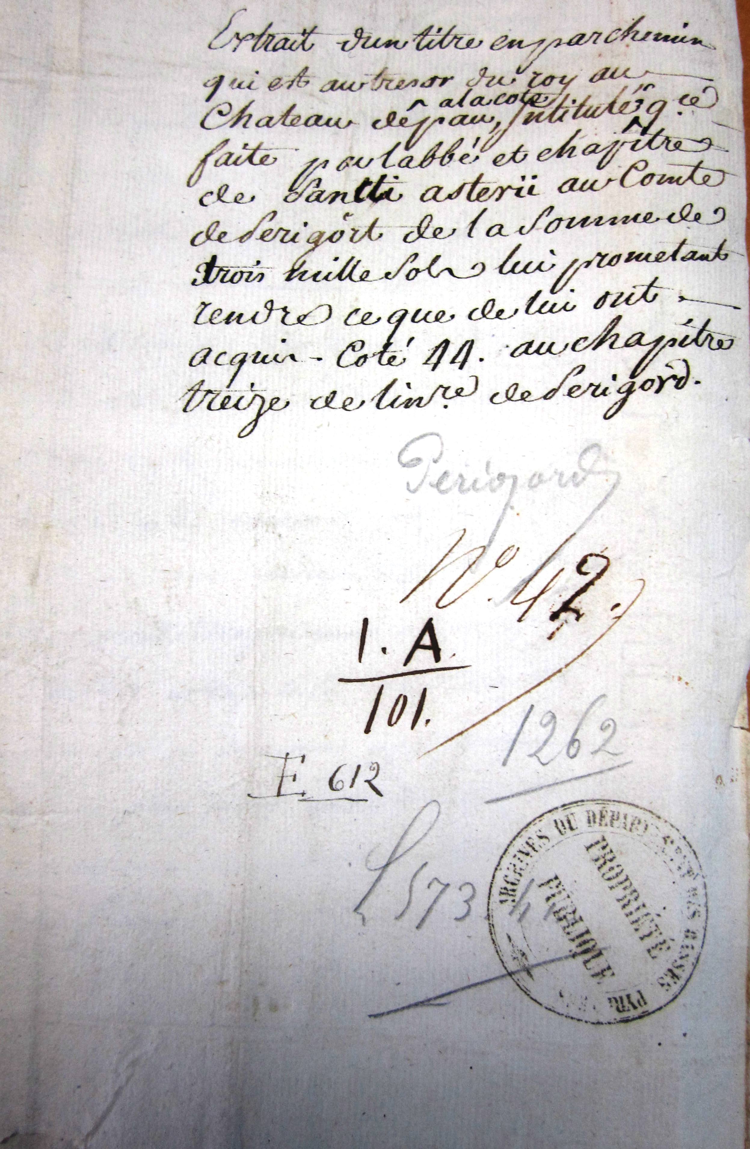 Quittance de 3.000 sous par Geoffroy, abbé de Saint-Astier, en faveur d'Archambaud II, comte de Périgord ; l'abbé promet en outre de lui recéder ce qu'il a acquis (1262).