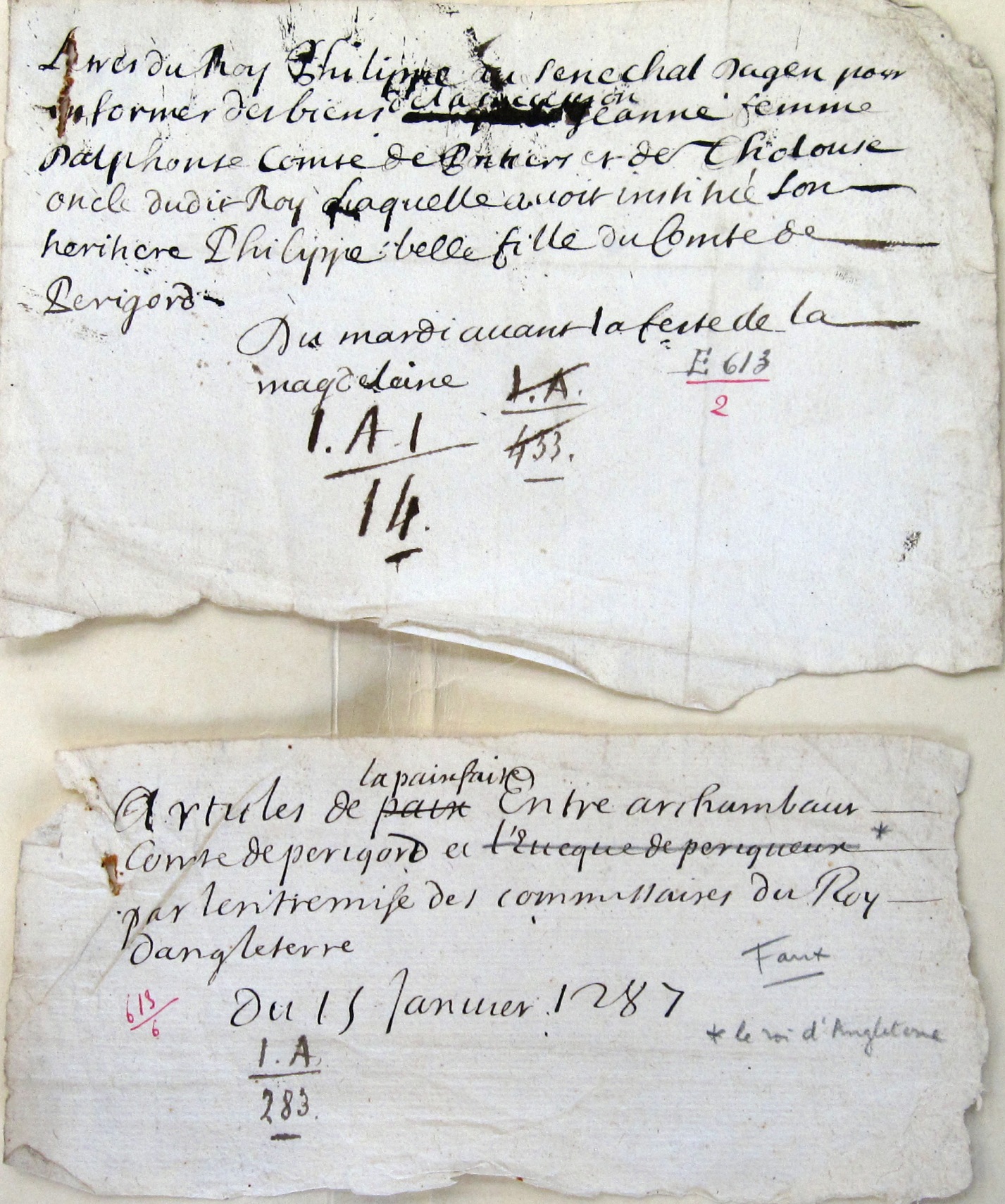 - Lettres de Philippe-le-Hardi au sénéchal d'Agen, pour s'informer de la valeur de la succession de Jeanne, femme d'Alphonse, comte de Poitiers, qui avait institué pour son héritière Philippa, belle-fille d'Archambaud II (III), comte de Périgord (13ème s.)