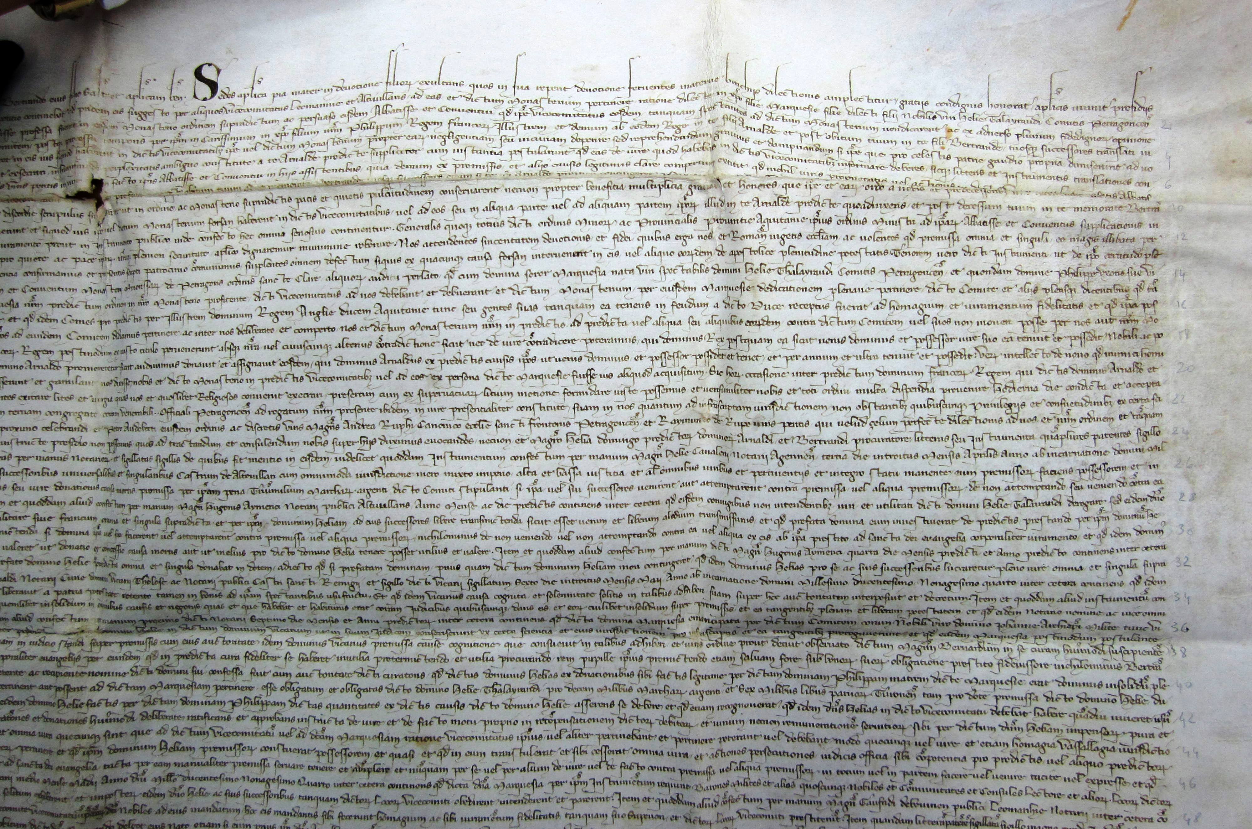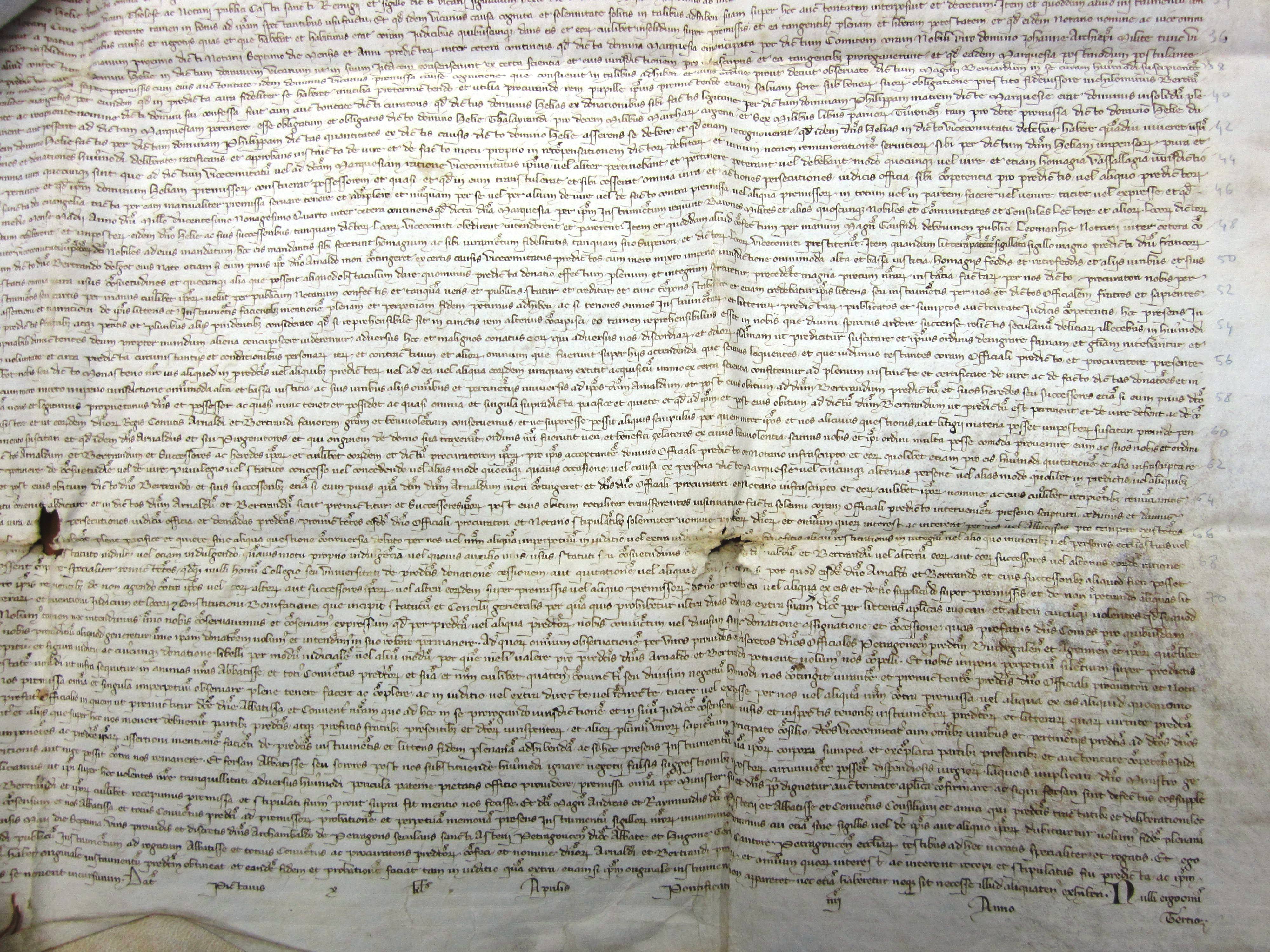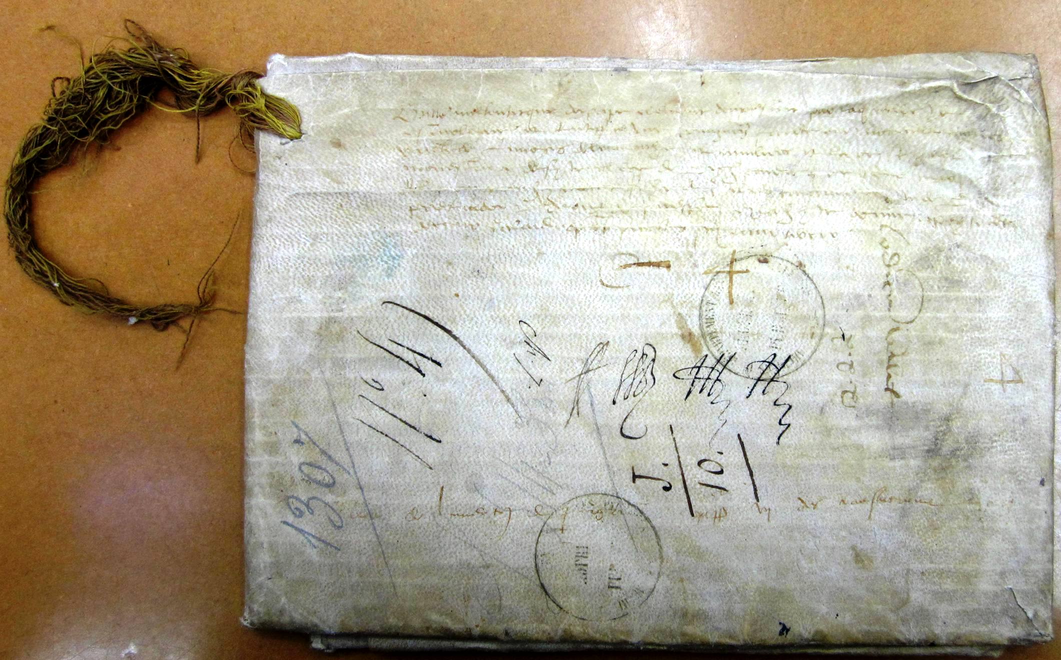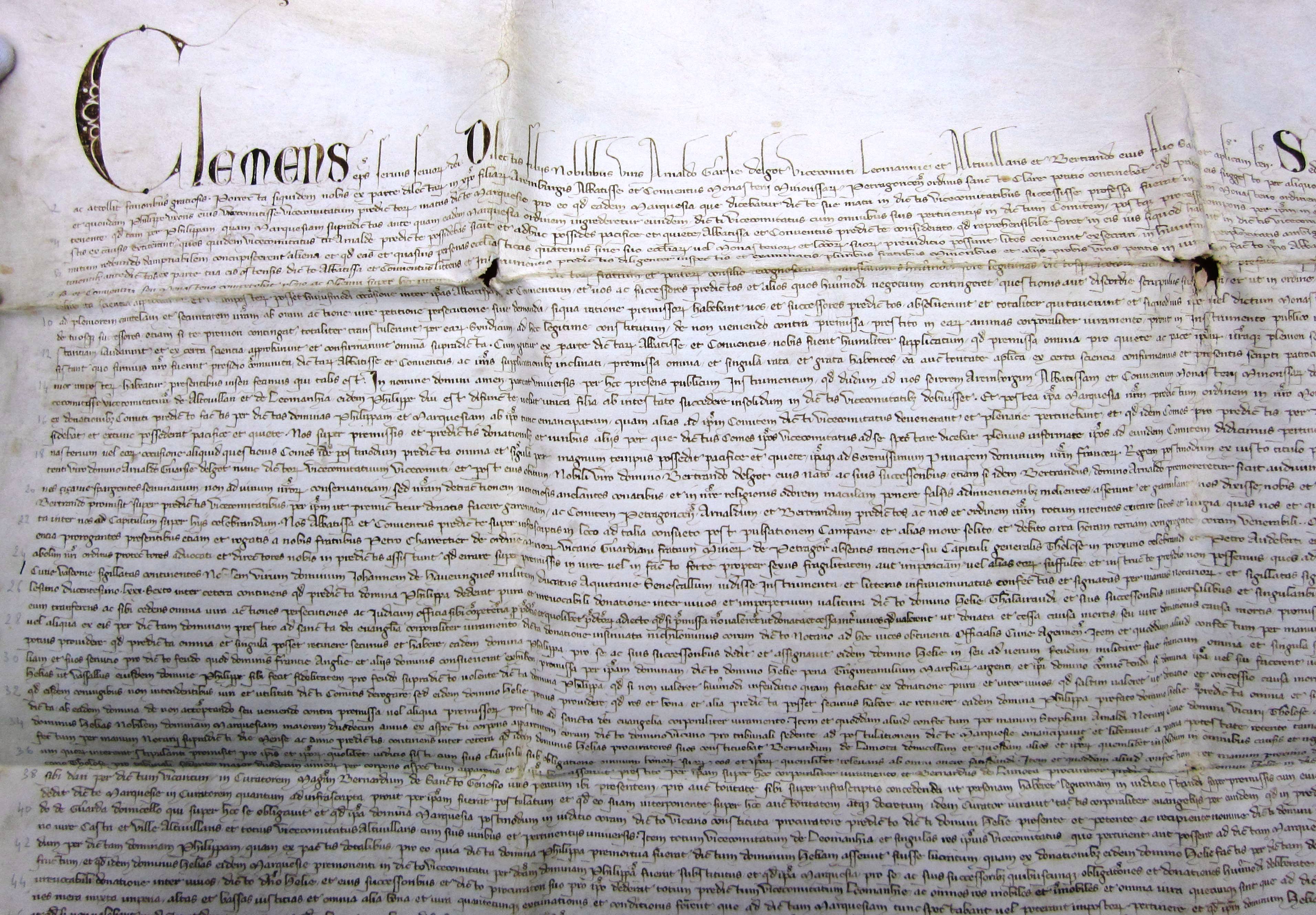 E 616 Bulle du pape Clément V ratifiant une transaction passée entre Arnaud Garcie, vicomte de Lomagne, et l'abbesse du monastère de Sainte-Claire de Périgueux au sujet des vicomtés de Lomagne et d'Auvilllars (1307) (exemplaire n° 2) |