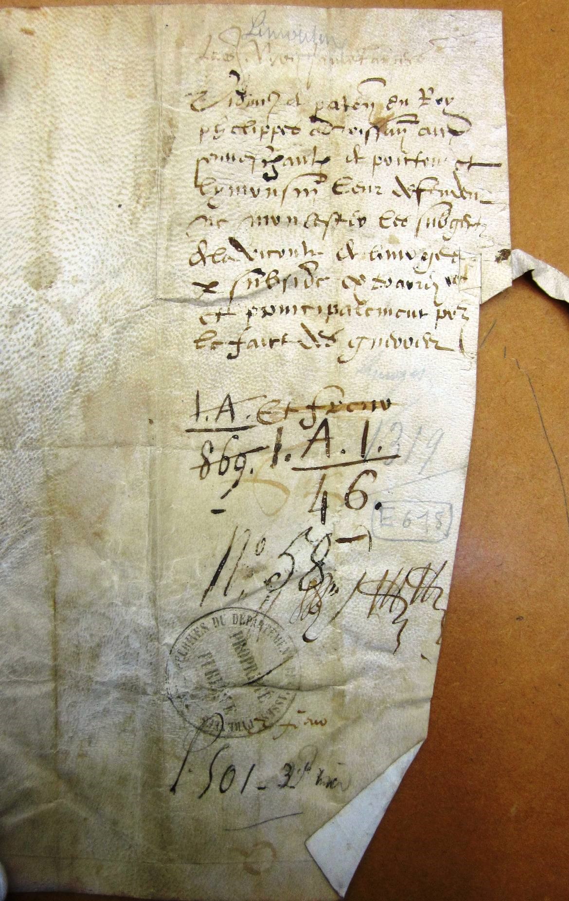 - cotté n° 65 dans l'inventaire de Jean Fabri E 607, (peut-être in chapitre 2 (privilèges, grâces, confirmations, autorités, prééminences, ressorts de justice et ordonnances etc.), f° 25 v° (manquant)?