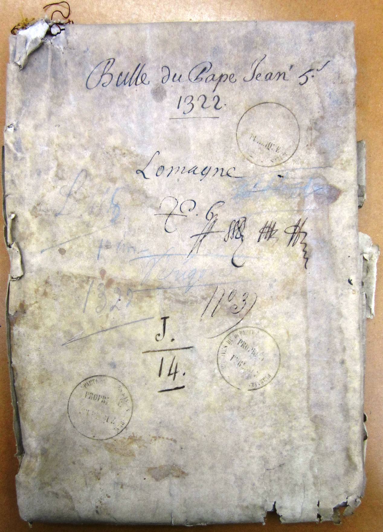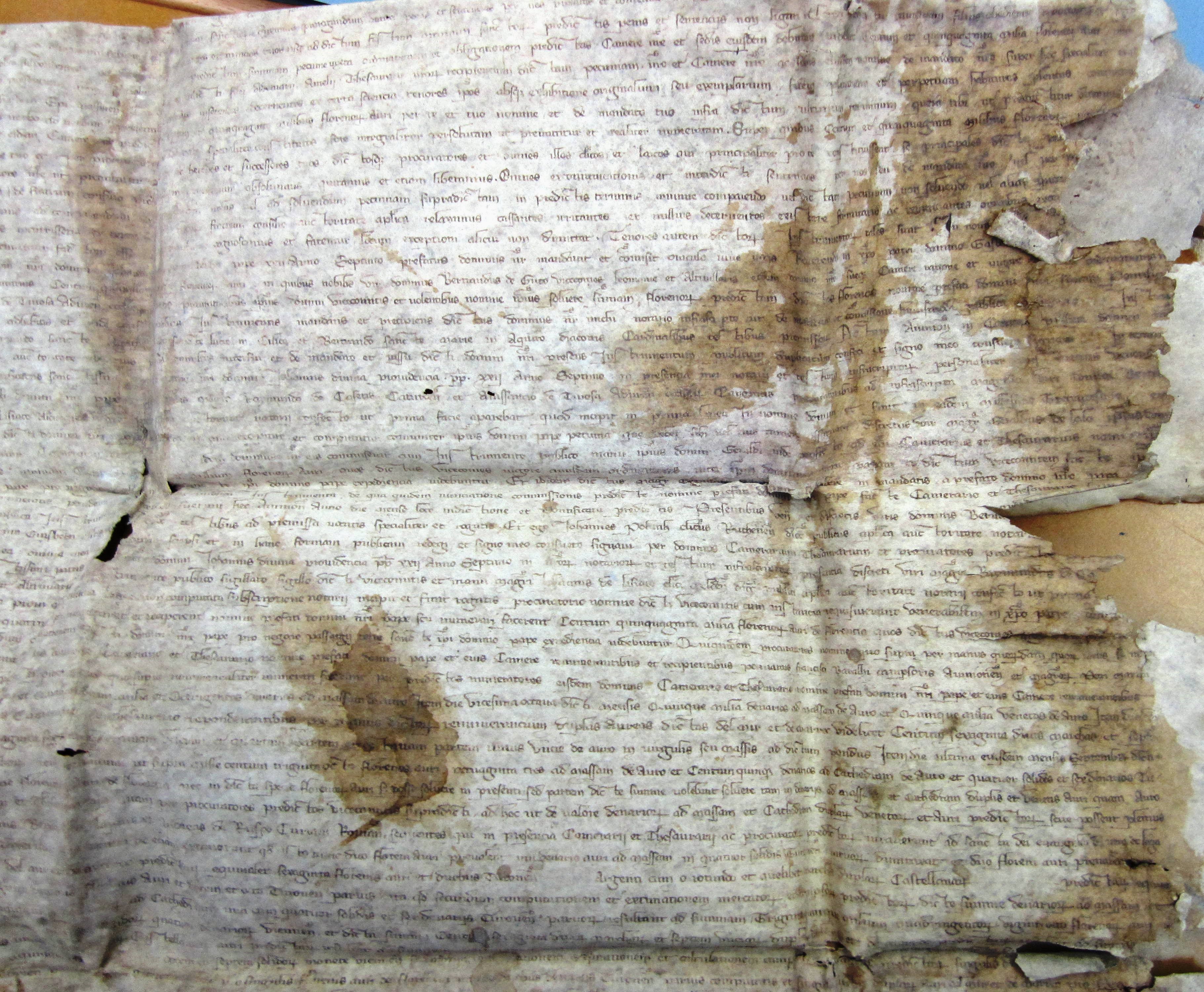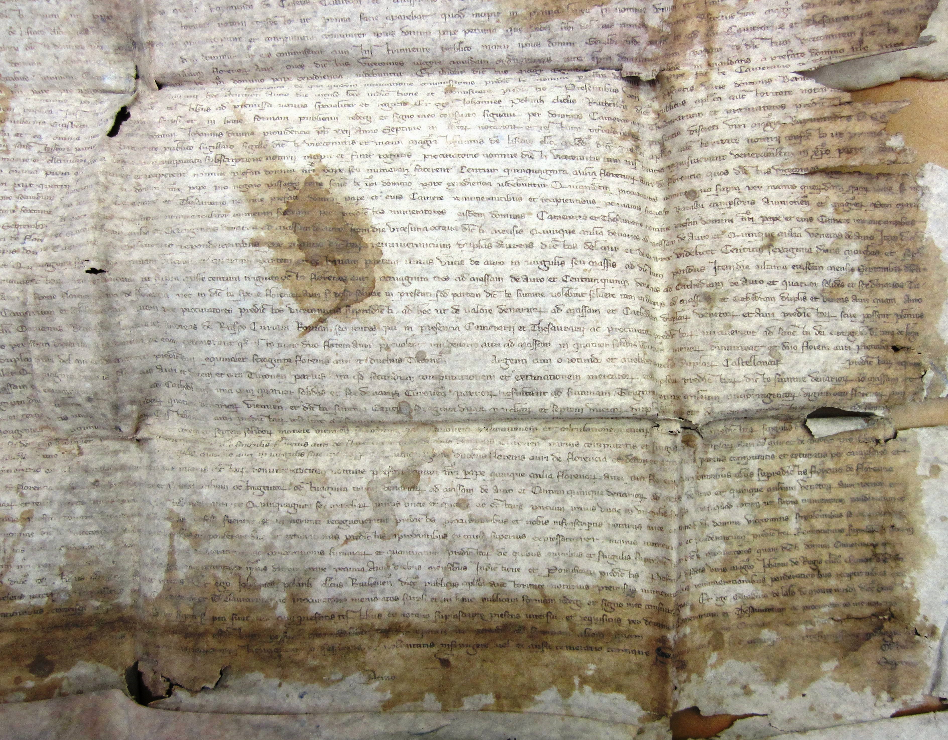 Anno nativitatis ejusdem millesimo trecentesimo vicesimo secundo, die vicesima quinta mensis septembris, indictione quinta, pontificatus sanctissimi patris et domini nostri, domini Johannis divina providentia pape XXII anno septimo, in presentia mei notarii et testium infrascriptorum, personaliter constituas venerabili in Christo patre domino Gasberto Dei gratia episcopo Massiliensi camerario, et discreto viro domino Ademario Amelii succentore ecclesie Albiensis, thesaurario dicti domini nostri pape, et discretis viris magistro Raymundo de Casetis Caturcensis, et Anissaucio de Tuiosa Adurensis ecclesiarum canonicis, procuratoribus ad infrascripta magnifici viri domini Bertrando de Guto vicecomitis Leomanie et Altivillaris, cum instrumento publico sigillato sigillo dicti vicecomitis, et manu magistri Johannis de Lisiaco clerici Meldensis diocesis, publici apostolica auctoritate notarii confecto, ut prima facie apparebat, quod incipit in prima linea : « in nomine Domini », et finit in eadem : « millesimo trecentesimo », et in secunda linea incipit : « vicesimo secundo », ac in ultima linea, non computata subscriptione notarii, incipit et finit « rogatis », infra clausuram palacii dicti domini nostri pape, in camera in qua recipitur et computatur comuniter ipsius domini pape pecunia que debet sibi vel ejus camere assignari, discretus vir magister Geraldus de Lalo ipsius domini pape capellanus, notarius publicus, ex parte dicti domini pape, a quo asseruit se habere in mandatis, nunciavit, et dixit dictis dominis camerario et thesaurario, quod idem dominus noster eis commiserat cum instrumento publico manu ipsius domini Geraldi inde confecto, quod ipsi camerarius et thesaurarius, nomine ipsius domini pape, et ejus camere, numerarent et reciperent a prenominatis procuratoribus vicecomitis supradicti instantibus et requirentibus summam centum quinquaginta milium florenorum auri, quos dictus vicecomes, vigore cujusdam ordinationis inter ipsum dominum nostrum papam et dictum vicecomitem facte, ipsi domino pape et ejus camere assiguare et solvere tenebatur astrictus, convertendam in hiis que, secundum ordinationem dicti domini nostri pape, pro negocio passagii Terre Sancte ipsi domino pape expedientia videbuntur; et ibidem dictus magister Geraldus subjunxit se habere in mandatis a prefato domino nostro papa quod ipse, una cum alio notario intersit, ut notarius, in traditione, numeratione et receptione pecunie supradicte, et per ipsum et dictum notarium de numeratis, ponderatis et receptis fiant publica instrumenta, de qua quidem nunciatione commissionis predicte, nomine prefati domini nostri pape facte camerario et thesaurario supradictis, tam ipsi camerarius et thesaurarius, quam procuratores vicecomitis supradicti requisiverunt me notarium infrascriptum quod eis facerem publica instrumenta. Acta fuerunt hec Avinione anno, die, mense, loco, indictione et pontificatu predictis, presentibus venerabilibus et discretis viris dominis Bernardo Vaquerii archidiacono Camagesii in ecclesia Vasatensi, Bernardo Begonis canonico Albiensi et Guillelmo Raffi ebdomadario ecclesie Mimatensis, ac Petro Marini et Guillelmo Guisberti clericis Caturcensis diocesis, testibus ad premissa vocatis specialiter et rogatis. Et ego Johannes Polayn clericus Ruthenensis diocesis, publicus apostolica auctoritate notarius, nuntiationi per dictum magistrum Geraldum eisdem dominis camerario et thesaurario facte et omnibus supradictis, una cum dictis testibus, interfui et ea omnia mea manu propria scripsi, et in hanc formam publicam redegi et signo meo consueto signavi per dominos camerarium thesaurarium et procuratores predictos requisitis. »