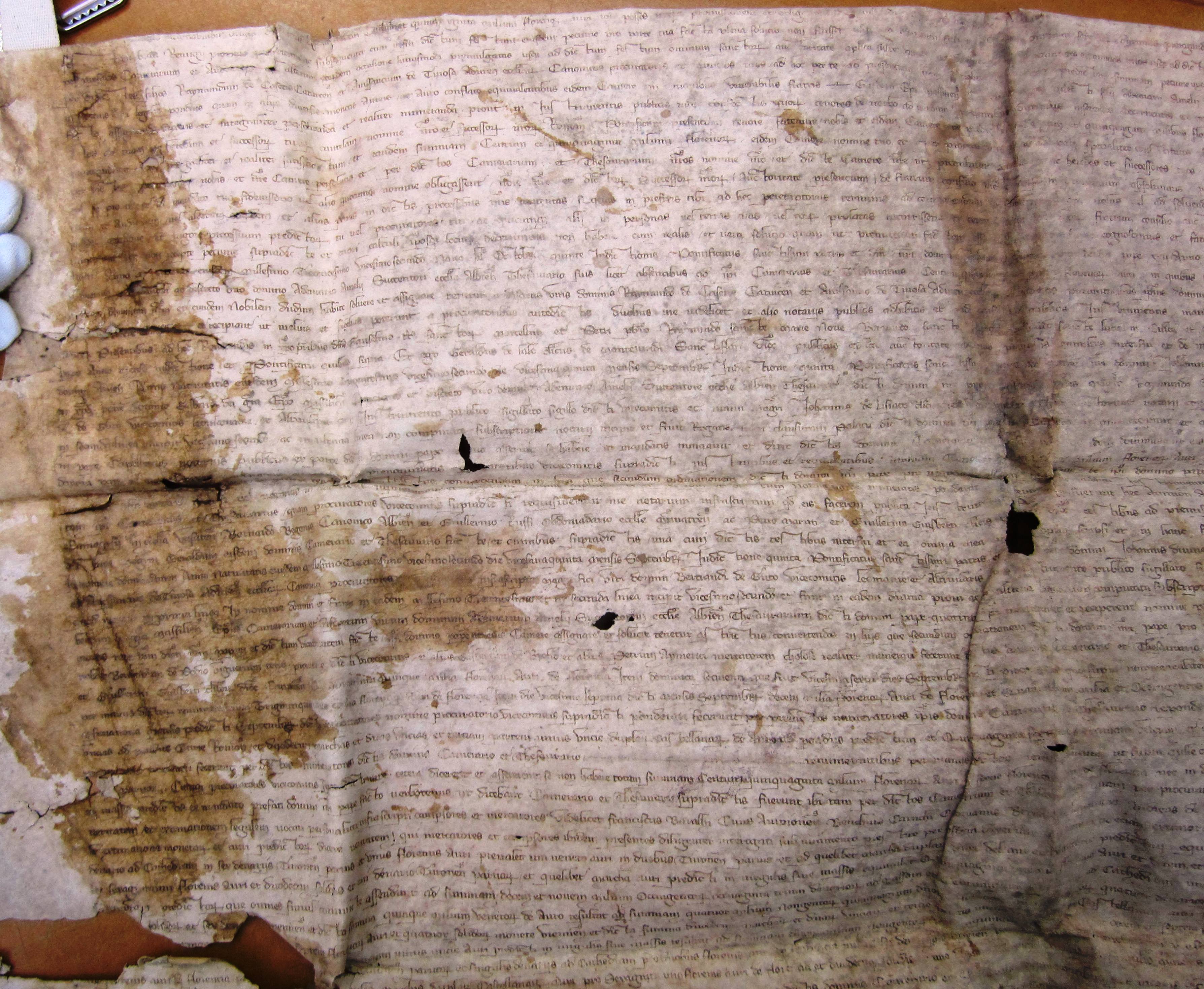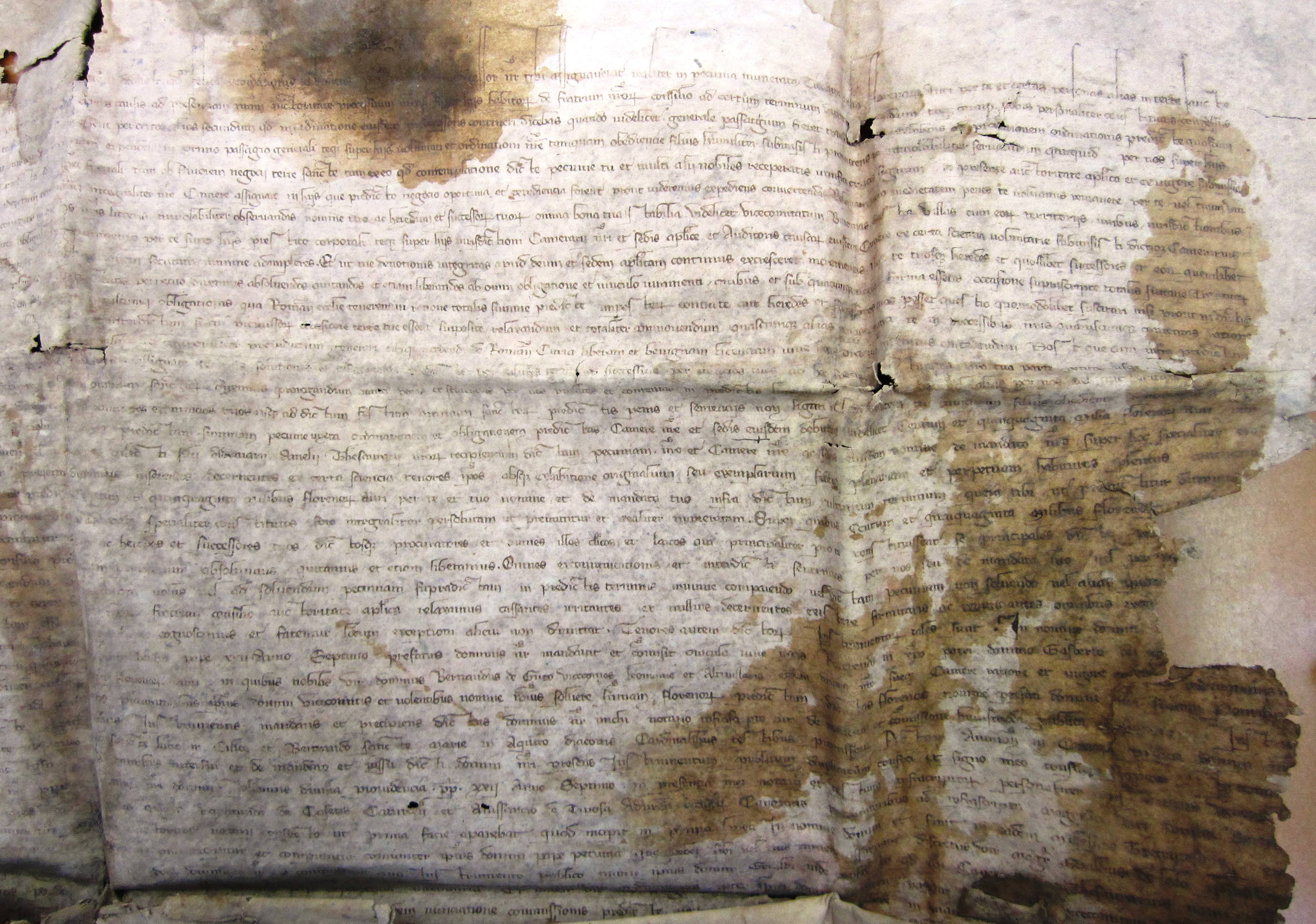 Cum autem tu, tanquam filius obediencie, devotionis et gratie, per dilectos filios Raymundum de Casetis, Caturcensis diocesis, Anissancium de Tuiosa Adurensis ecclesiarum canonicos, procuratores et nuncios tuos, ad hoc per te ad presentiam nostram specialiter destinatos, predictam summam pecunie, juxta ordinationem et obligationem predictas, camere nostre et sedis ejusdem debitam, videlicet centum et quinquaginta milia florenorum auri, tam in florenis auri legalis ponderis, quam in aliis diversis monetis aureis, ac auro conflato equivalentibus, eidem camere in manibus venerabilis fratris Gasberti episcopi Massiliensis, camerarii, et dilecti filii Ademarii Amelii, thesaurarii nostrorum recipientium dictam pecuniam, nostro et camere nostre, ac sedis ejusdem nomine, de mandato nostro super hoc specialiter eis facto, assignanda duxeris et integraliter persolvenda et realiter numeranda, prout in instrumentis publicis inde confectis, quorum tenores de verbo ad verbum presentibus duximus inserendos, decernentes ex certa sciencia tenores ipsos, absque exhibitione originalium seu exemplarium fidem plenariam et perpetuam habituros, plenius continetur; nos, ad tuam ac heredum et successorum tuorum cautelam, nomine nostro et successorum nostrorum Romanorum pontificum, presentium tenore, fatemur nobis et eidem camere de predictis centum et quinquaginta milibus florenorum auri, per te et tuo nomine et de mandato tuo, infra dictum ultimum terminum, quem tibi, ut premittitur, duximus prorogandum, fore integraliter et realiter satisfactum, et eandem summam centum et quinquaginta milium florenorum eidem camere, nomine tuo et per procuratores tuos ad hoc a te specialiter constitutos fore integraliter persolutam, ut premittitur, et realiter numeratam, super quibus centum et quinquaginta milibus florenorum, nomine tuo per dictos procuratores nobis et nostre camere persolutis et per dictos camerarium et thesaurarium nostros nomine nostro et dicte camere nostre, ut premittitur, receptis, te ac heredes et successores tuos, dictosque procuratores et omnes illos clericos et laycos, qui principaliter pro te constituissent se principales dicte pecunie debitores, vel se pro te et de mandato tuo, fidejussorio vel alio quocunque nomine obligassent, nomine nostro et dictorum successorum nostrorum auctoritate presentium, de fratrum consilio predictorum, in perpetuum absolvimus, quitamus et etiam liberamus, omnes excommunicationis et interdicti sententias per nos seu de mandato nostro vel per prefatos camerarium et auditorem vel alterum eorundem, et alias penas in dictis processibus nostris contentas, si quas in prefixis tibi ad hec peremptoriis terminis ad comparendum personaliter coram nobis, vel ad solvendum pecuniam predictam in predictis terminis minime comparendo, vel dictam pecuniam non solvendo, vel alias quocumque modo, premissorum occasione et vigore processuum predictorum, tu vel procuratores tui ac quicumque alii in personas, vel terras tuas, vel eorum prolatas incurrissetis, ex certa sciencia, de ipsorum fratrum consilio, auctoritate apostolica relaxamus, quassantes, irritantes et nullius decernentes existere firmitatis, ac renunciantes omnibus exceptionibus non numerate et non recepte pecunie supradicte, et errori calculi, ipsosque locum decernimus non habere ; cum realis et vera solutio, quam, ut premittitur, factam esse, absque errore aliquo, cognoscimus et fatemur, locum exceptioni alicui non dimittat.