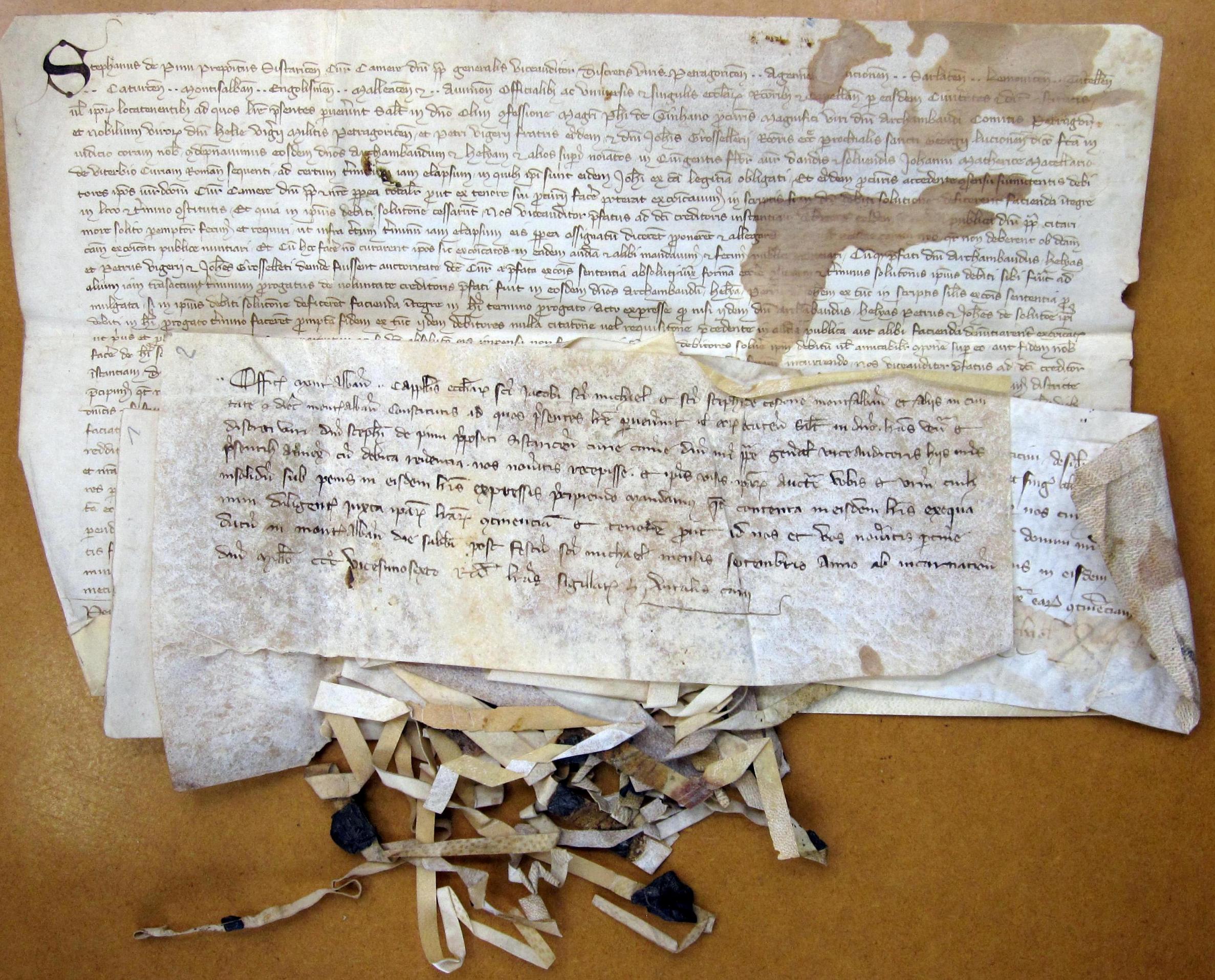 1325-1326. — Excommunication prononcée par l'official de Périgueux contre Archambaud III, comte de Périgord, pour une somme de 500 florins due à des marchands florentins ; — protestation faite par Mathe d'Albret contre l'assignation des 500 livres de rente données à Jeanne de Pons; — publication de la sentence d'excommunication prenoncée contre le comte de Périgord par les officiaux de Montauban, Périgueux, Sarlat et Cahors ; — quittance de Peyrose de Boan à Archambaud III, comte de Périgord, ponr une somme de 95 livres qu'il lui devait; — reconnaissances de fiefs en faveur du comte de Périgord faites par : Guillaume Goyn, pour la terre de La Richardie ; Henri de La Tour, pour les terres de Flayac, Margnac, La Tourettie, La Ramenchie ; Séguin d'Engunan, pour la terre du Puy du Tirac et de Chaone; Raymond Hélie, écuyer ; Hélie Jaufre Des Coutures, pour le fief de Falguier ; Raymond des Coutures, pour le domaine de Romanes ; Raymond de Vernode, pour la maison de Vals, située dans la paroisse de Saint-Médard de Drone ; Pierre Vigier de L'Isle ; Galtier de Vernode ; Itier de Malayoles, pour le domaine de la Challandie, etc.