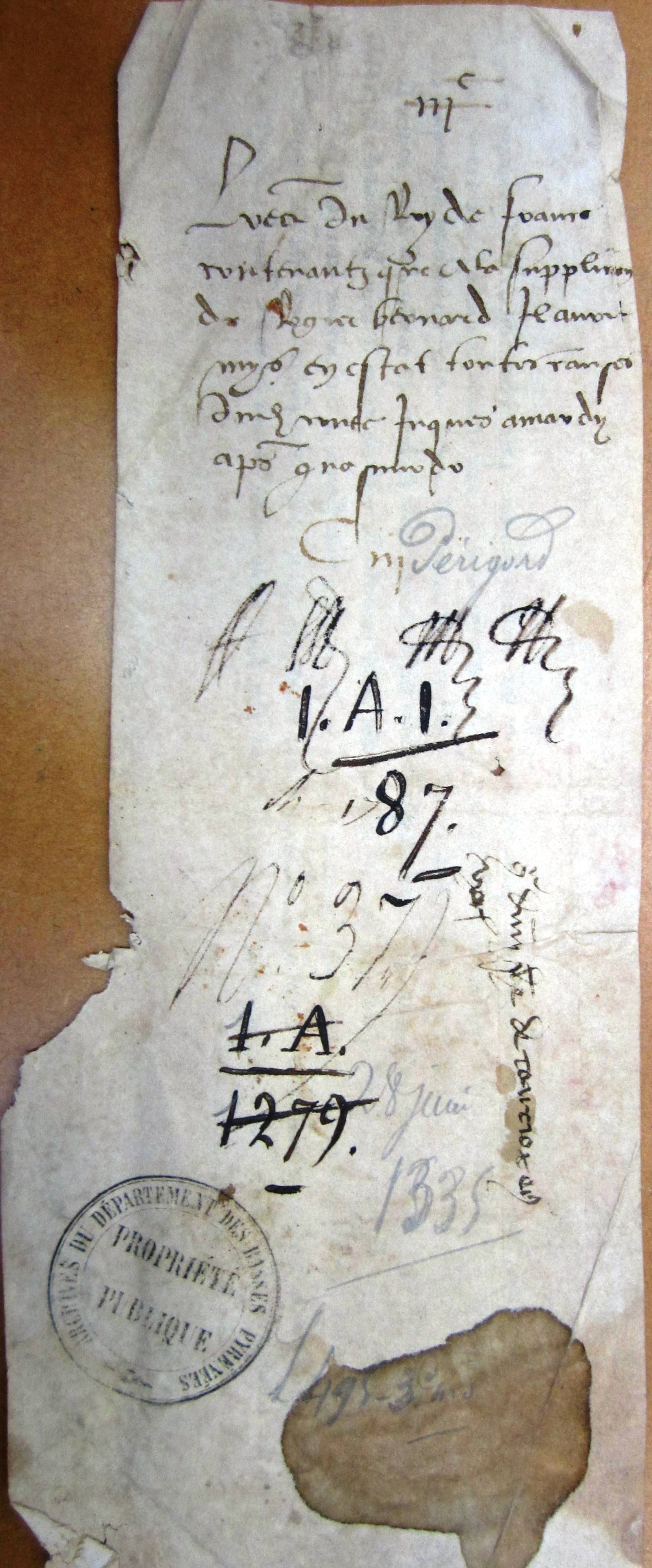- chapitre 17 (procès généraux du comté de Périgord, etc.), cotté n° 103 (inventaire de Jean Fabri - E 607, f° 247 r° & v°)