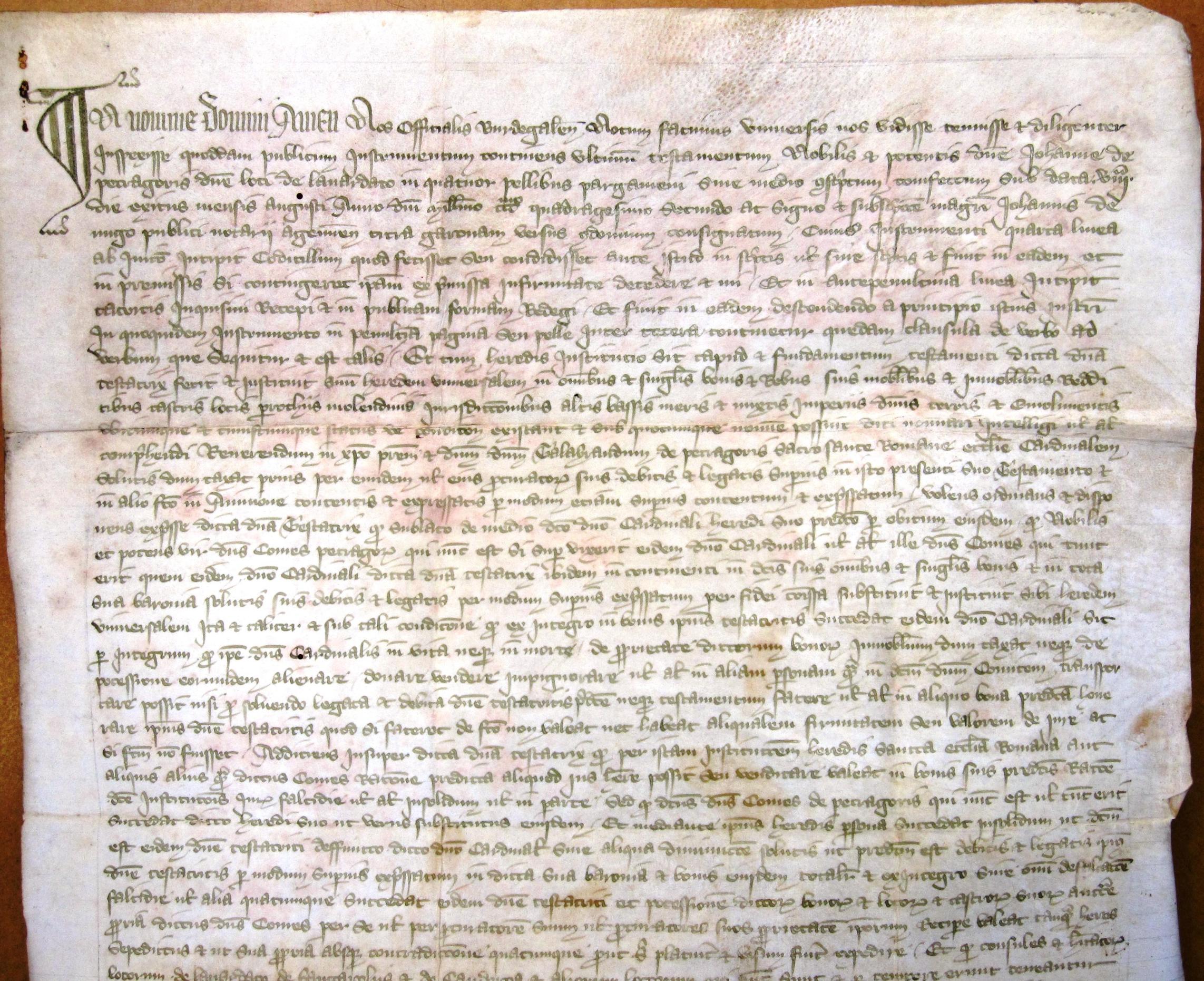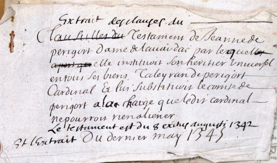 Vidimus du testament de Jeanne de Périgord, dame de Lavardac : elle institue pour son héritier universel le cardinal Talleyrand de Périgord et lui substitue Roger-Bernard, comte de Périgord