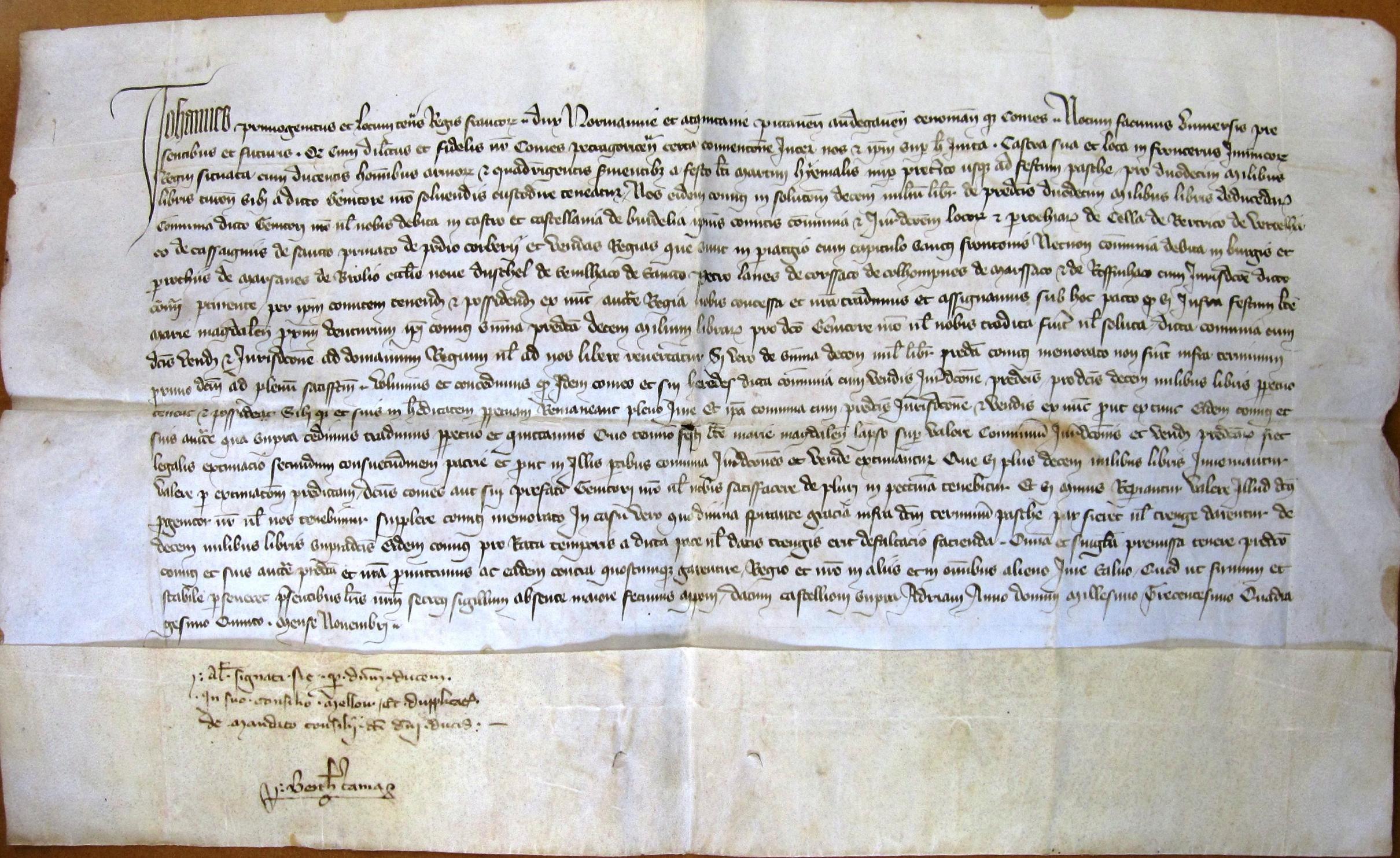 Accord entre Jean, duc de Normandie, et Roger-Bernard, comte de Périgord, touchant les gages qui étaient dus à ce dernier pour avoir servi le Roi de France avec 200 hommes d'armes et 400 fantassins ; une somme de 10.000 livres est assignée au comte de Périgord (nov. 1345).