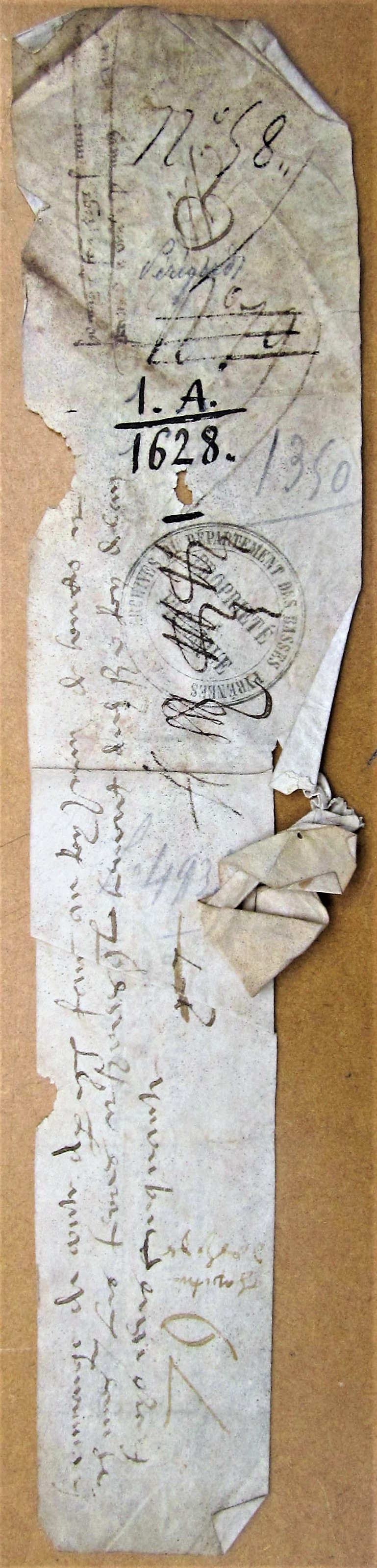 petite bande en parchemin de 4 doigts de large et d’un pied de long, d’où