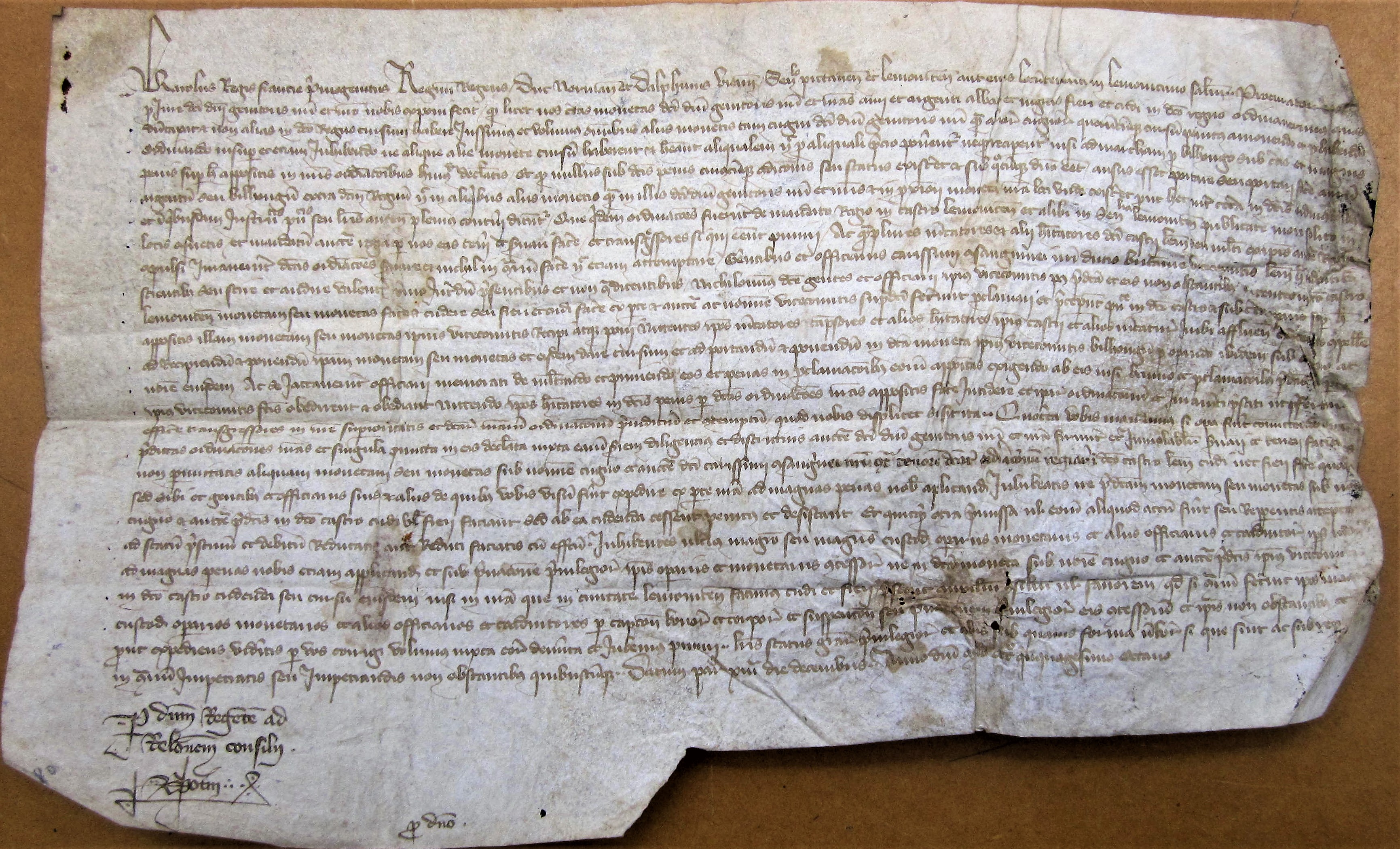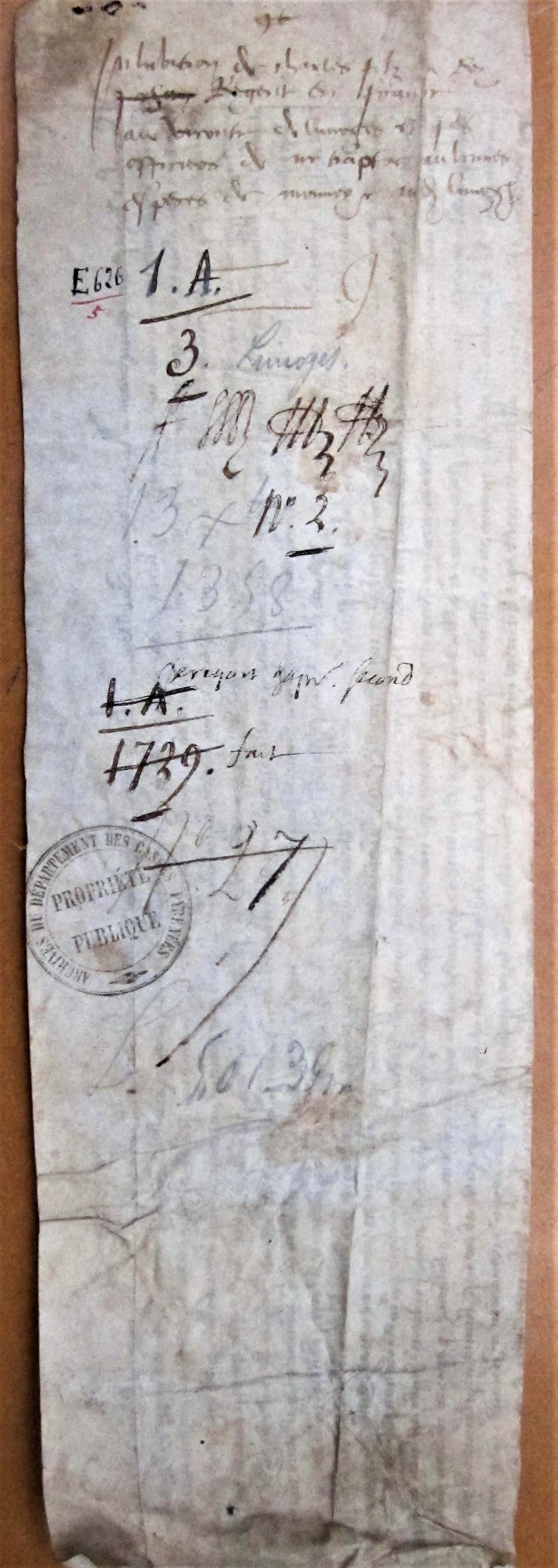 Karolus regis Franciae primogenitus regni regens dux Normanniae et delphinus Viennensis senescallo pictaviensi et lemovicensi aut ejus locumtenent. in Lemovicino salutem. Procurator noster pro jure dicti domini genitoris nostri et nostro nobis exponi fecit quod licet nos certas monetas dicti domini genitoris nostri et nostras auri et argenti albas et nigras fieri et cudi in dicto regno ordinaverimus quas dumtaxat et non alias in dicto regni cursum habere jussimus et voluimus, omnibus aliis monetis tam cugni dicti domini genitoris nostri quam aliorum cugnorum quorumcumque cursum penitus amovendo et prohibendo, ordinando in super et etiam inhibendo ne aliquae aliae monetae cursum haberent et habeant aliqualem nec pro aliquo pretion ponerentur neque reciperentur nisi ad marcham pro bilhongo sub certis et magnis poenis super his appositis in nostris ordinationibus hujusmodi declaratis et quod nullus sub dictis poenis cujuscumque conditionis seu status existeret et sub quocumque domino esset, ausus esset portare seu portari facere aurum argentum seu bilhongum extradictum regnum nec in aliquibus aliis monetis quam in illis dicti domini genitoris nostri et nostris et in proximiori moneta nostra loci unde existeret prout haec inter coetera in dictis ordinationibus et in quibusdam instrumentis publicis seu litteris authenticis plenius continetur dicuntur. Quae quidem ordinationes fuerunt de mandato regio in castro lemovicensi et alibi in senescallia lemovicensi publicata more solito in locis consuetis et mandatum auctoritate regia per nos eas teneri et observari facere et transgressores, si qui essent puniri ac quam plures mercatores et alii habitatores dicti castri lemovicensis seu multi ex ipsis auctoritate regia compulli juraverunt dictas ordinationes servare et nichil in contrarium facere [plusieurs mots rayés] nec etiam attemptare, gentibus et officiariis carissimi consanguinei nostri ducis Britanniae vicecomitis lemovicensis hoc videntibus scientibus seu scire et audire valentibus, ymmo inter dum praesentibus et non contradicentibus nichilominus dictae gentes et officiarii ipsius vice comitis post predictam et eis non obstantibus. Nitentes in dicto castro lemovicensi monetam seu monetas facere et cudere seu fieri et cudi facere ex parte et auctoritate ac nomine vicecomitis supradicti fecerunt proclamari et praeceperunt publice in dicto castro et sub certis poenis super hoc appositis illam monetam seu monetas ipsius vicecomitis recepi atque poni, nitentes ipsos mercatores campsores et alios habitatores ipsius castri et alios mercatur. Inibi affluentes exercentes compellere ad recipiendum et ponendum ipsam monetam seu monetas et eisdem dare cursum et ad portandum et ponendum indicta moneta ipsius vicecomitis bilhongum pro operando ibidem sub cugno ac nomine ejusdem. Ac se jactaverunt officiarii memorati de muletando et puniendo eos et poenas in proclamationibus eorum appositas exigendo ab eis nisi banno et proclamationibus praedictis ex parte ipsius vicecomitis factis obedirent et obediant, nitendo ipsos habitatores in dictis poenis per dictas ordinationes nostras appositis facere incidere et ipsorum ordinationum et juramenti praestiti ut praefertur, efficere transgressores in nostrae superiotatis et dictarum nostrarum ordinationum praejudicium et contemptum, quod nobis displicet, si sit ita .. quo circa vobis mandamus, si opus fuerit committendo quas praedictas nostras ordinationes nostras et et singula puncta in eis declarata juxta earum seriam diligentius et districtius auctoritate dicti domini genitoris nostri et nostra firmiter et inviolabiliter servari et teneri facientes non permittatis aliquam monetam seu monetas sub nomine, cugno et autoritate dicti carissimi consanguinei nostri, contra tenorem dictarum ordinationum regiarum, in dicto castro lemovicensi cudi seu fieri facere quoquomodo, sed sibi et gentibus officiariis suis et aliis de quibus vobis visum fuerit, expedire, ex parte nostra ad magnas poenas nobis applicandas inhibeatis ne predictam monetam seu monetas sub nomine cugno et auctoritate praedictis in dicto castro cudi vel fieri faciant, sed ab ea cudenda cessent penitus et desistant. Et quicumque contra praemissa … vel eorum aliquod actum fuerit seu reperietis attentare, ad statum pristinum et debitum reducatis, aut reduci faciatis cum effectu, inhibentes ulterius magistro seu magistris, custodibus, operariis, monetariis et aliis officiariis et coadjutoribus ipsius monetae ad magnas poenas nobis etiam applicandas et sub privatione privilegiorum ipsis operariis et monetariis concessorum, ne in dicta moneta sub nomine, cugno et auctoritate praedictis ipsius vicecomitis in dicto castro cudenda seu cursu ejusdem nisi in nostra quae in civitate lemovicensi fecimus cudi et fieri praestant auxilium consilium vel favorem quod si contrarium fecerint ipsos magistros, custodes operiarios monetarios et alios officiarios et coadjutores per captionem bonorum et corporum et suspentionem seu privationem privilegiorum eis concessorum et ipsis non obstantibus et prout expediens videritis per vos corrigi volumus juxta eorum demerita et jubemus puniri, litteris status gratiarum privilegiorum et aliis sub quavis forma verborum si quae sint, ac sub receptione in contrarium impetratis seu impetrandis non obstantibus quibuscumque. Datum Paris. XII die decembris anno Domini millesimo CCC quinquagesimo octavo. Et plus bas, per dominum regentem ad relationem consilii. Potin etc. pro domino. Et pendoit un petit scel.