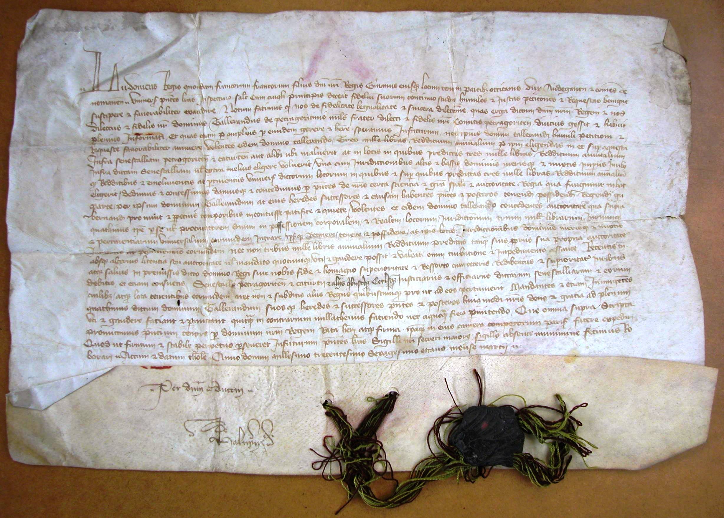 - document "cotté" n° 35 chapitre 9 (donations, transports, promesses, assignations de rente, gages, états et pensions) de l'inventaire de Jean Fabre en 1546 (registre E 607 des AD 64), avec le résumé suivant : "Lettres en parchemin signées et scellées par lesquelles Louis frère du roi et son lieutenant ès parties du Languedoc donna et assigna à Taleyrand comte de Périgord pour les bons et agréables services qu’il avait fait à la couronne à la réduction de Guyenne 3.000 livres de rente sur la conquête faite de la sénéchaussée de Périgord et Quercy. Données à Toulouse en mars 1368."
