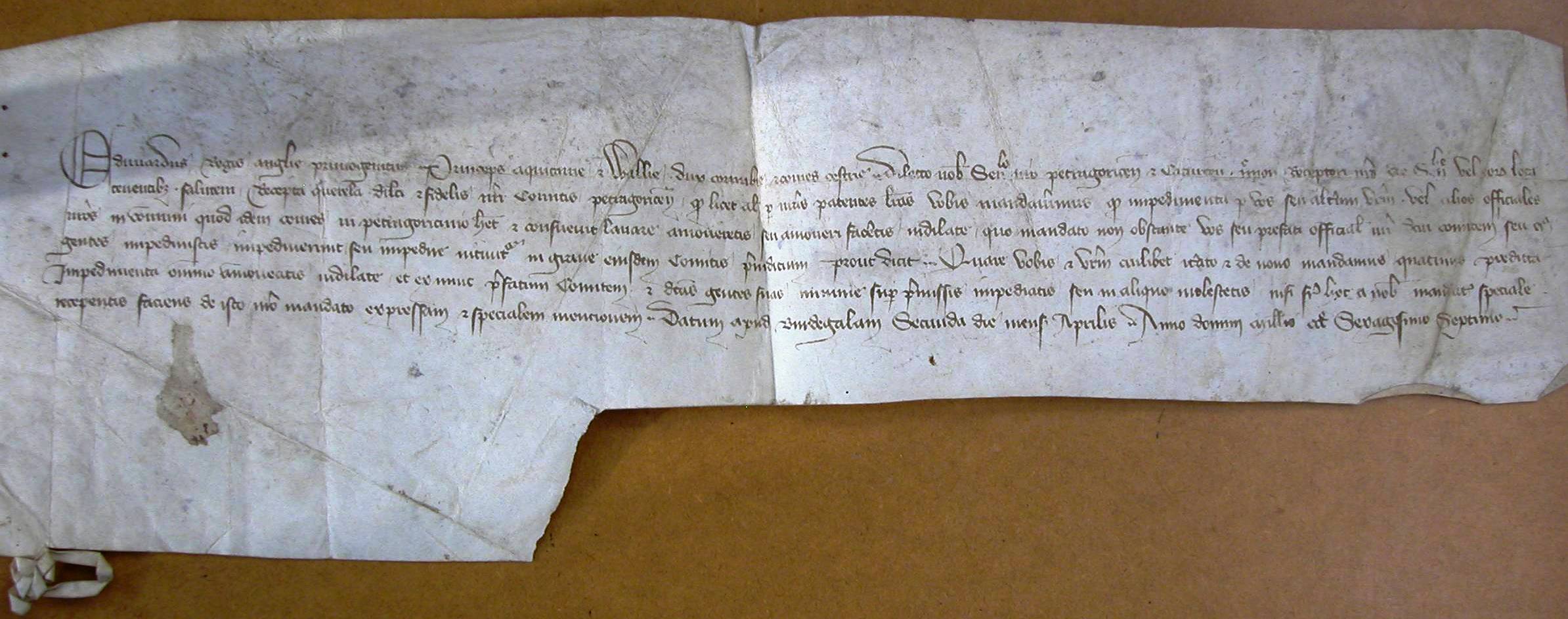 Edwardus regis Anglie primogenitus, princeps Aquitanie et Wallie, dux Cornubie & comes Cestrie, dilecto nobis senescallo nostro Petragoricensis et Caturcensis [------] (*) receptori nostro dicte senescallie vel nostris loca