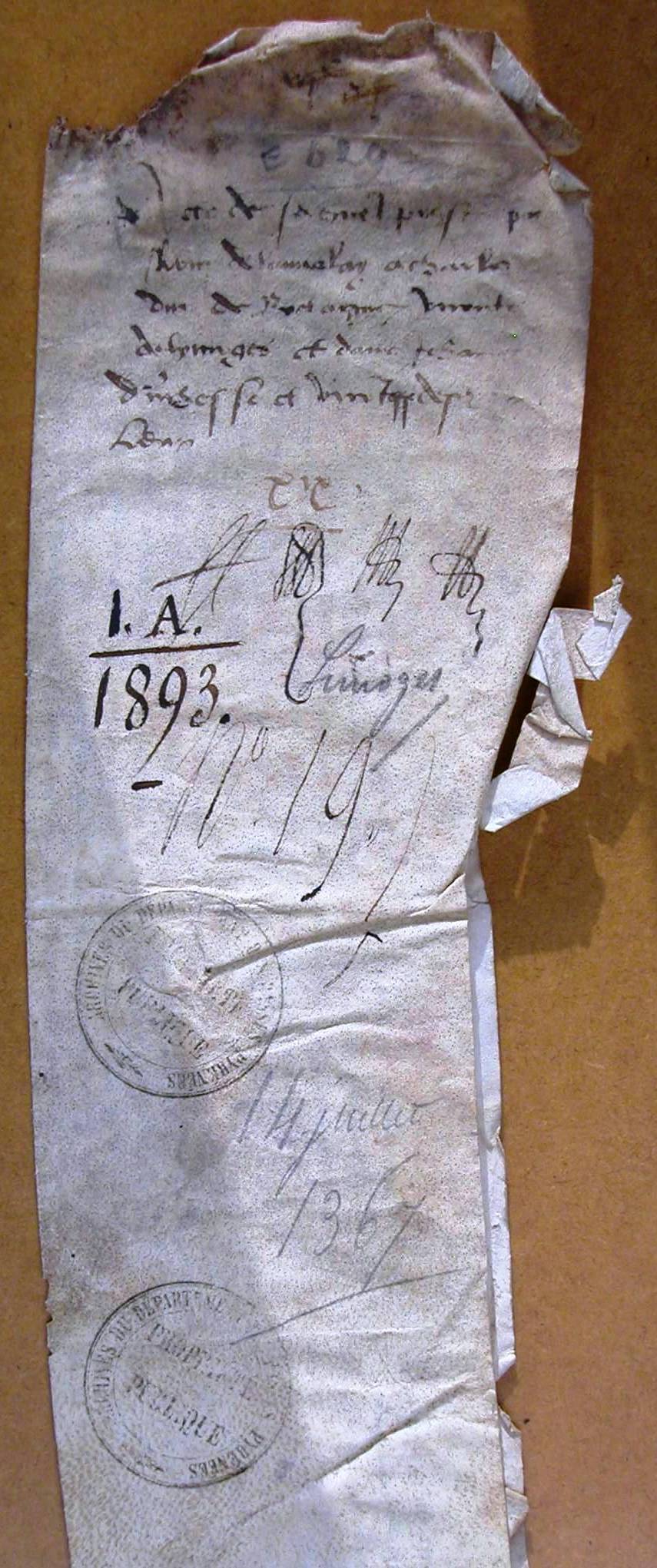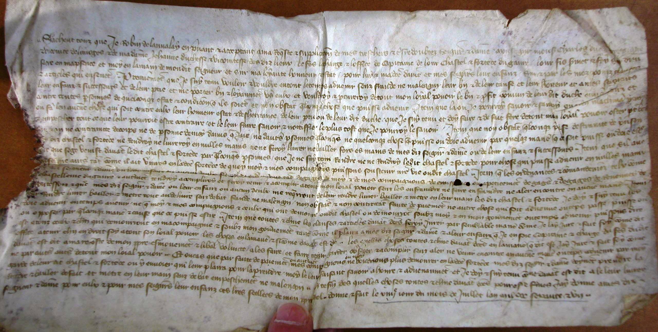 Serment de fidélité prêté à Charles, duc de Bretagne, vicomte de Limoges, par Robin de Lannalay, pour le château du Gavre (1367).