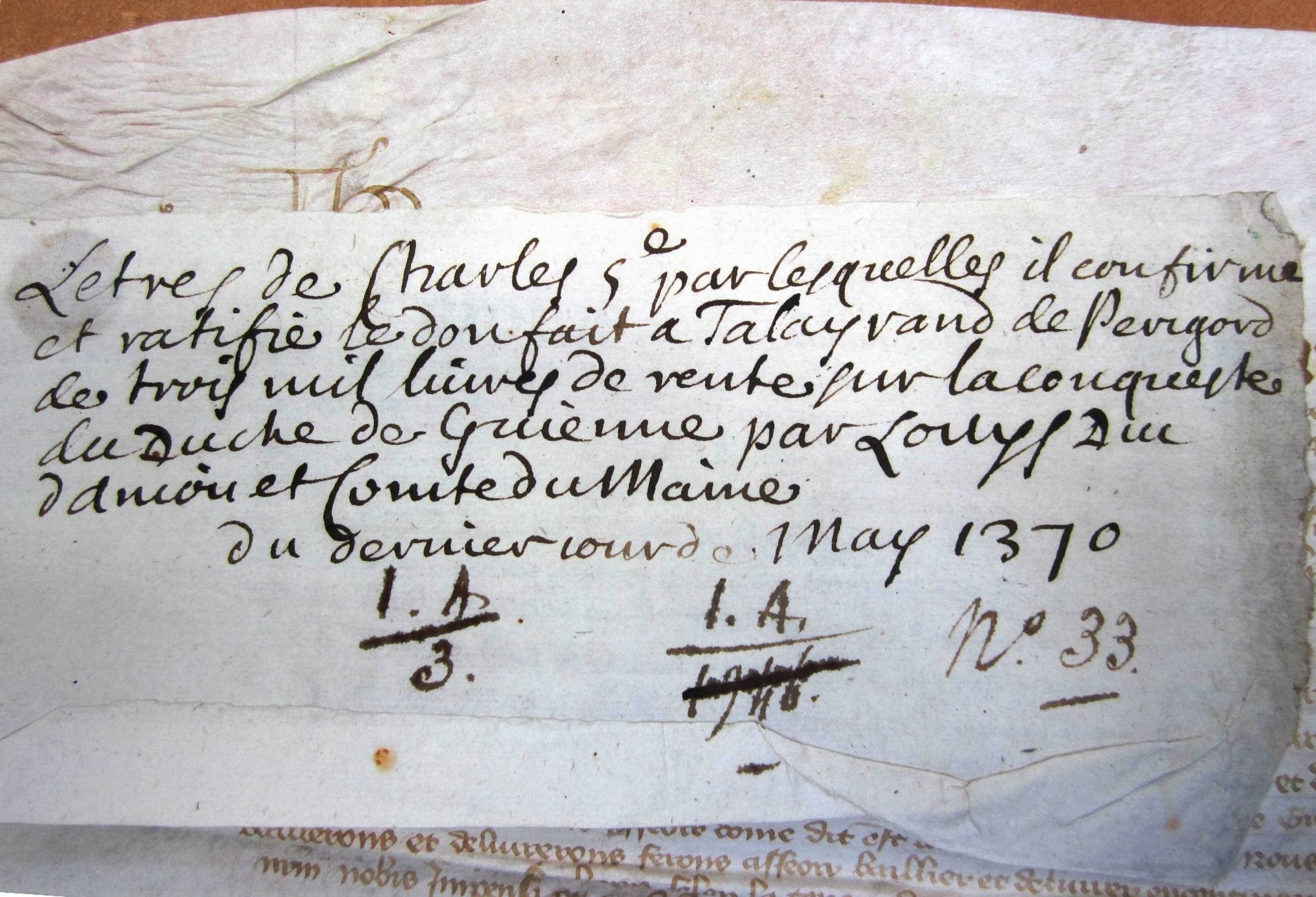 Ratification par Charles V de la donation de 3.000 livres de rente, faite par Louis, duc d'Anjou, son frère, à Talleyrand de Périgord, pour la conquête du Périgord et du Quercy.