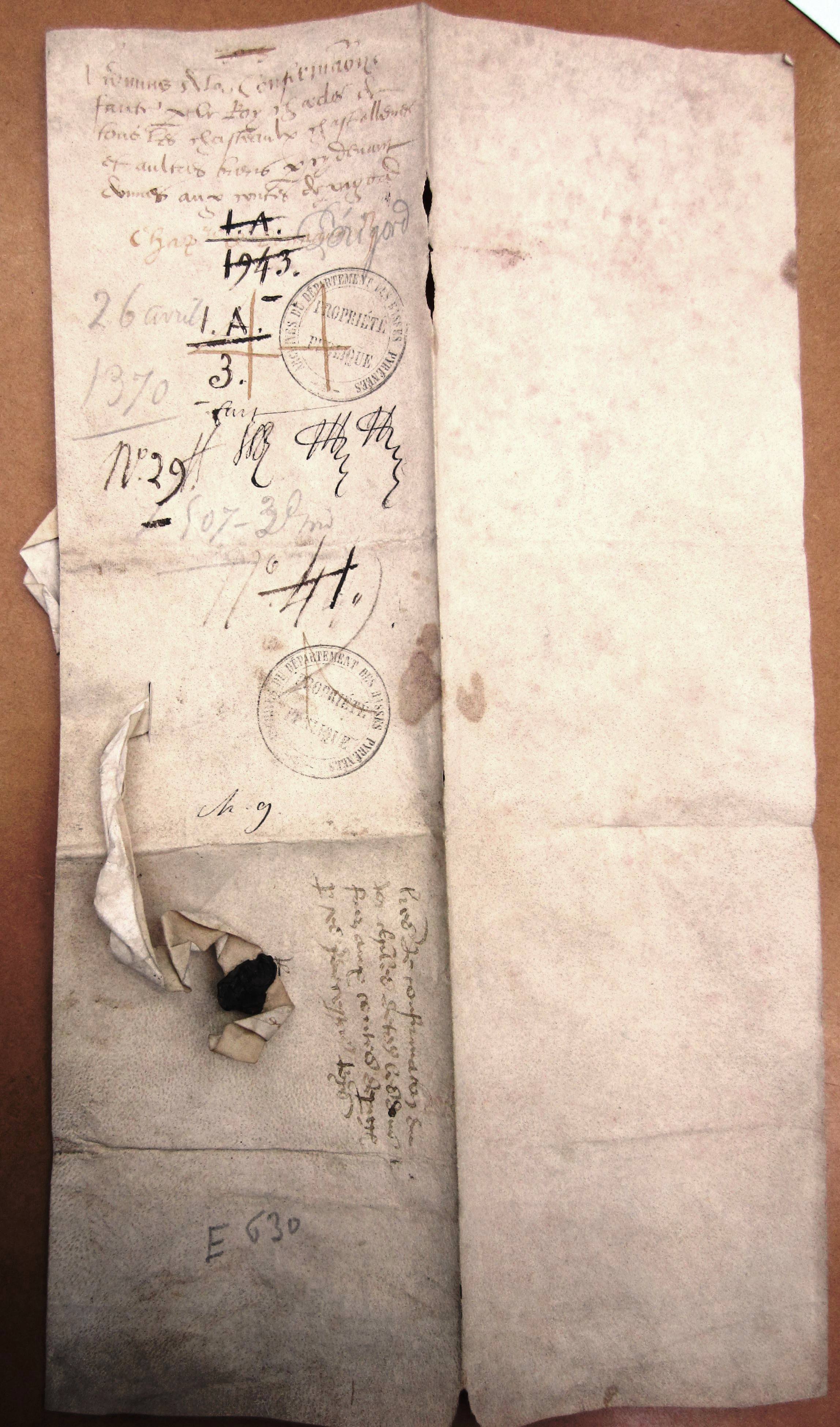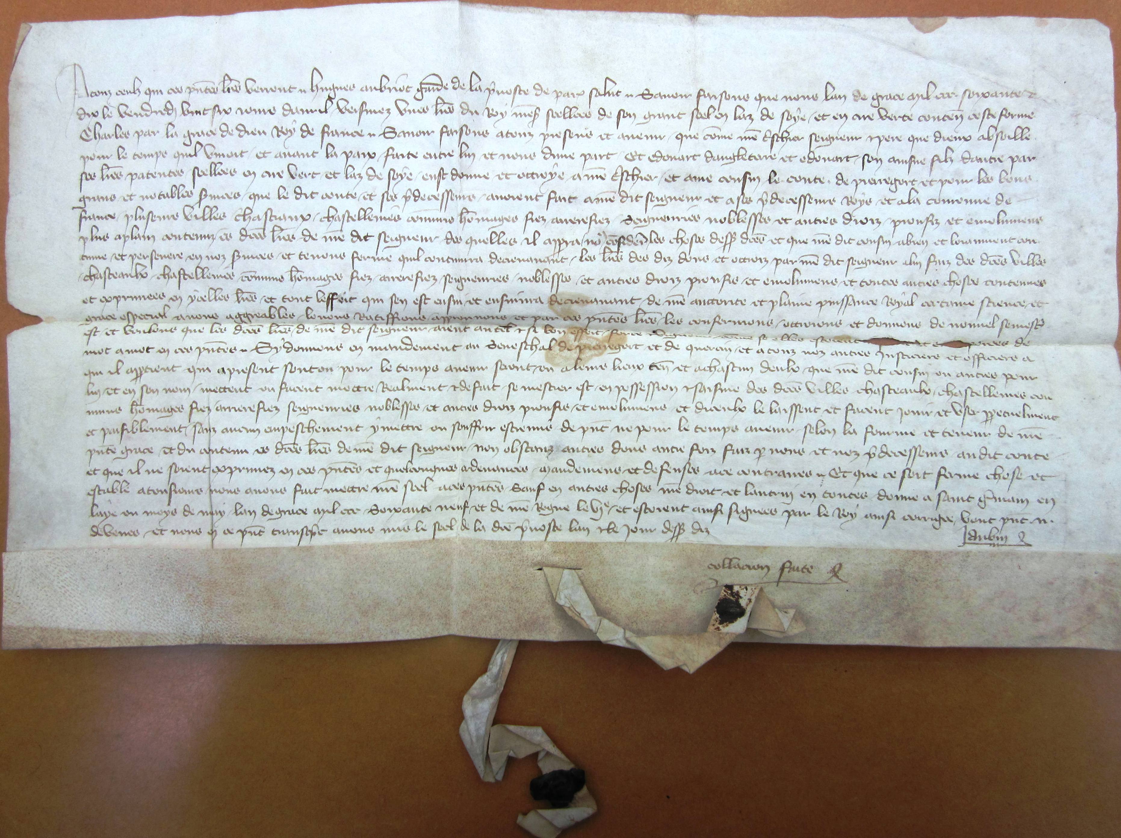 Lettres du roi Charles V par lesquelles il confirme au comte de Périgord, toutes les donations faites par le roi Jean son père, aux comtes ses prédécesseurs (mai 1369) (avec sceau).