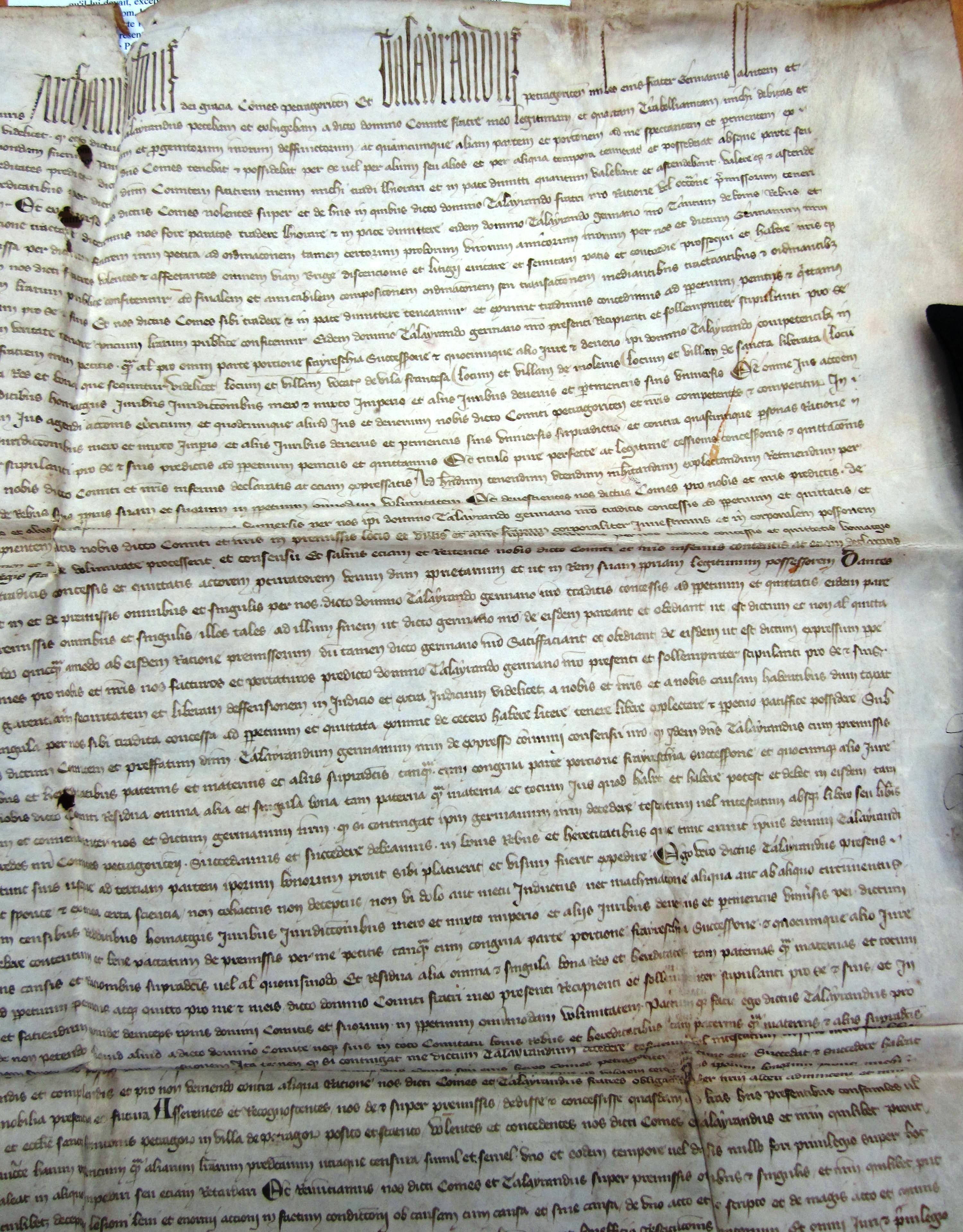 Accord entre le comte Archambaud IV et Talleyrand, son frère, au sujet des gages dus à ce dernier pour la garde des forteresses et de ses droits sur le comté de Périgord