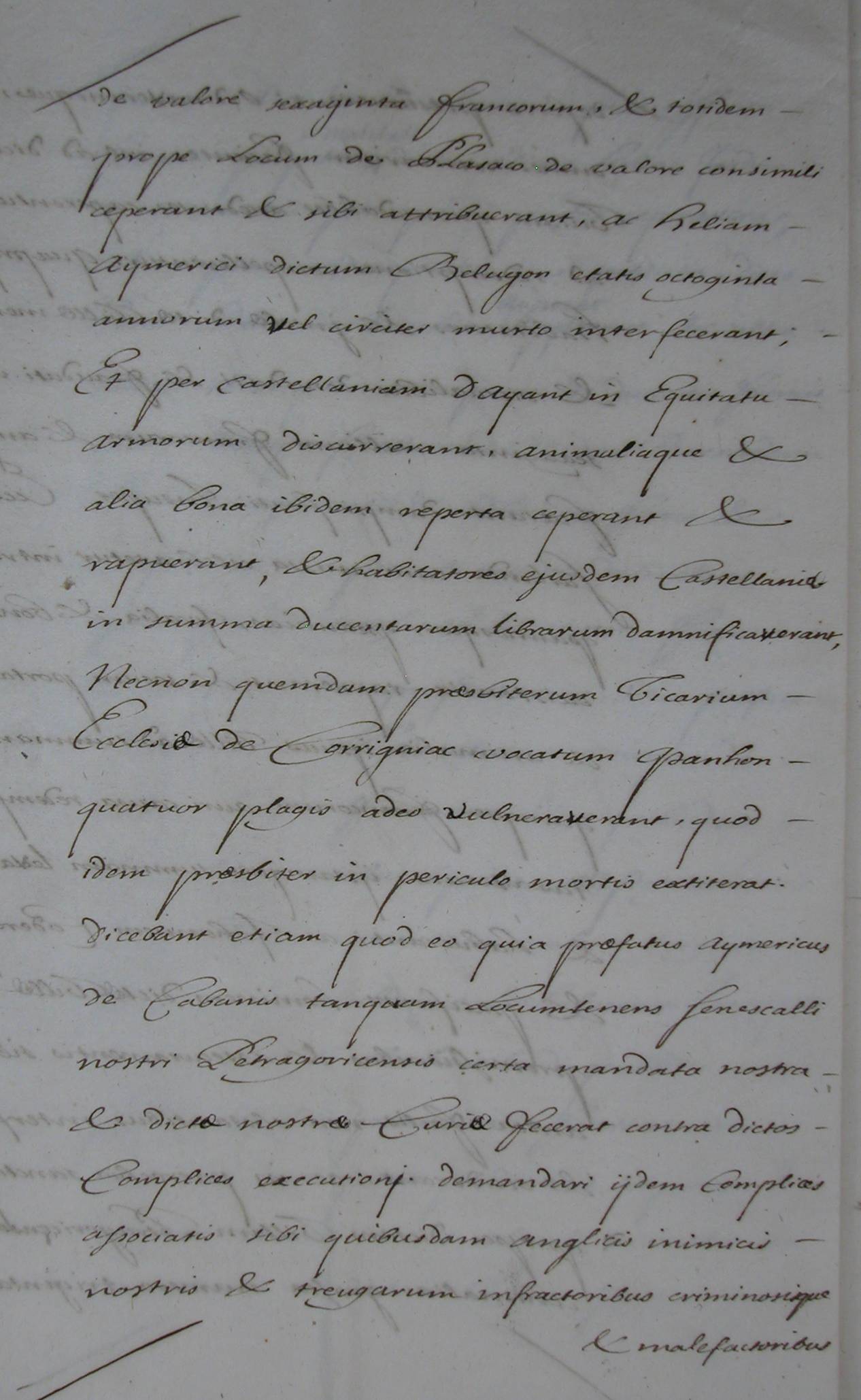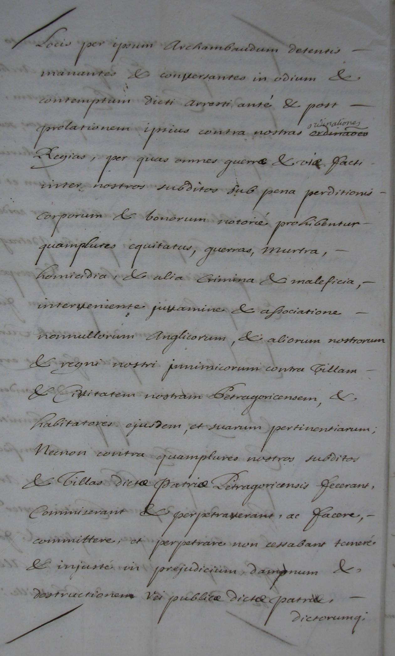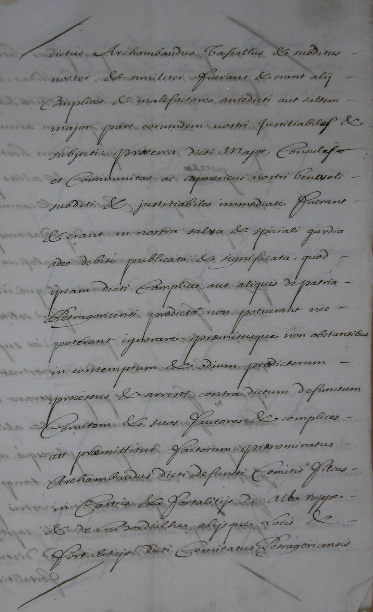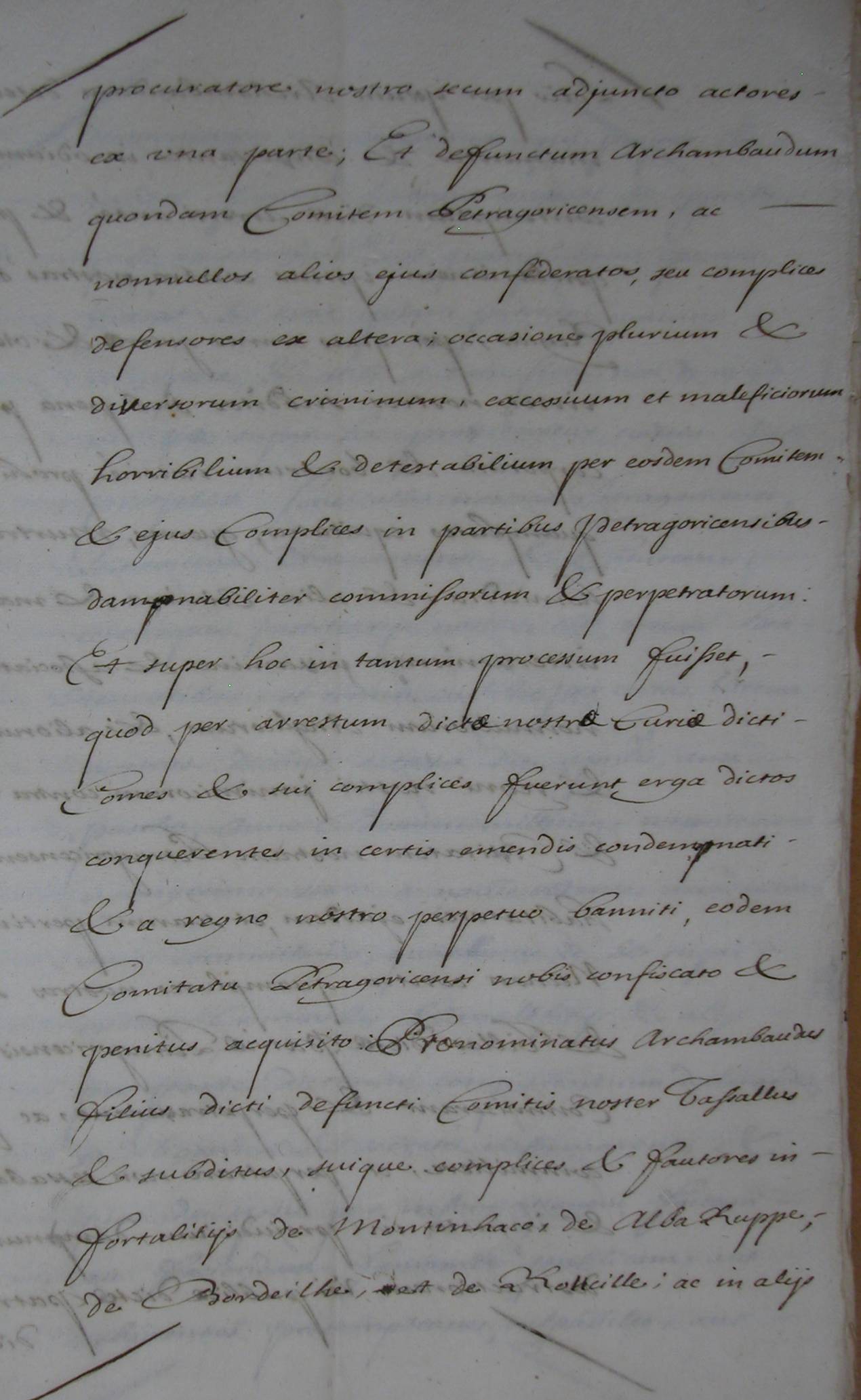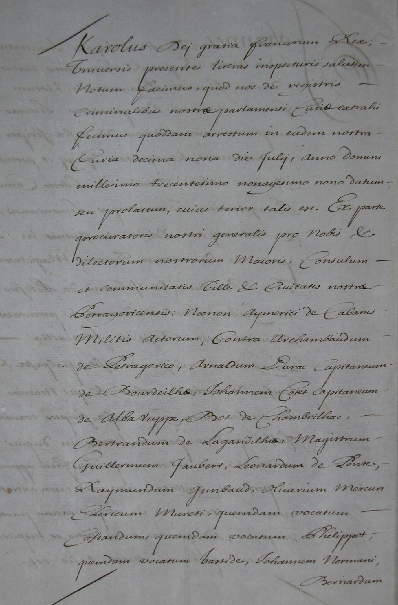 Johannes Tricardi in legibus licenciatus, et locum tenens natus domini senescalli Petragoricensis, notum facimus universis has presentes litteras inspecturis, nos hodierna die infrascripta ad instantiam et requestam egregii et potentis domini Alani, domini de Lebreto, comitis Petragoricensis, vicecomitisque Lemovicensis, et Tartasis, ac domini de Avenis in presentia discretorum virorum magistrorum Petri Baillivi, et Johannis de Pelisses in legibus licenciati advocati, et procuratoris domini nostri Regis in senescallia Petragoricensi vidisse, tenuisse, palpasse et legisse de verbo ad verbum et per notarios et scribas dictae curiae infra scriptos transcribi fecisse quasdam patentes litteras in duplici cauda et cera crocea, ut prima facie apparebat in pendenti sigillatas, non rasas, non viciatas, non cancellatas, nec in aliqua earum parte suspectas, sed prorsus omni vicio et suspicione carentes, quarum tenor talis est : Karolus Dei gratia Francorum Rex, universis presentes litteras inspecturis, salutem. Notum facimus, quod nos de registris criminalibus nostre parlamenti curie extrahi fecimus quoddam arrestum in eadem nostra curia decima nona die julii, anno Domini millesimo tricentesimo nonagesimo nono datum seu prolatum, cuius tenor talis est :ex parte procuratoris nostris generalis pro nobis et dilectorum nostrorum maioris, consulum et communitatis ville et civitatis nostre Petragoricensis : necnon Aymerici de Cabanis militis actorum, contra Archambaudum de Petragorico, Arnaldum Durac capitaneum de Bourdeilhe, Johannem Cotet capitaneum de Alba Ruppe, Bos de Chambrilhac, Bertrandum de Lagandilhie, magistrum Guillermum Jaubert, Leonardum de Ponte, Raymundum Gunbaud, Oliverium Mercuri clericum Mureti, quendam vocatum Cossandum, quendam vocatum Phelippot, quendam vocatum Bastide, Johannem Normani, Bernardum de Sancto Petro generem Bernardi de Massant, Thomelinum Delage, quemdam vocatum Verdoyce, quemdam vocatum Tire-Agulhete, Johannem Du Rat, Perrotum Marches, Vidalotum Marches, Alanum Marches, quemdam vocatum Colet, Bernardum de Massant, Maronem de Ferrezaco, quemdam vocatum Nucay, quemdam vocatum Ramonet, Mondonum Dale, Robinetum Legrasset, Bernardum de Massant, Maronem de Ferrezaco, quemdam vocatum Grungadie, quemdam vocatum Gironnet, Mondonum famulum clerici Mureti, quemdam vocatum Leboure de Sancto Petro, Johannem Barbe de Bone, quemdam vocatum Nandin, quemdam vocatum Lorans, Robinum Le Clergon, Bernardum de Morteriis, Johannem Damouretes, Guillermum Leblonde, quemdam vocatum Finet, Martinum Lespagnol, quemdam vocatum Guilhams, Johannem Gumel, Jacobum Balisterii, quemdam vocatum Guilhamin, Perrotum Escalle, Hennequinum A La Poulanie, Guilhotum Cournaguerre, Gailhardetum de Larcherie, Menautonum de Ponte, Guillermum et Rampicoulz de Villeboys, Mondonum Francisci, Johannem Normani, Johannem de Labernardie, quemdam vocatum Le Camus, Johannem Balisterii, quemdam vocatum Maudicot, Johannem Morelli, Johannem de Sancta Fide, quemdam vocatum Denis, Perrotum Britonis, Andoynetum capitaneum de Fossamaigne, et Martialem Balisterii complices et malefactores in hac parte, fuit in nostra parlamenti curia in ipsorum complicium abtencia propositum nobis alias pro parte dictorum maioris, consulum et communitatis expositum fuisse graviter conquerendo, quod cum certus processus alias motus fuisset et penderet in eadem nostra curia inter ipsos conquerentes dicto procuratore nostro secum adjuncto actores ex una parte; et defunctum Archambaudum quondam comitem Petragoricensem, ac nonnullos alios ejus confederatos seu complices defensores ex altera, occasione plurium et diversorum criminum, excessuum et maleficiorum horribilium et detestabilium per eosdem Comitem et ejus complices in partibus Petragoricensibus dampnabiliter commisorum et perpetratorum.Et super hoc in tantum processum fuisset, quod per arrestum dicte nostre curie dicti Comes et sui complices fuerunt erga dictos conquerentes in certis emendis condempnati et a regno nostro perpetuo banniti, eodem comitatu Petragoricensi nobis confiscato et penitus acquisito, prenominatus Archambaudus filius dicti defuncti comitis noster vassalus et subditus, suique complices et fautores in fortaliciis de Montinhaco, de Alba Ruppe, de Bordeilhe, et de Roucille, ac in aliis locis per ipsum Archambaudum detentis manantes et conversantes in odium et contemptum dicti arresti ante et post prolationem ipsius contra nostras ordinationes regias, per quas omnes guerre et vie facti inter nostros subditos sub pena perditionis corporum et bonorum notorie prohibentur quamplures equitatus, guerras, murtra, homicidia, et alia crimina et maleficia, interveniente juvamine et associatione nonnullorum anglicorum, et aliorum nostrorum et regni nostri innimicorum contra villam et civitatem nostram Petragoricensem, et habitatores ejusdem, et suarum pertinentiarum, necnon contra quamplures nostros subditos et villas dicte patrie Petragoricensis fecerant, commiserant et perpetuaverant, ac facere, comittere et perpetrare non cessabant temere et injuste in prejudicium, dampnum et destructionem rei publice dicte patrie, dictorumque conquerentium, qui propter hoc taliter fuerant et erant gravati et oppressi, quod necessarium sibi aut quamplurimis ipsorum fuerat et erat ipsam patriam omnino relinquere, et alibi se transferre, nisi de remedio iustitie super hoc provideretur eisdem. Quapropter senescallis nostris Petragoricensi, Lemovicensi, Xantonensi et Caturcensi, ceterisque justiciariis nostris, aut eorum locatenentibus, et eorum cuilibet per certas litteras nostras decima octava die aprilis ante Pascha, anno Domini millesimo trecentesimo nonagesimo sexto a nobis obtentas mandaveramus committendo, quathenus de et super eisdem criminibus et maleficiis, et aliis pro parte dictorum conquerentium declarandis, se diliginter et secrete informarent, et quos de ipsis per informationem factam seu faciendam, famam vel publicam, aut vehementes presumptiones, culpabiles, aut suspectos invenirent, ubicu