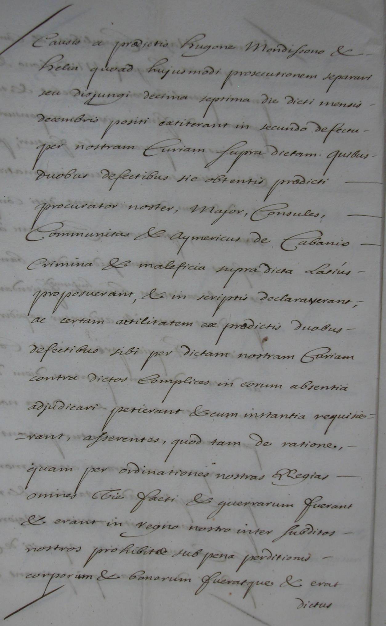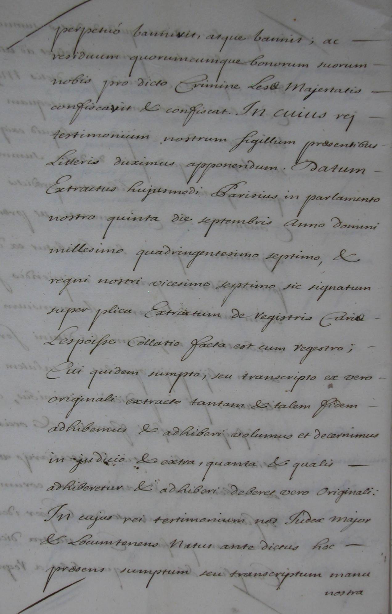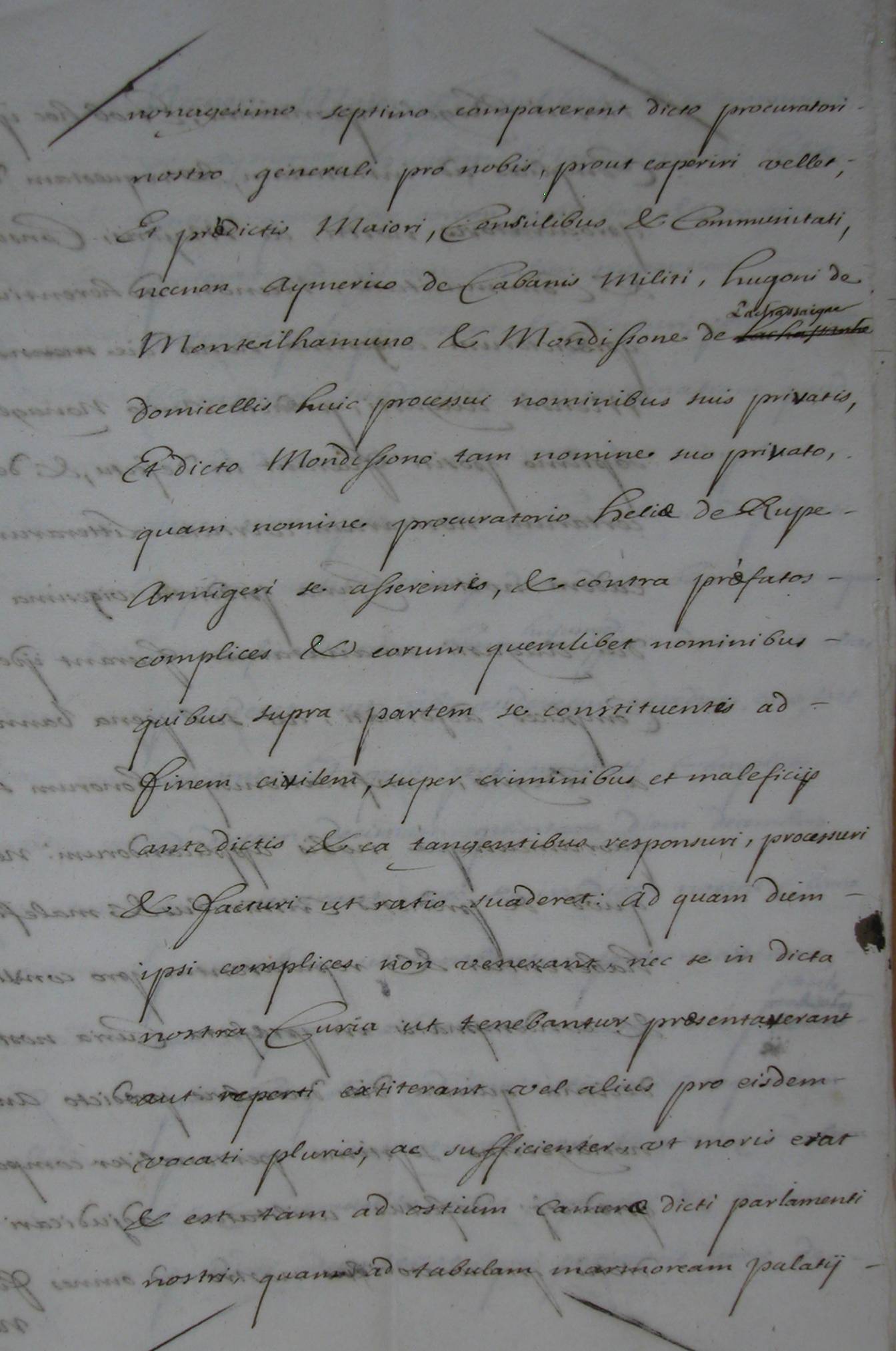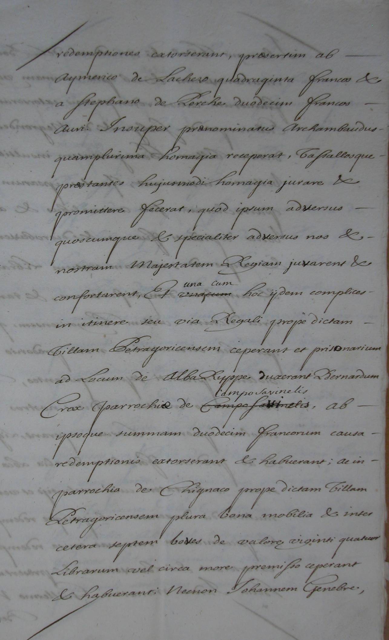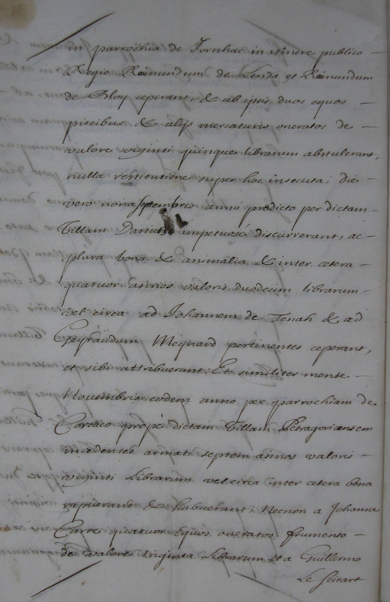 Johannes Tricardi in legibus licenciatus, et locum tenens natus domini senescalli Petragoricensis, notum facimus universis has presentes litteras inspecturis, nos hodierna die infrascripta ad instantiam et requestam egregii et potentis domini Alani, domini de Lebreto, comitis Petragoricensis, vicecomitisque Lemovicensis, et Tartasis, ac domini de Avenis in presentia discretorum virorum magistrorum Petri Baillivi, et Johannis de Pelisses in legibus licenciati advocati, et procuratoris domini nostri Regis in senescallia Petragoricensi vidisse, tenuisse, palpasse et legisse de verbo ad verbum et per notarios et scribas dictae curiae infra scriptos transcribi fecisse quasdam patentes litteras in duplici cauda et cera crocea, ut prima facie apparebat in pendenti sigillatas, non rasas, non viciatas, non cancellatas, nec in aliqua earum parte suspectas, sed prorsus omni vicio et suspicione carentes, quarum tenor talis est : Karolus Dei gratia Francorum Rex, universis presentes litteras inspecturis, salutem. Notum facimus, quod nos de registris criminalibus nostre parlamenti curie extrahi fecimus quoddam arrestum in eadem nostra curia decima nona die julii, anno Domini millesimo tricentesimo nonagesimo nono datum seu prolatum, cuius tenor talis est :ex parte procuratoris nostris generalis pro nobis et dilectorum nostrorum maioris, consulum et communitatis ville et civitatis nostre Petragoricensis : necnon Aymerici de Cabanis militis actorum, contra Archambaudum de Petragorico, Arnaldum Durac capitaneum de Bourdeilhe, Johannem Cotet capitaneum de Alba Ruppe, Bos de Chambrilhac, Bertrandum de Lagandilhie, magistrum Guillermum Jaubert, Leonardum de Ponte, Raymundum Gunbaud, Oliverium Mercuri clericum Mureti, quendam vocatum Cossandum, quendam vocatum Phelippot, quendam vocatum Bastide, Johannem Normani, Bernardum de Sancto Petro generem Bernardi de Massant, Thomelinum Delage, quemdam vocatum Verdoyce, quemdam vocatum Tire-Agulhete, Johannem Du Rat, Perrotum Marches, Vidalotum Marches, Alanum Marches, quemdam vocatum Colet, Bernardum de Massant, Maronem de Ferrezaco, quemdam vocatum Nucay, quemdam vocatum Ramonet, Mondonum Dale, Robinetum Legrasset, Bernardum de Massant, Maronem de Ferrezaco, quemdam vocatum Grungadie, quemdam vocatum Gironnet, Mondonum famulum clerici Mureti, quemdam vocatum Leboure de Sancto Petro, Johannem Barbe de Bone, quemdam vocatum Nandin, quemdam vocatum Lorans, Robinum Le Clergon, Bernardum de Morteriis, Johannem Damouretes, Guillermum Leblonde, quemdam vocatum Finet, Martinum Lespagnol, quemdam vocatum Guilhams, Johannem Gumel, Jacobum Balisterii, quemdam vocatum Guilhamin, Perrotum Escalle, Hennequinum A La Poulanie, Guilhotum Cournaguerre, Gailhardetum de Larcherie, Menautonum de Ponte, Guillermum et Rampicoulz de Villeboys, Mondonum Francisci, Johannem Normani, Johannem de Labernardie, quemdam vocatum Le Camus, Johannem Balisterii, quemdam vocatum Maudicot, Johannem Morelli, Johannem de Sancta Fide, quemdam vocatum Denis, Perrotum Britonis, Andoynetum capitaneum de Fossamaigne, et Martialem Balisterii complices et malefactores in hac parte, fuit in nostra parlamenti curia in ipsorum complicium abtencia propositum nobis alias pro parte dictorum maioris, consulum et communitatis expositum fuisse graviter conquerendo, quod cum certus processus alias motus fuisset et penderet in eadem nostra curia inter ipsos conquerentes dicto procuratore nostro secum adjuncto actores ex una parte; et defunctum Archambaudum quondam comitem Petragoricensem, ac nonnullos alios ejus confederatos seu complices defensores ex altera, occasione plurium et diversorum criminum, excessuum et maleficiorum horribilium et detestabilium per eosdem Comitem et ejus complices in partibus Petragoricensibus dampnabiliter commisorum et perpetratorum.Et super hoc in tantum processum fuisset, quod per arrestum dicte nostre curie dicti Comes et sui complices fuerunt erga dictos conquerentes in certis emendis condempnati et a regno nostro perpetuo banniti, eodem comitatu Petragoricensi nobis confiscato et penitus acquisito, prenominatus Archambaudus filius dicti defuncti comitis noster vassalus et subditus, suique complices et fautores in fortaliciis de Montinhaco, de Alba Ruppe, de Bordeilhe, et de Roucille, ac in aliis locis per ipsum Archambaudum detentis manantes et conversantes in odium et contemptum dicti arresti ante et post prolationem ipsius contra nostras ordinationes regias, per quas omnes guerre et vie facti inter nostros subditos sub pena perditionis corporum et bonorum notorie prohibentur quamplures equitatus, guerras, murtra, homicidia, et alia crimina et maleficia, interveniente juvamine et associatione nonnullorum anglicorum, et aliorum nostrorum et regni nostri innimicorum contra villam et civitatem nostram Petragoricensem, et habitatores ejusdem, et suarum pertinentiarum, necnon contra quamplures nostros subditos et villas dicte patrie Petragoricensis fecerant, commiserant et perpetuaverant, ac facere, comittere et perpetrare non cessabant temere et injuste in prejudicium, dampnum et destructionem rei publice dicte patrie, dictorumque conquerentium, qui propter hoc taliter fuerant et erant gravati et oppressi, quod necessarium sibi aut quamplurimis ipsorum fuerat et erat ipsam patriam omnino relinquere, et alibi se transferre, nisi de remedio iustitie super hoc provideretur eisdem. Quapropter senescallis nostris Petragoricensi, Lemovicensi, Xantonensi et Caturcensi, ceterisque justiciariis nostris, aut eorum locatenentibus, et eorum cuilibet per certas litteras nostras decima octava die aprilis ante Pascha, anno Domini millesimo trecentesimo nonagesimo sexto a nobis obtentas mandaveramus committendo, quathenus de et super eisdem criminibus et maleficiis, et aliis pro parte dictorum conquerentium declarandis, se diliginter et secrete informarent, et quos de ipsis per informationem factam seu faciendam, famam vel publicam, aut vehementes presumptiones, culpabiles, aut suspectos invenirent, ubicu
