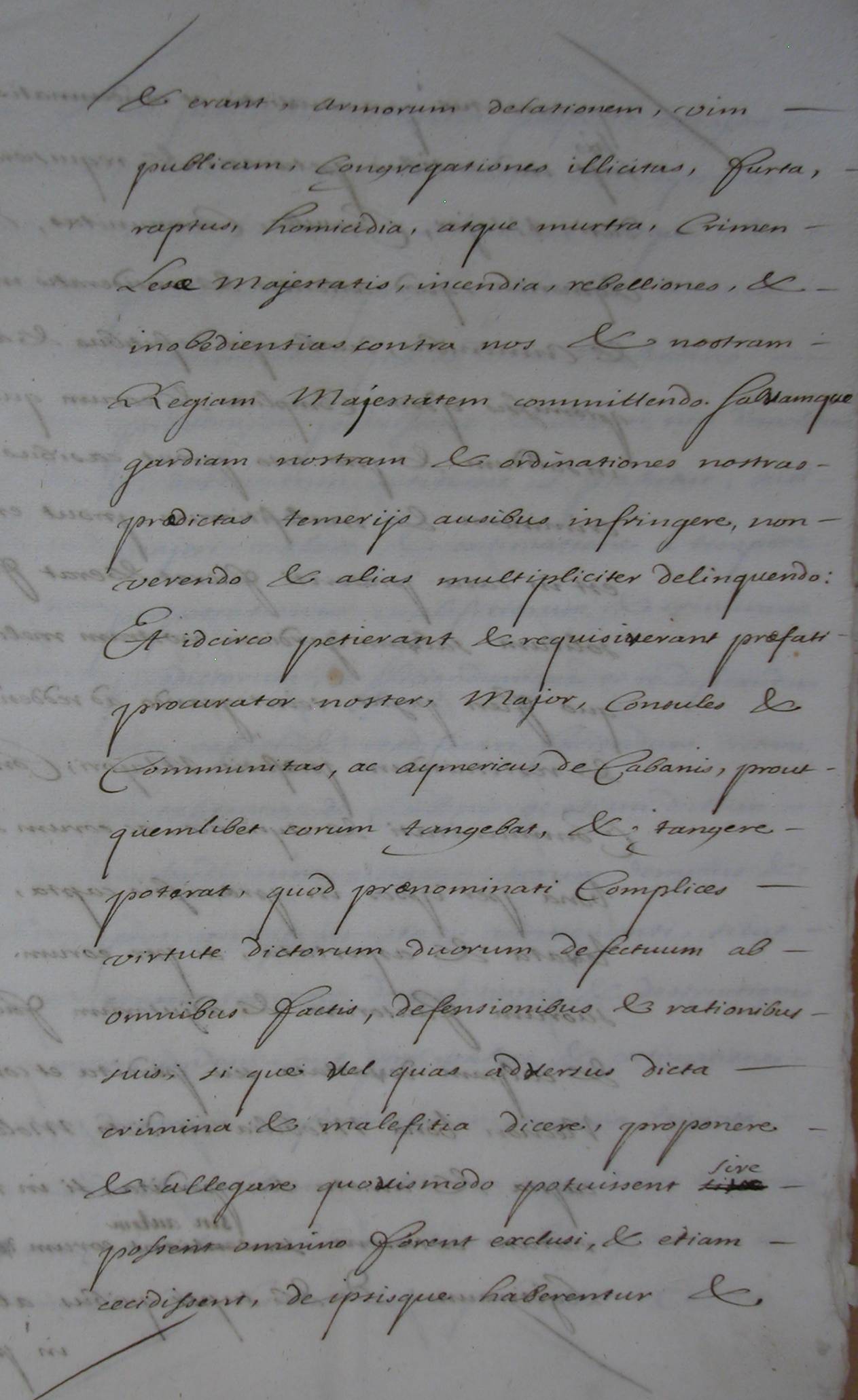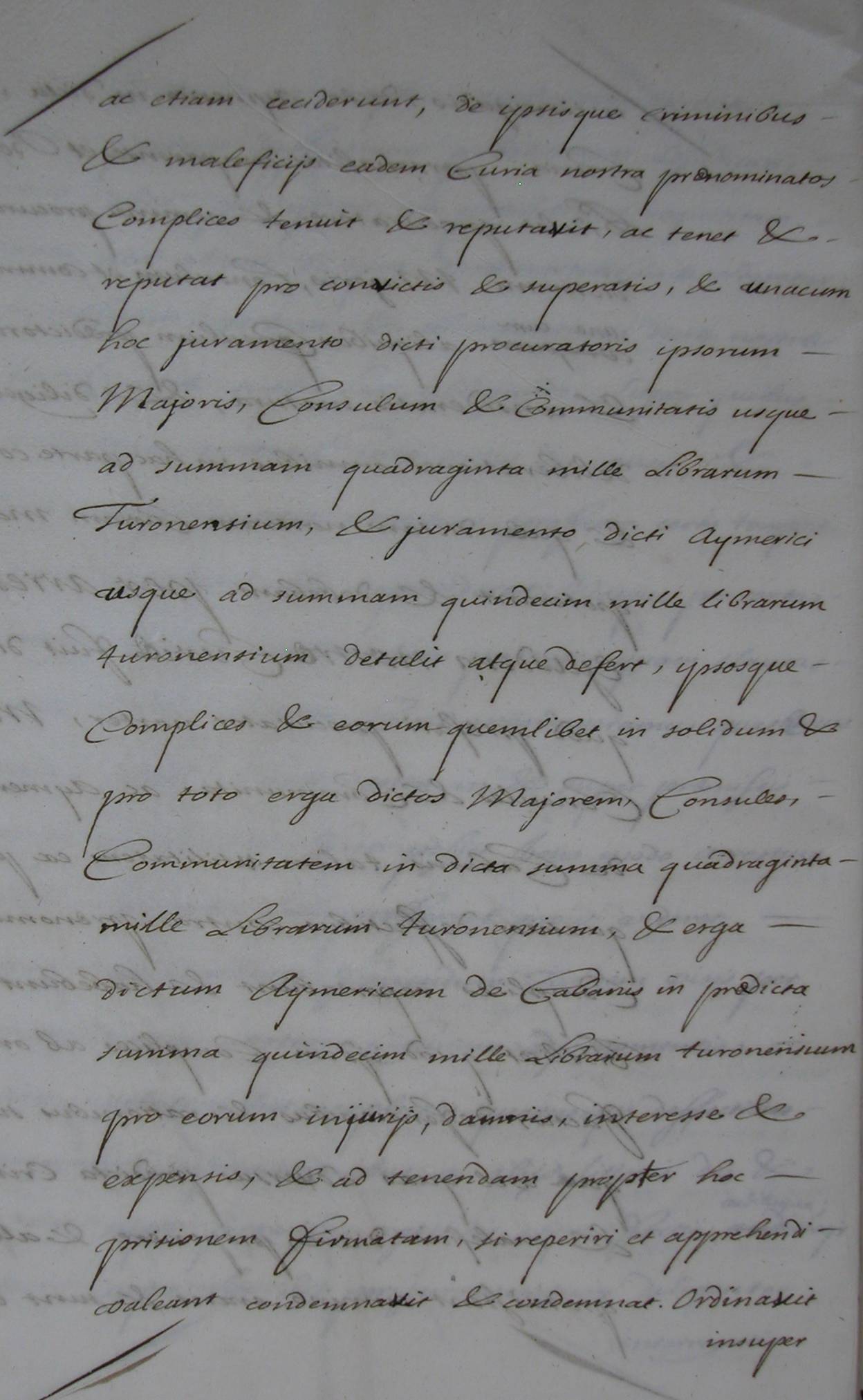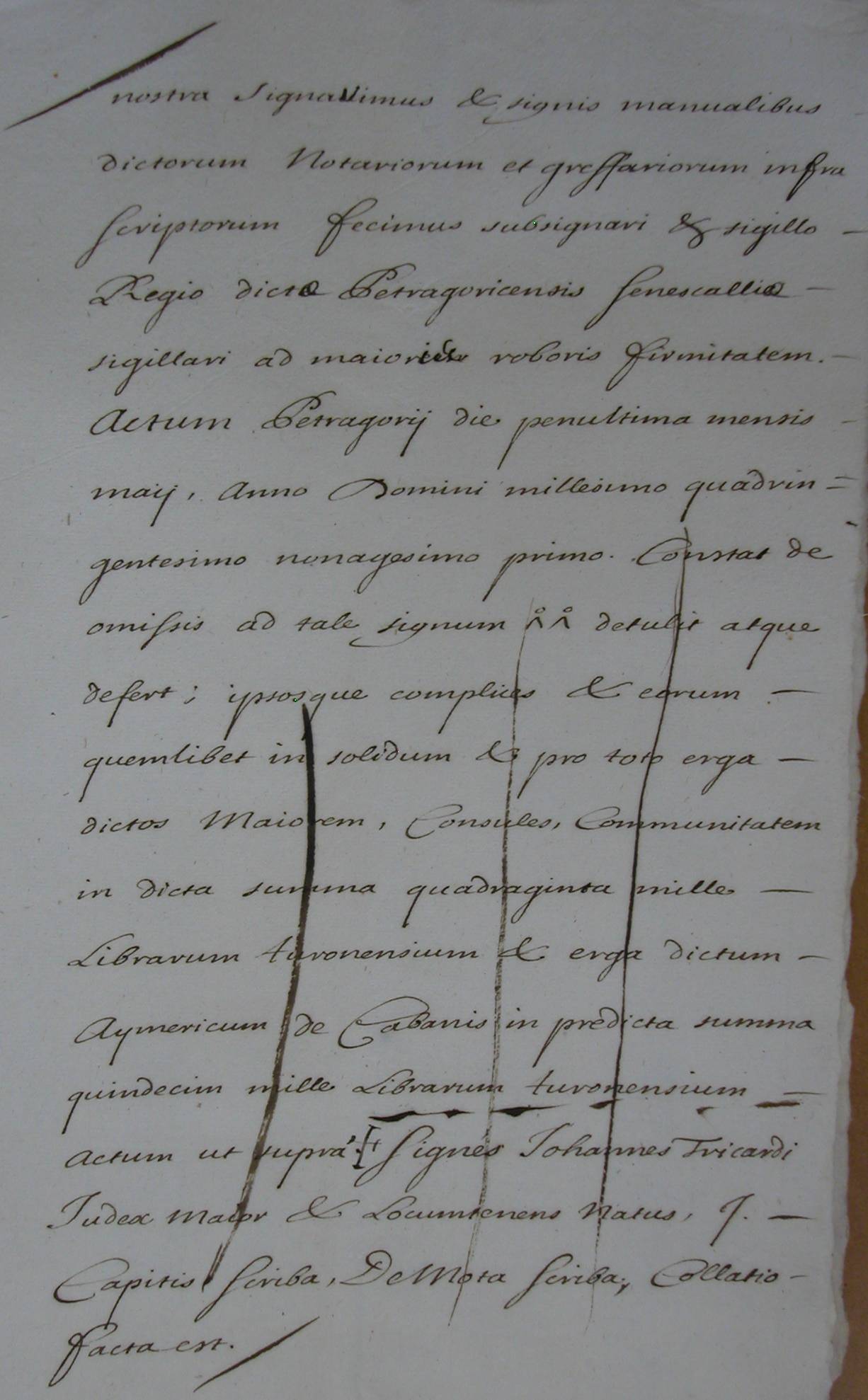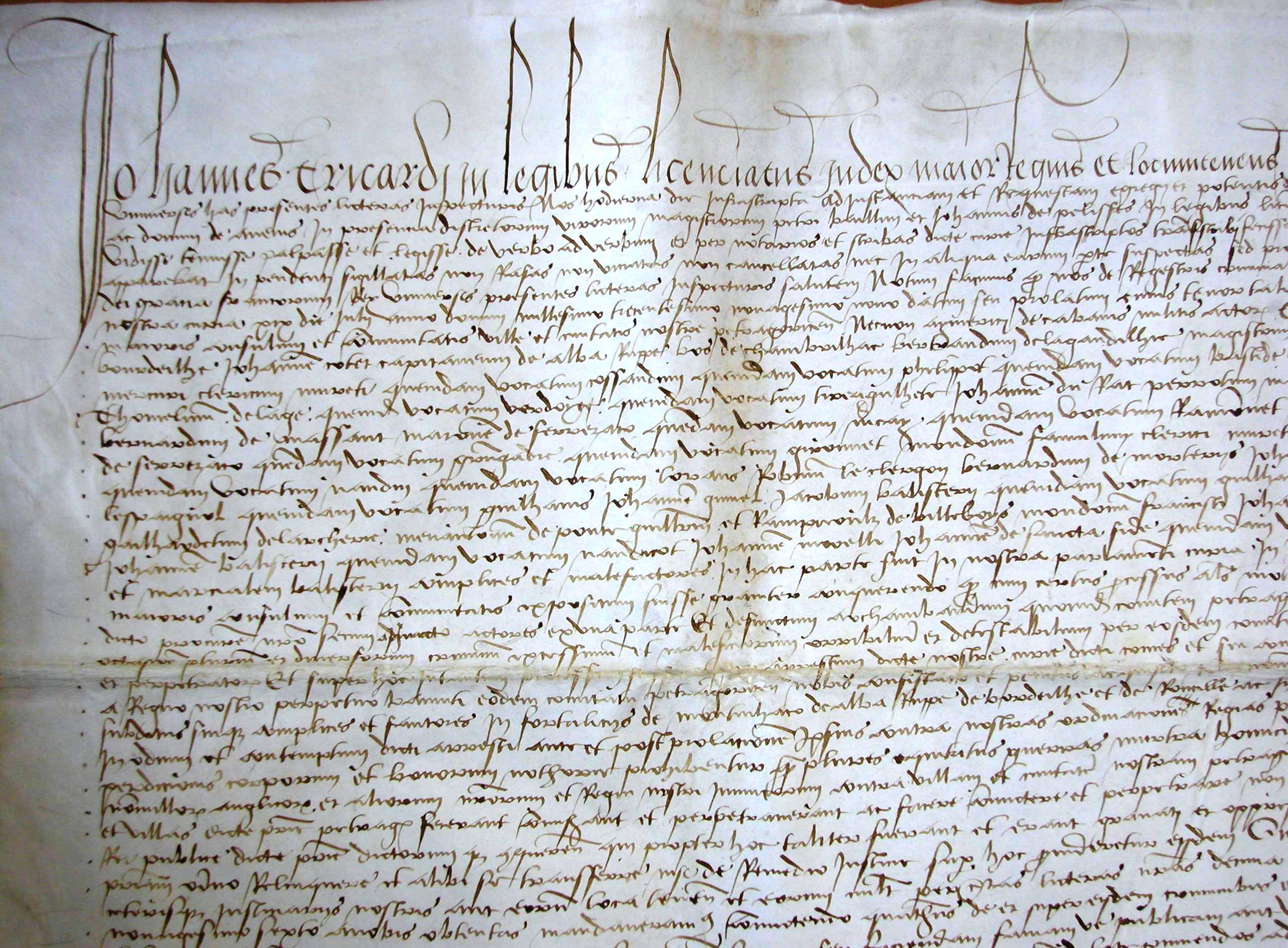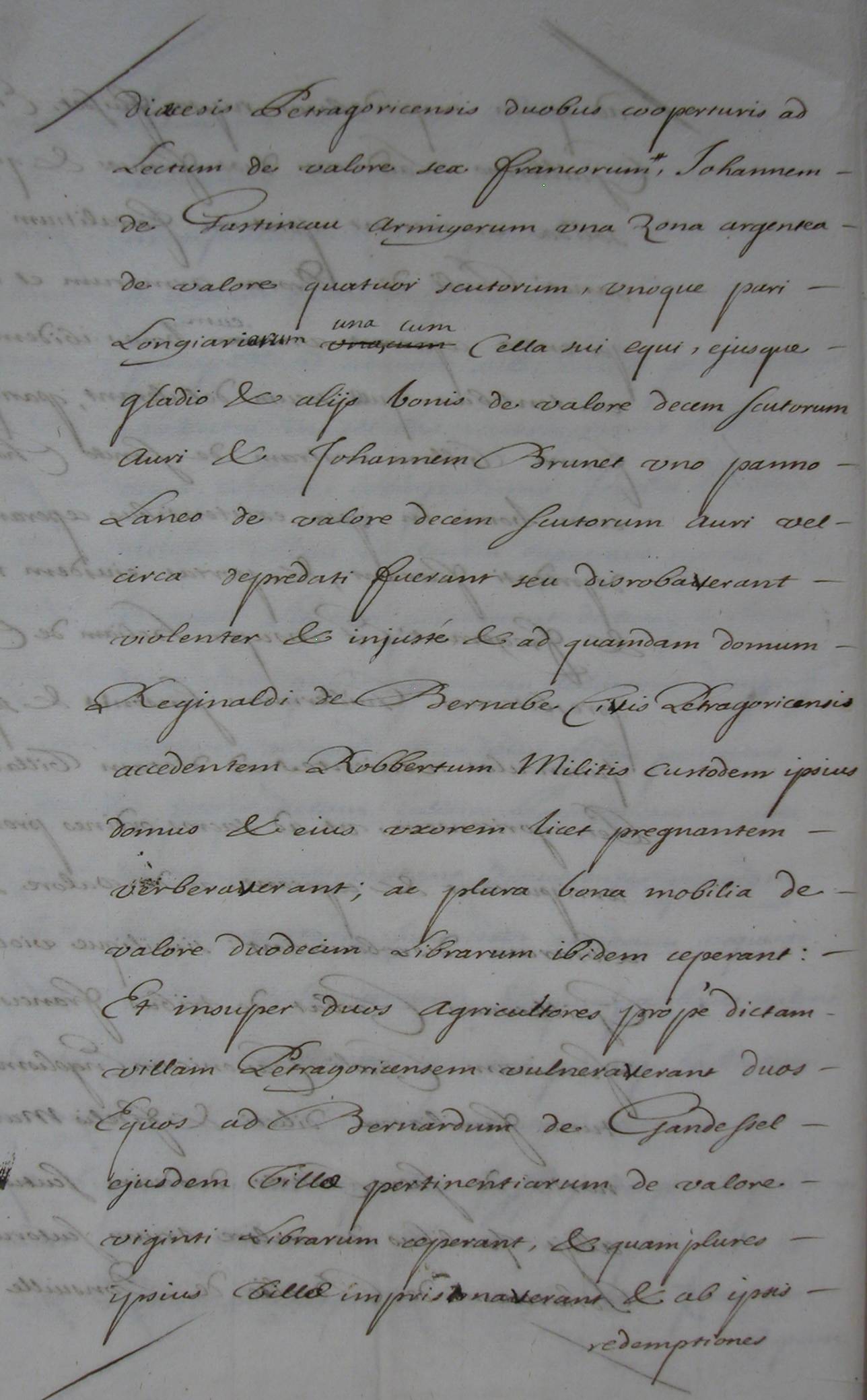 Johannes Tricardi in legibus licenciatus, et locum tenens natus domini senescalli Petragoricensis, notum facimus universis has presentes litteras inspecturis, nos hodierna die infrascripta ad instantiam et requestam egregii et potentis domini Alani, domini de Lebreto, comitis Petragoricensis, vicecomitisque Lemovicensis, et Tartasis, ac domini de Avenis in presentia discretorum virorum magistrorum Petri Baillivi, et Johannis de Pelisses in legibus licenciati advocati, et procuratoris domini nostri Regis in senescallia Petragoricensi vidisse, tenuisse, palpasse et legisse de verbo ad verbum et per notarios et scribas dictae curiae infra scriptos transcribi fecisse quasdam patentes litteras in duplici cauda et cera crocea, ut prima facie apparebat in pendenti sigillatas, non rasas, non viciatas, non cancellatas, nec in aliqua earum parte suspectas, sed prorsus omni vicio et suspicione carentes, quarum tenor talis est : Karolus Dei gratia Francorum Rex, universis presentes litteras inspecturis, salutem. Notum facimus, quod nos de registris criminalibus nostre parlamenti curie extrahi fecimus quoddam arrestum in eadem nostra curia decima nona die julii, anno Domini millesimo tricentesimo nonagesimo nono datum seu prolatum, cuius tenor talis est :ex parte procuratoris nostris generalis pro nobis et dilectorum nostrorum maioris, consulum et communitatis ville et civitatis nostre Petragoricensis : necnon Aymerici de Cabanis militis actorum, contra Archambaudum de Petragorico, Arnaldum Durac capitaneum de Bourdeilhe, Johannem Cotet capitaneum de Alba Ruppe, Bos de Chambrilhac, Bertrandum de Lagandilhie, magistrum Guillermum Jaubert, Leonardum de Ponte, Raymundum Gunbaud, Oliverium Mercuri clericum Mureti, quendam vocatum Cossandum, quendam vocatum Phelippot, quendam vocatum Bastide, Johannem Normani, Bernardum de Sancto Petro generem Bernardi de Massant, Thomelinum Delage, quemdam vocatum Verdoyce, quemdam vocatum Tire-Agulhete, Johannem Du Rat, Perrotum Marches, Vidalotum Marches, Alanum Marches, quemdam vocatum Colet, Bernardum de Massant, Maronem de Ferrezaco, quemdam vocatum Nucay, quemdam vocatum Ramonet, Mondonum Dale, Robinetum Legrasset, Bernardum de Massant, Maronem de Ferrezaco, quemdam vocatum Grungadie, quemdam vocatum Gironnet, Mondonum famulum clerici Mureti, quemdam vocatum Leboure de Sancto Petro, Johannem Barbe de Bone, quemdam vocatum Nandin, quemdam vocatum Lorans, Robinum Le Clergon, Bernardum de Morteriis, Johannem Damouretes, Guillermum Leblonde, quemdam vocatum Finet, Martinum Lespagnol, quemdam vocatum Guilhams, Johannem Gumel, Jacobum Balisterii, quemdam vocatum Guilhamin, Perrotum Escalle, Hennequinum A La Poulanie, Guilhotum Cournaguerre, Gailhardetum de Larcherie, Menautonum de Ponte, Guillermum et Rampicoulz de Villeboys, Mondonum Francisci, Johannem Normani, Johannem de Labernardie, quemdam vocatum Le Camus, Johannem Balisterii, quemdam vocatum Maudicot, Johannem Morelli, Johannem de Sancta Fide, quemdam vocatum Denis, Perrotum Britonis, Andoynetum capitaneum de Fossamaigne, et Martialem Balisterii complices et malefactores in hac parte, fuit in nostra parlamenti curia in ipsorum complicium abtencia propositum nobis alias pro parte dictorum maioris, consulum et communitatis expositum fuisse graviter conquerendo, quod cum certus processus alias motus fuisset et penderet in eadem nostra curia inter ipsos conquerentes dicto procuratore nostro secum adjuncto actores ex una parte; et defunctum Archambaudum quondam comitem Petragoricensem, ac nonnullos alios ejus confederatos seu complices defensores ex altera, occasione plurium et diversorum criminum, excessuum et maleficiorum horribilium et detestabilium per eosdem Comitem et ejus complices in partibus Petragoricensibus dampnabiliter commisorum et perpetratorum.Et super hoc in tantum processum fuisset, quod per arrestum dicte nostre curie dicti Comes et sui complices fuerunt erga dictos conquerentes in certis emendis condempnati et a regno nostro perpetuo banniti, eodem comitatu Petragoricensi nobis confiscato et penitus acquisito, prenominatus Archambaudus filius dicti defuncti comitis noster vassalus et subditus, suique complices et fautores in fortaliciis de Montinhaco, de Alba Ruppe, de Bordeilhe, et de Roucille, ac in aliis locis per ipsum Archambaudum detentis manantes et conversantes in odium et contemptum dicti arresti ante et post prolationem ipsius contra nostras ordinationes regias, per quas omnes guerre et vie facti inter nostros subditos sub pena perditionis corporum et bonorum notorie prohibentur quamplures equitatus, guerras, murtra, homicidia, et alia crimina et maleficia, interveniente juvamine et associatione nonnullorum anglicorum, et aliorum nostrorum et regni nostri innimicorum contra villam et civitatem nostram Petragoricensem, et habitatores ejusdem, et suarum pertinentiarum, necnon contra quamplures nostros subditos et villas dicte patrie Petragoricensis fecerant, commiserant et perpetuaverant, ac facere, comittere et perpetrare non cessabant temere et injuste in prejudicium, dampnum et destructionem rei publice dicte patrie, dictorumque conquerentium, qui propter hoc taliter fuerant et erant gravati et oppressi, quod necessarium sibi aut quamplurimis ipsorum fuerat et erat ipsam patriam omnino relinquere, et alibi se transferre, nisi de remedio iustitie super hoc provideretur eisdem. Quapropter senescallis nostris Petragoricensi, Lemovicensi, Xantonensi et Caturcensi, ceterisque justiciariis nostris, aut eorum locatenentibus, et eorum cuilibet per certas litteras nostras decima octava die aprilis ante Pascha, anno Domini millesimo trecentesimo nonagesimo sexto a nobis obtentas mandaveramus committendo, quathenus de et super eisdem criminibus et maleficiis, et aliis pro parte dictorum conquerentium declarandis, se diliginter et secrete informarent, et quos de ipsis per informationem factam seu faciendam, famam vel publicam, aut vehementes presumptiones, culpabiles, aut suspectos invenirent, ubicu