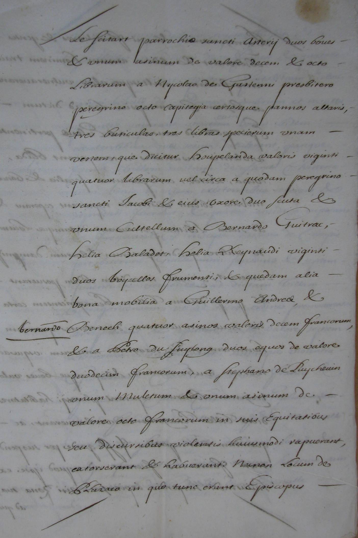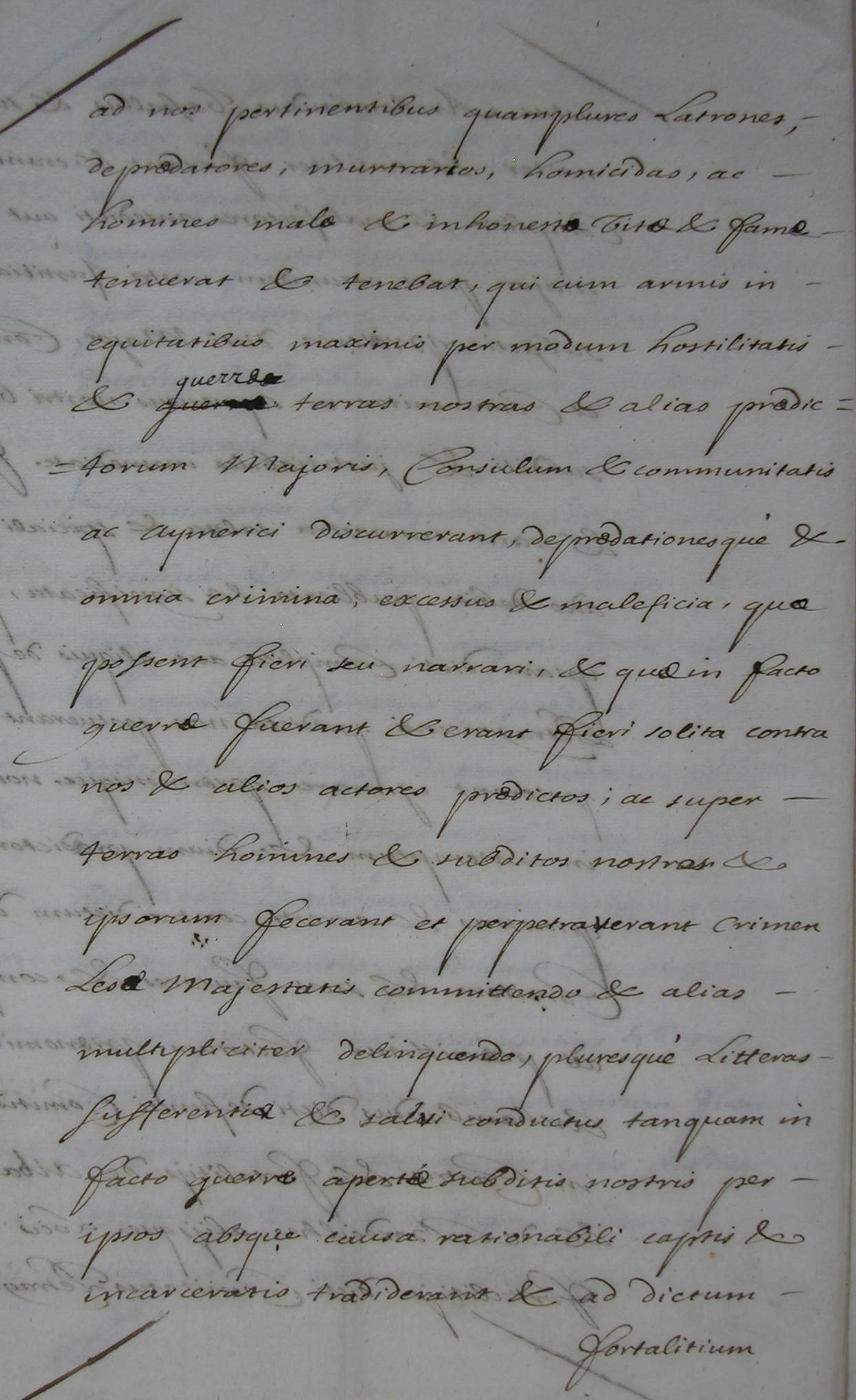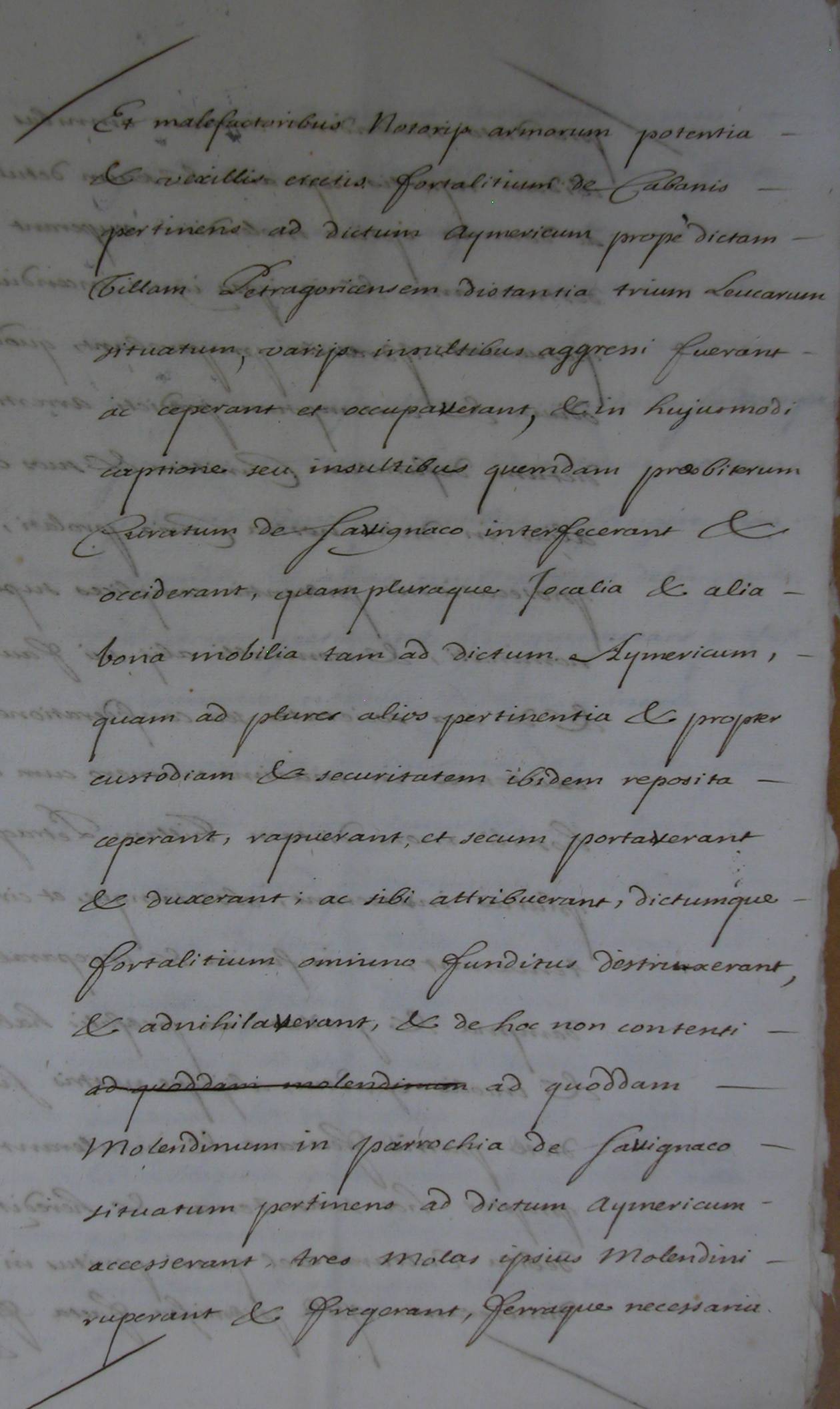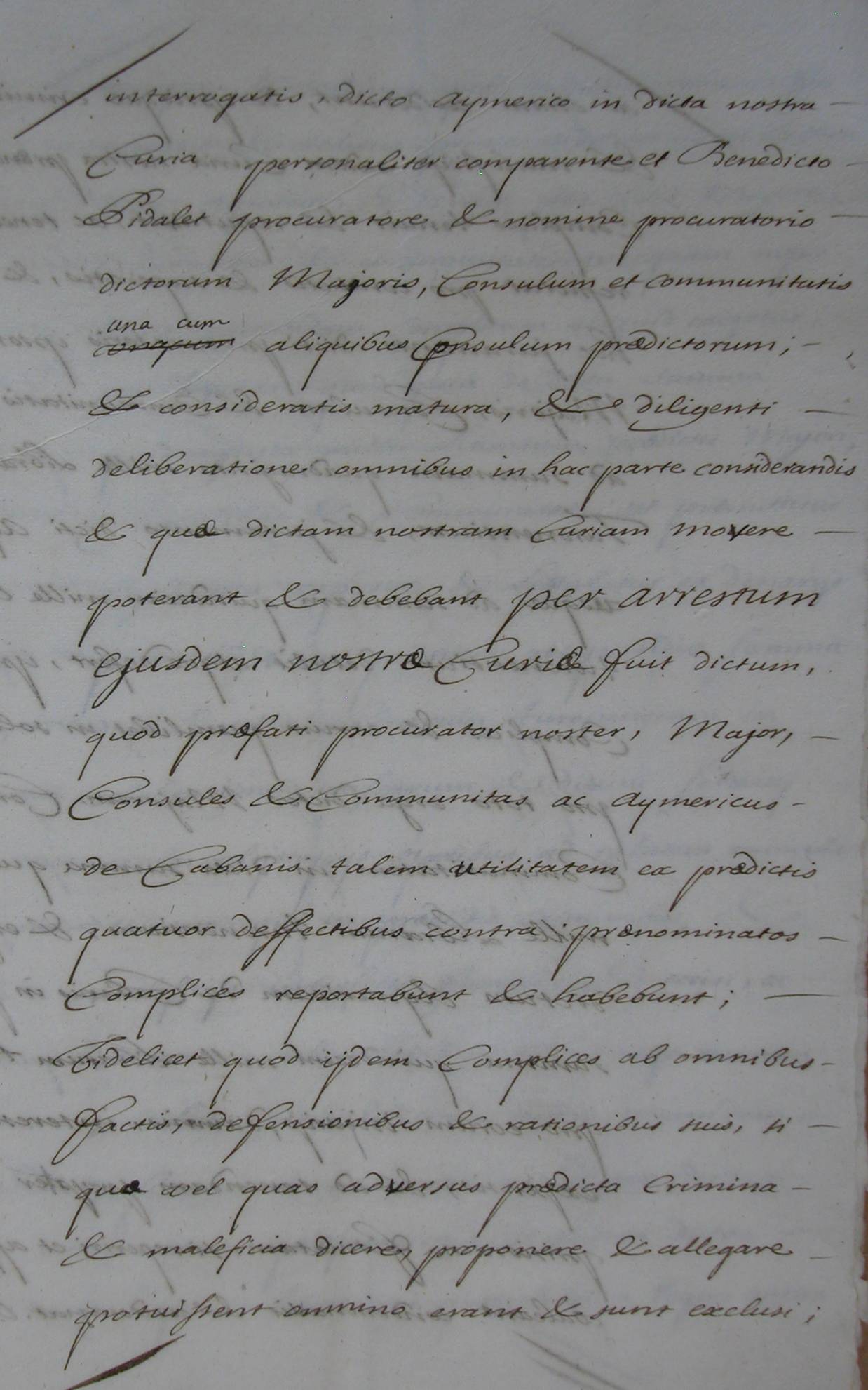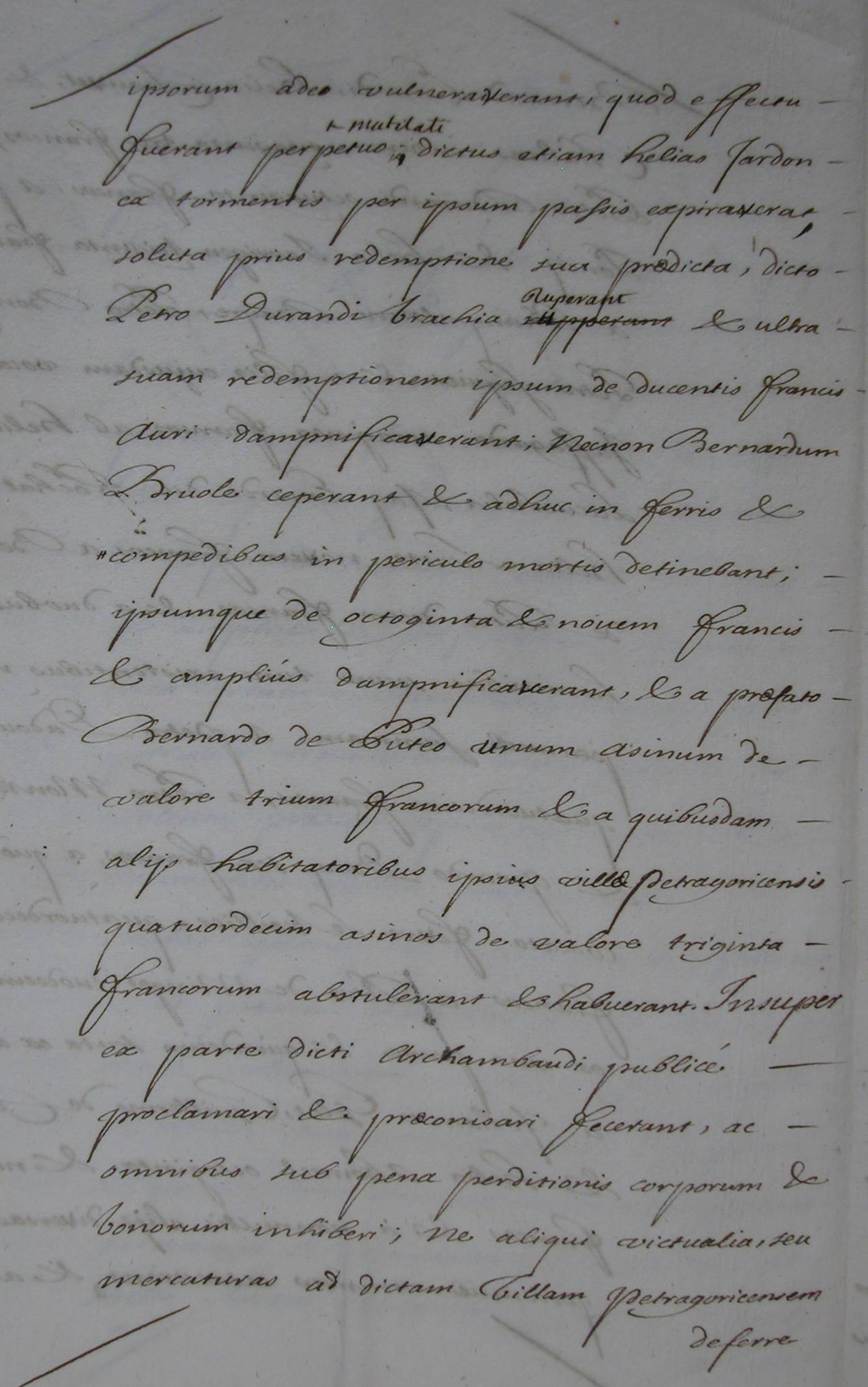 Johannes Tricardi in legibus licenciatus, et locum tenens natus domini senescalli Petragoricensis, notum facimus universis has presentes litteras inspecturis, nos hodierna die infrascripta ad instantiam et requestam egregii et potentis domini Alani, domini de Lebreto, comitis Petragoricensis, vicecomitisque Lemovicensis, et Tartasis, ac domini de Avenis in presentia discretorum virorum magistrorum Petri Baillivi, et Johannis de Pelisses in legibus licenciati advocati, et procuratoris domini nostri Regis in senescallia Petragoricensi vidisse, tenuisse, palpasse et legisse de verbo ad verbum et per notarios et scribas dictae curiae infra scriptos transcribi fecisse quasdam patentes litteras in duplici cauda et cera crocea, ut prima facie apparebat in pendenti sigillatas, non rasas, non viciatas, non cancellatas, nec in aliqua earum parte suspectas, sed prorsus omni vicio et suspicione carentes, quarum tenor talis est : Karolus Dei gratia Francorum Rex, universis presentes litteras inspecturis, salutem. Notum facimus, quod nos de registris criminalibus nostre parlamenti curie extrahi fecimus quoddam arrestum in eadem nostra curia decima nona die julii, anno Domini millesimo tricentesimo nonagesimo nono datum seu prolatum, cuius tenor talis est :ex parte procuratoris nostris generalis pro nobis et dilectorum nostrorum maioris, consulum et communitatis ville et civitatis nostre Petragoricensis : necnon Aymerici de Cabanis militis actorum, contra Archambaudum de Petragorico, Arnaldum Durac capitaneum de Bourdeilhe, Johannem Cotet capitaneum de Alba Ruppe, Bos de Chambrilhac, Bertrandum de Lagandilhie, magistrum Guillermum Jaubert, Leonardum de Ponte, Raymundum Gunbaud, Oliverium Mercuri clericum Mureti, quendam vocatum Cossandum, quendam vocatum Phelippot, quendam vocatum Bastide, Johannem Normani, Bernardum de Sancto Petro generem Bernardi de Massant, Thomelinum Delage, quemdam vocatum Verdoyce, quemdam vocatum Tire-Agulhete, Johannem Du Rat, Perrotum Marches, Vidalotum Marches, Alanum Marches, quemdam vocatum Colet, Bernardum de Massant, Maronem de Ferrezaco, quemdam vocatum Nucay, quemdam vocatum Ramonet, Mondonum Dale, Robinetum Legrasset, Bernardum de Massant, Maronem de Ferrezaco, quemdam vocatum Grungadie, quemdam vocatum Gironnet, Mondonum famulum clerici Mureti, quemdam vocatum Leboure de Sancto Petro, Johannem Barbe de Bone, quemdam vocatum Nandin, quemdam vocatum Lorans, Robinum Le Clergon, Bernardum de Morteriis, Johannem Damouretes, Guillermum Leblonde, quemdam vocatum Finet, Martinum Lespagnol, quemdam vocatum Guilhams, Johannem Gumel, Jacobum Balisterii, quemdam vocatum Guilhamin, Perrotum Escalle, Hennequinum A La Poulanie, Guilhotum Cournaguerre, Gailhardetum de Larcherie, Menautonum de Ponte, Guillermum et Rampicoulz de Villeboys, Mondonum Francisci, Johannem Normani, Johannem de Labernardie, quemdam vocatum Le Camus, Johannem Balisterii, quemdam vocatum Maudicot, Johannem Morelli, Johannem de Sancta Fide, quemdam vocatum Denis, Perrotum Britonis, Andoynetum capitaneum de Fossamaigne, et Martialem Balisterii complices et malefactores in hac parte, fuit in nostra parlamenti curia in ipsorum complicium abtencia propositum nobis alias pro parte dictorum maioris, consulum et communitatis expositum fuisse graviter conquerendo, quod cum certus processus alias motus fuisset et penderet in eadem nostra curia inter ipsos conquerentes dicto procuratore nostro secum adjuncto actores ex una parte; et defunctum Archambaudum quondam comitem Petragoricensem, ac nonnullos alios ejus confederatos seu complices defensores ex altera, occasione plurium et diversorum criminum, excessuum et maleficiorum horribilium et detestabilium per eosdem Comitem et ejus complices in partibus Petragoricensibus dampnabiliter commisorum et perpetratorum.Et super hoc in tantum processum fuisset, quod per arrestum dicte nostre curie dicti Comes et sui complices fuerunt erga dictos conquerentes in certis emendis condempnati et a regno nostro perpetuo banniti, eodem comitatu Petragoricensi nobis confiscato et penitus acquisito, prenominatus Archambaudus filius dicti defuncti comitis noster vassalus et subditus, suique complices et fautores in fortaliciis de Montinhaco, de Alba Ruppe, de Bordeilhe, et de Roucille, ac in aliis locis per ipsum Archambaudum detentis manantes et conversantes in odium et contemptum dicti arresti ante et post prolationem ipsius contra nostras ordinationes regias, per quas omnes guerre et vie facti inter nostros subditos sub pena perditionis corporum et bonorum notorie prohibentur quamplures equitatus, guerras, murtra, homicidia, et alia crimina et maleficia, interveniente juvamine et associatione nonnullorum anglicorum, et aliorum nostrorum et regni nostri innimicorum contra villam et civitatem nostram Petragoricensem, et habitatores ejusdem, et suarum pertinentiarum, necnon contra quamplures nostros subditos et villas dicte patrie Petragoricensis fecerant, commiserant et perpetuaverant, ac facere, comittere et perpetrare non cessabant temere et injuste in prejudicium, dampnum et destructionem rei publice dicte patrie, dictorumque conquerentium, qui propter hoc taliter fuerant et erant gravati et oppressi, quod necessarium sibi aut quamplurimis ipsorum fuerat et erat ipsam patriam omnino relinquere, et alibi se transferre, nisi de remedio iustitie super hoc provideretur eisdem. Quapropter senescallis nostris Petragoricensi, Lemovicensi, Xantonensi et Caturcensi, ceterisque justiciariis nostris, aut eorum locatenentibus, et eorum cuilibet per certas litteras nostras decima octava die aprilis ante Pascha, anno Domini millesimo trecentesimo nonagesimo sexto a nobis obtentas mandaveramus committendo, quathenus de et super eisdem criminibus et maleficiis, et aliis pro parte dictorum conquerentium declarandis, se diliginter et secrete informarent, et quos de ipsis per informationem factam seu faciendam, famam vel publicam, aut vehementes presumptiones, culpabiles, aut suspectos invenirent, ubicu