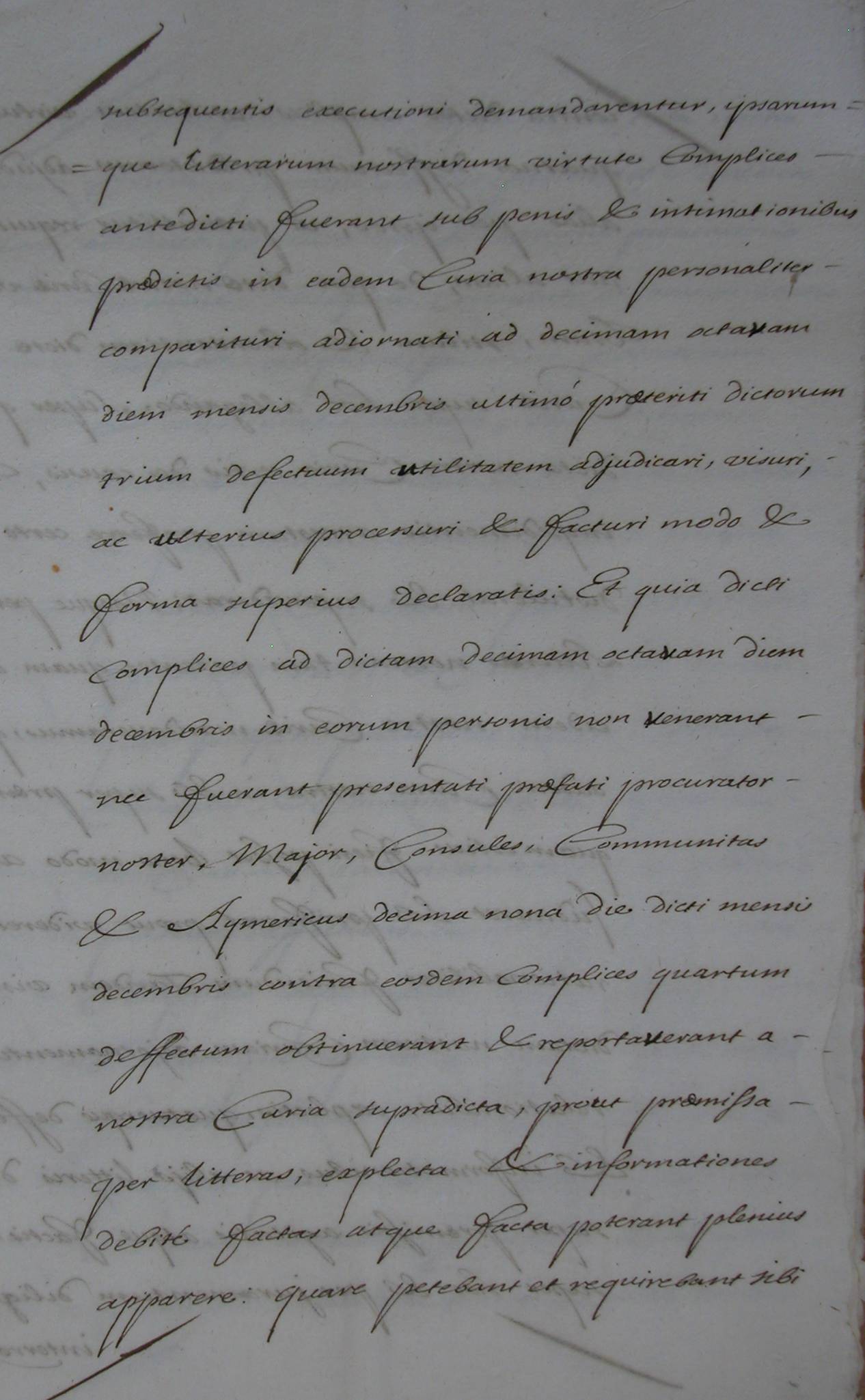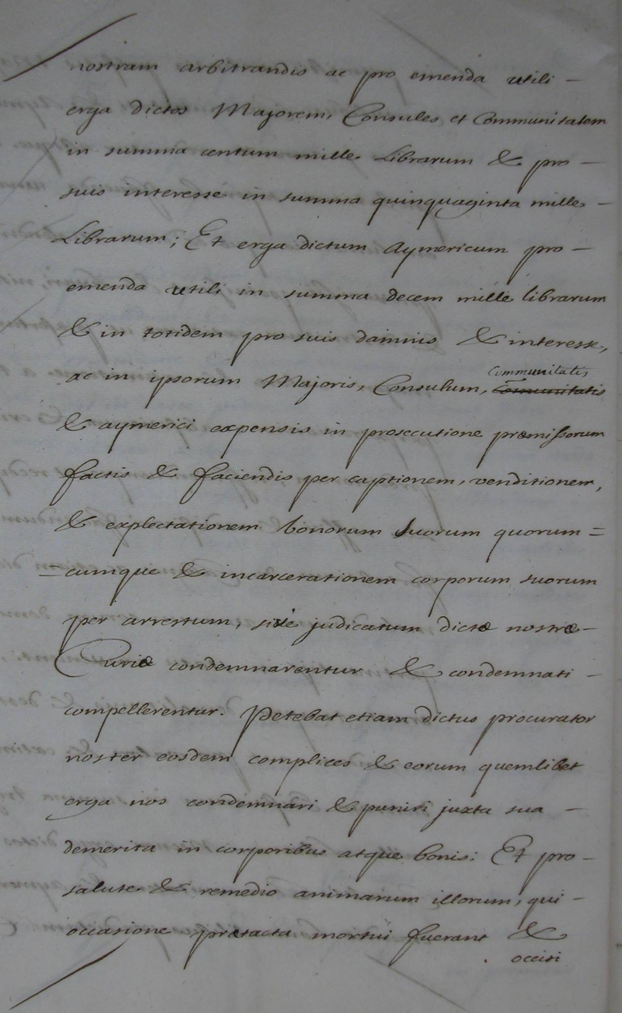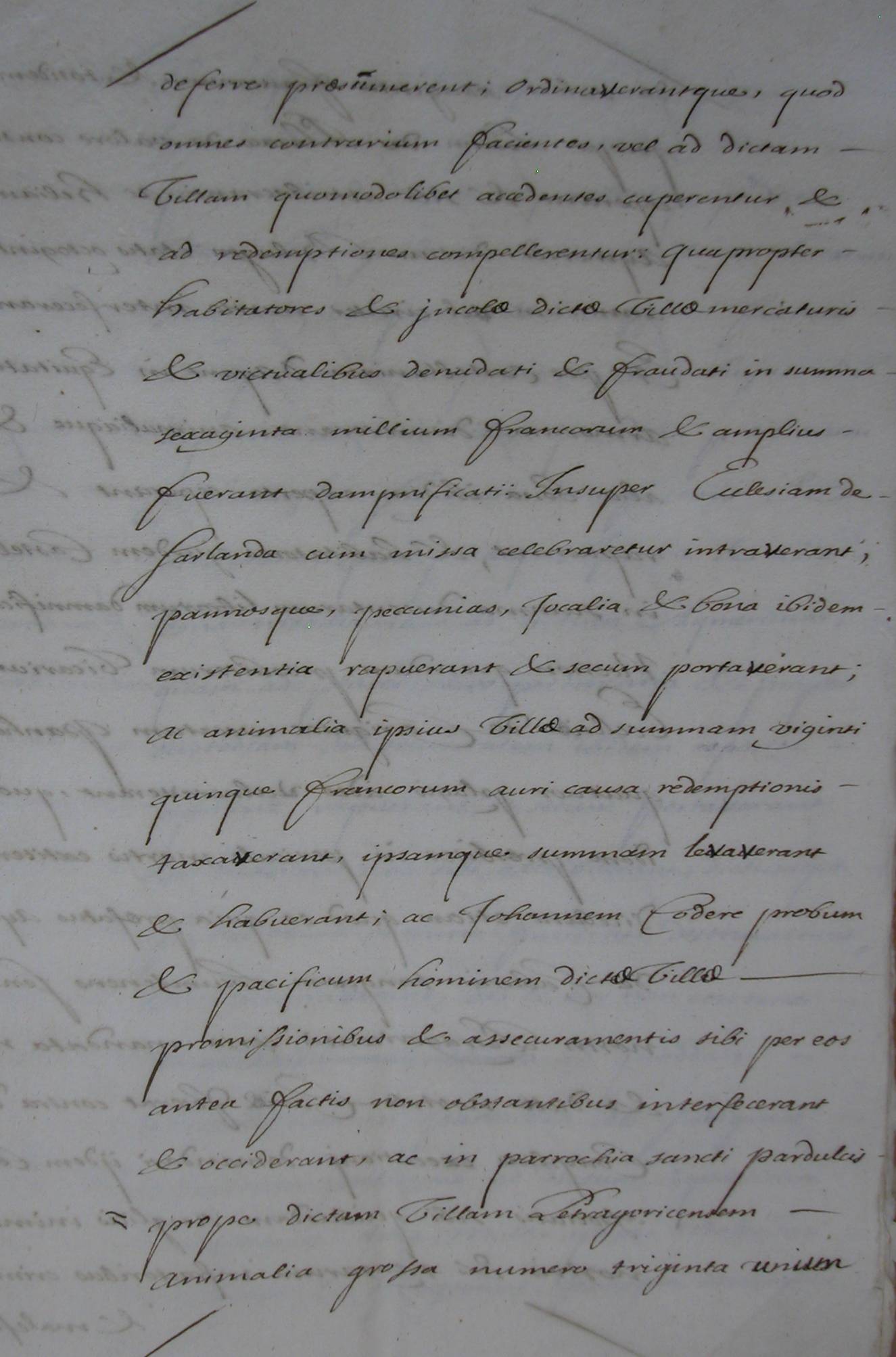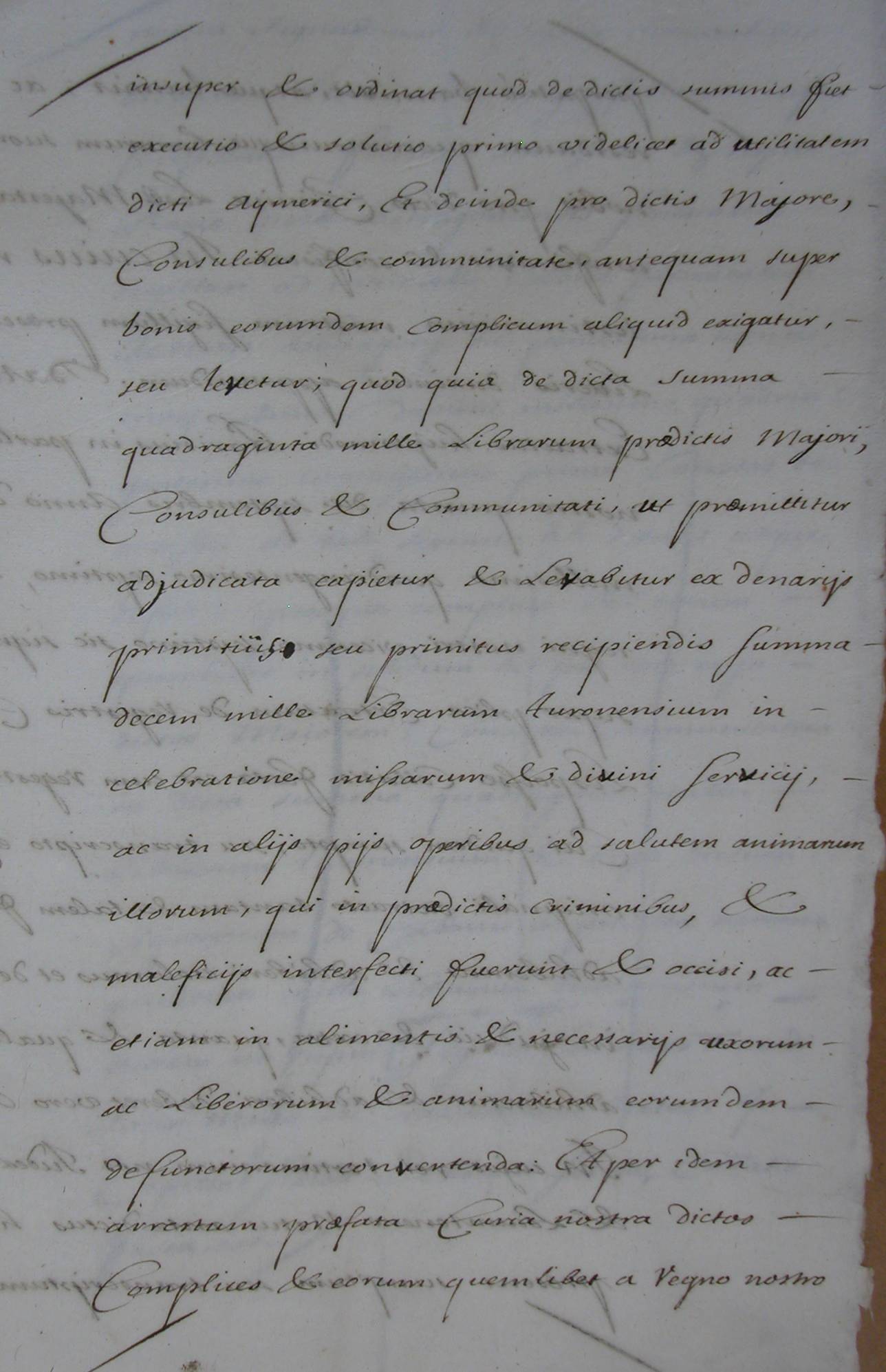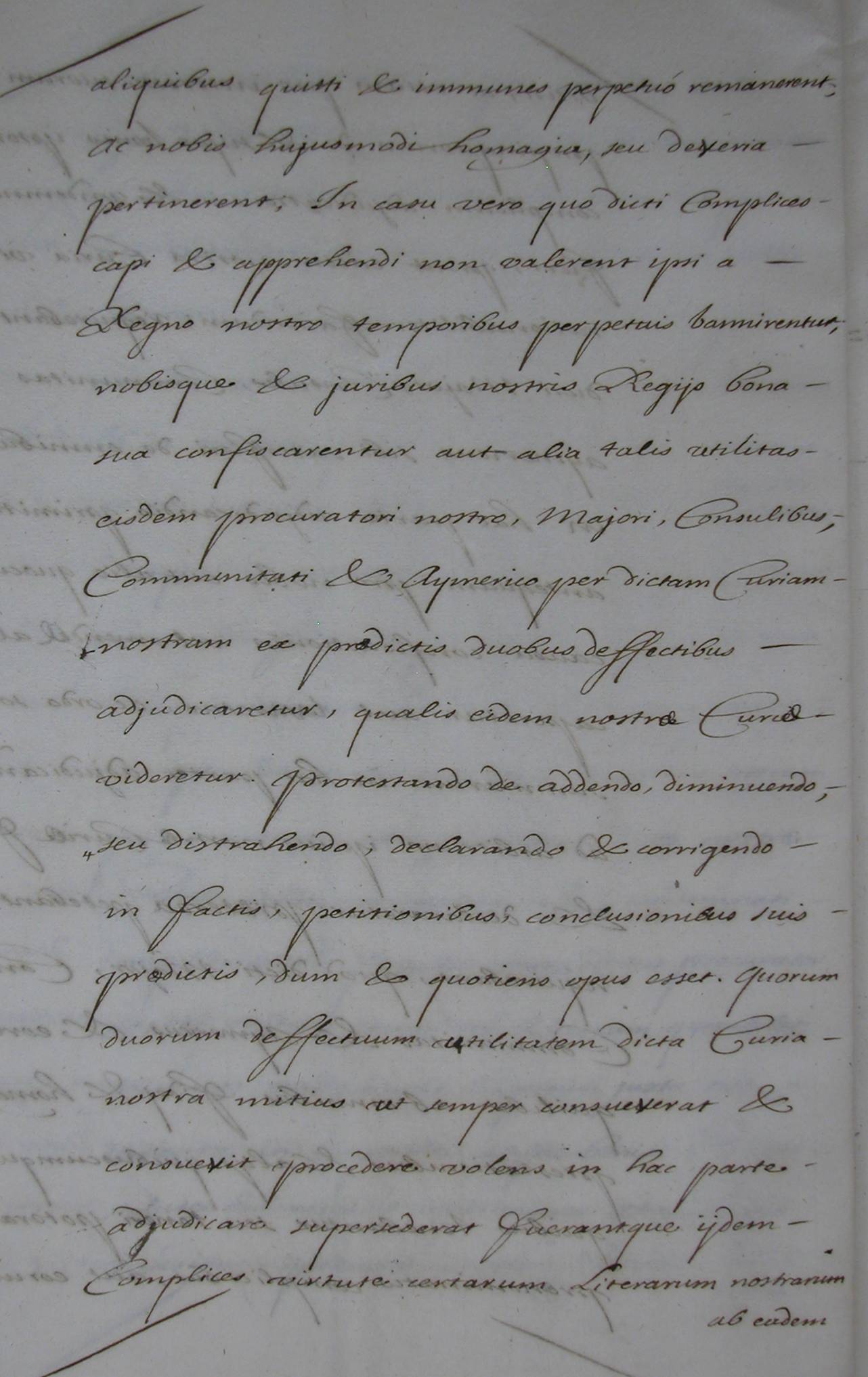 Johannes Tricardi in legibus licenciatus, et locum tenens natus domini senescalli Petragoricensis, notum facimus universis has presentes litteras inspecturis, nos hodierna die infrascripta ad instantiam et requestam egregii et potentis domini Alani, domini de Lebreto, comitis Petragoricensis, vicecomitisque Lemovicensis, et Tartasis, ac domini de Avenis in presentia discretorum virorum magistrorum Petri Baillivi, et Johannis de Pelisses in legibus licenciati advocati, et procuratoris domini nostri Regis in senescallia Petragoricensi vidisse, tenuisse, palpasse et legisse de verbo ad verbum et per notarios et scribas dictae curiae infra scriptos transcribi fecisse quasdam patentes litteras in duplici cauda et cera crocea, ut prima facie apparebat in pendenti sigillatas, non rasas, non viciatas, non cancellatas, nec in aliqua earum parte suspectas, sed prorsus omni vicio et suspicione carentes, quarum tenor talis est : Karolus Dei gratia Francorum Rex, universis presentes litteras inspecturis, salutem. Notum facimus, quod nos de registris criminalibus nostre parlamenti curie extrahi fecimus quoddam arrestum in eadem nostra curia decima nona die julii, anno Domini millesimo tricentesimo nonagesimo nono datum seu prolatum, cuius tenor talis est :ex parte procuratoris nostris generalis pro nobis et dilectorum nostrorum maioris, consulum et communitatis ville et civitatis nostre Petragoricensis : necnon Aymerici de Cabanis militis actorum, contra Archambaudum de Petragorico, Arnaldum Durac capitaneum de Bourdeilhe, Johannem Cotet capitaneum de Alba Ruppe, Bos de Chambrilhac, Bertrandum de Lagandilhie, magistrum Guillermum Jaubert, Leonardum de Ponte, Raymundum Gunbaud, Oliverium Mercuri clericum Mureti, quendam vocatum Cossandum, quendam vocatum Phelippot, quendam vocatum Bastide, Johannem Normani, Bernardum de Sancto Petro generem Bernardi de Massant, Thomelinum Delage, quemdam vocatum Verdoyce, quemdam vocatum Tire-Agulhete, Johannem Du Rat, Perrotum Marches, Vidalotum Marches, Alanum Marches, quemdam vocatum Colet, Bernardum de Massant, Maronem de Ferrezaco, quemdam vocatum Nucay, quemdam vocatum Ramonet, Mondonum Dale, Robinetum Legrasset, Bernardum de Massant, Maronem de Ferrezaco, quemdam vocatum Grungadie, quemdam vocatum Gironnet, Mondonum famulum clerici Mureti, quemdam vocatum Leboure de Sancto Petro, Johannem Barbe de Bone, quemdam vocatum Nandin, quemdam vocatum Lorans, Robinum Le Clergon, Bernardum de Morteriis, Johannem Damouretes, Guillermum Leblonde, quemdam vocatum Finet, Martinum Lespagnol, quemdam vocatum Guilhams, Johannem Gumel, Jacobum Balisterii, quemdam vocatum Guilhamin, Perrotum Escalle, Hennequinum A La Poulanie, Guilhotum Cournaguerre, Gailhardetum de Larcherie, Menautonum de Ponte, Guillermum et Rampicoulz de Villeboys, Mondonum Francisci, Johannem Normani, Johannem de Labernardie, quemdam vocatum Le Camus, Johannem Balisterii, quemdam vocatum Maudicot, Johannem Morelli, Johannem de Sancta Fide, quemdam vocatum Denis, Perrotum Britonis, Andoynetum capitaneum de Fossamaigne, et Martialem Balisterii complices et malefactores in hac parte, fuit in nostra parlamenti curia in ipsorum complicium abtencia propositum nobis alias pro parte dictorum maioris, consulum et communitatis expositum fuisse graviter conquerendo, quod cum certus processus alias motus fuisset et penderet in eadem nostra curia inter ipsos conquerentes dicto procuratore nostro secum adjuncto actores ex una parte; et defunctum Archambaudum quondam comitem Petragoricensem, ac nonnullos alios ejus confederatos seu complices defensores ex altera, occasione plurium et diversorum criminum, excessuum et maleficiorum horribilium et detestabilium per eosdem Comitem et ejus complices in partibus Petragoricensibus dampnabiliter commisorum et perpetratorum.Et super hoc in tantum processum fuisset, quod per arrestum dicte nostre curie dicti Comes et sui complices fuerunt erga dictos conquerentes in certis emendis condempnati et a regno nostro perpetuo banniti, eodem comitatu Petragoricensi nobis confiscato et penitus acquisito, prenominatus Archambaudus filius dicti defuncti comitis noster vassalus et subditus, suique complices et fautores in fortaliciis de Montinhaco, de Alba Ruppe, de Bordeilhe, et de Roucille, ac in aliis locis per ipsum Archambaudum detentis manantes et conversantes in odium et contemptum dicti arresti ante et post prolationem ipsius contra nostras ordinationes regias, per quas omnes guerre et vie facti inter nostros subditos sub pena perditionis corporum et bonorum notorie prohibentur quamplures equitatus, guerras, murtra, homicidia, et alia crimina et maleficia, interveniente juvamine et associatione nonnullorum anglicorum, et aliorum nostrorum et regni nostri innimicorum contra villam et civitatem nostram Petragoricensem, et habitatores ejusdem, et suarum pertinentiarum, necnon contra quamplures nostros subditos et villas dicte patrie Petragoricensis fecerant, commiserant et perpetuaverant, ac facere, comittere et perpetrare non cessabant temere et injuste in prejudicium, dampnum et destructionem rei publice dicte patrie, dictorumque conquerentium, qui propter hoc taliter fuerant et erant gravati et oppressi, quod necessarium sibi aut quamplurimis ipsorum fuerat et erat ipsam patriam omnino relinquere, et alibi se transferre, nisi de remedio iustitie super hoc provideretur eisdem. Quapropter senescallis nostris Petragoricensi, Lemovicensi, Xantonensi et Caturcensi, ceterisque justiciariis nostris, aut eorum locatenentibus, et eorum cuilibet per certas litteras nostras decima octava die aprilis ante Pascha, anno Domini millesimo trecentesimo nonagesimo sexto a nobis obtentas mandaveramus committendo, quathenus de et super eisdem criminibus et maleficiis, et aliis pro parte dictorum conquerentium declarandis, se diliginter et secrete informarent, et quos de ipsis per informationem factam seu faciendam, famam vel publicam, aut vehementes presumptiones, culpabiles, aut suspectos invenirent, ubicu