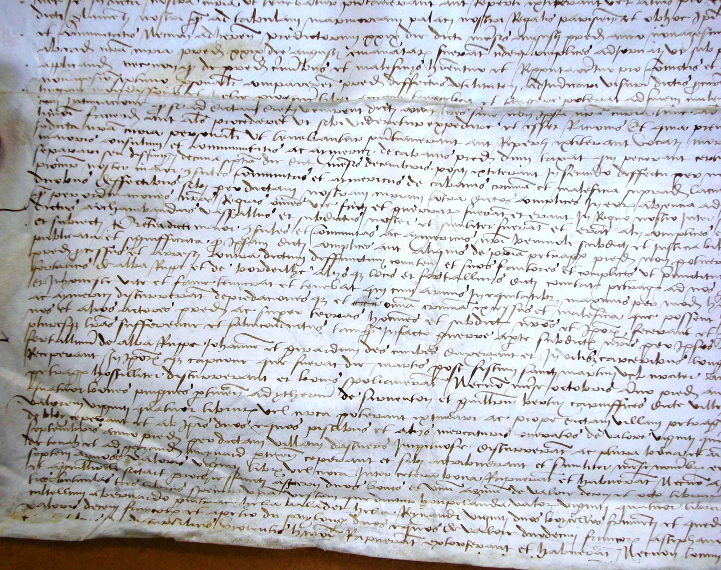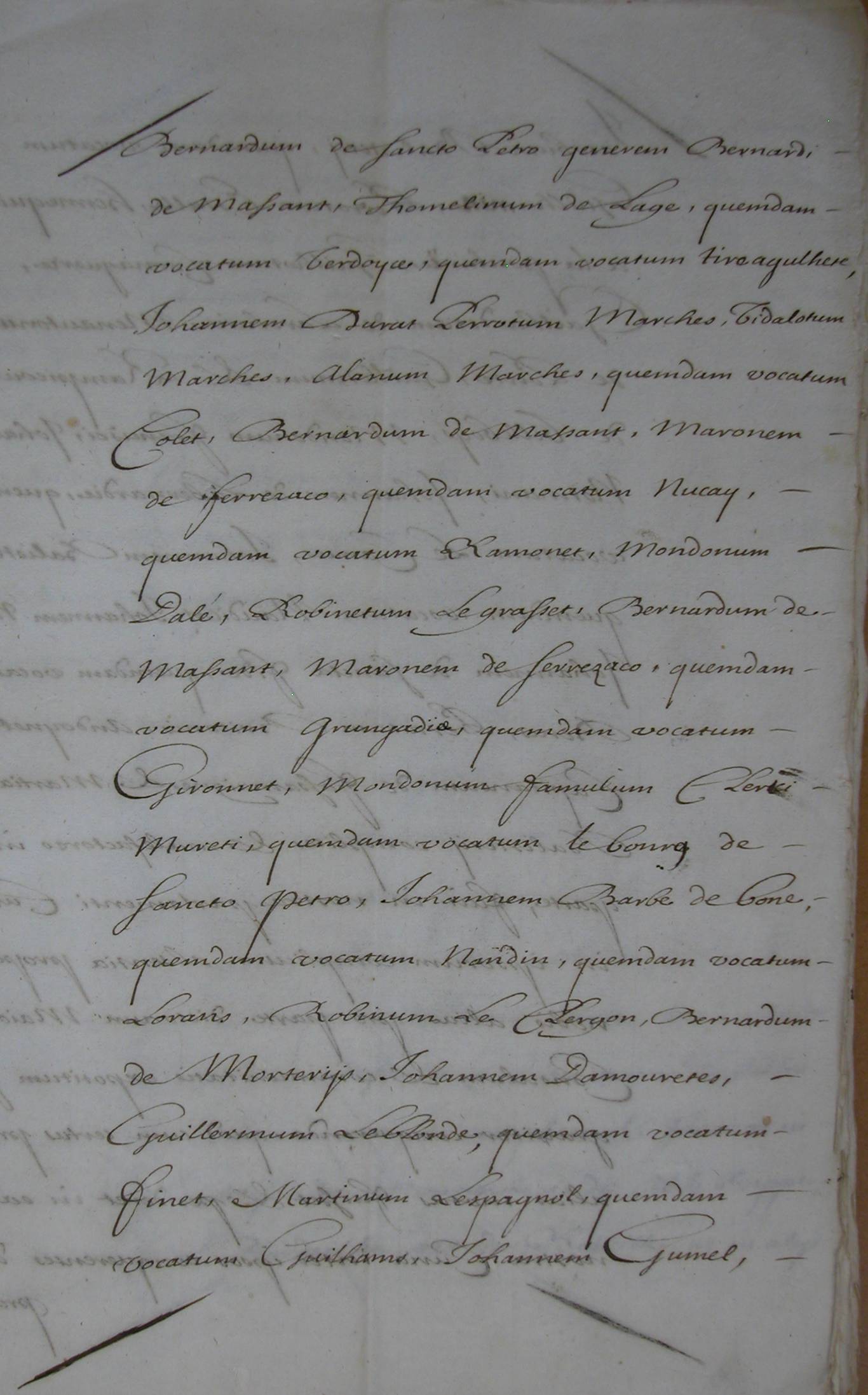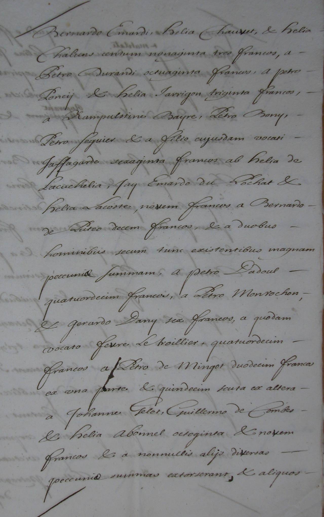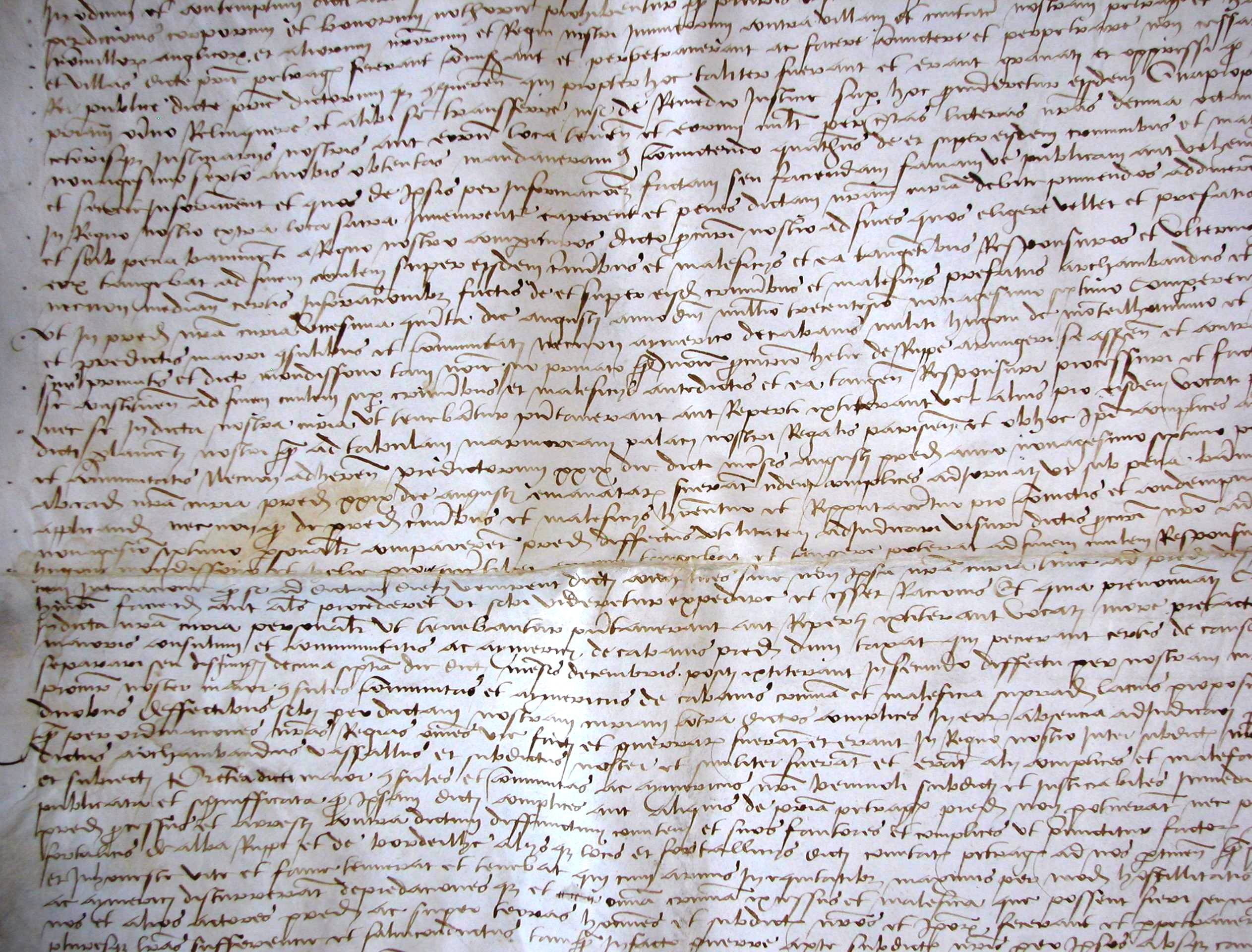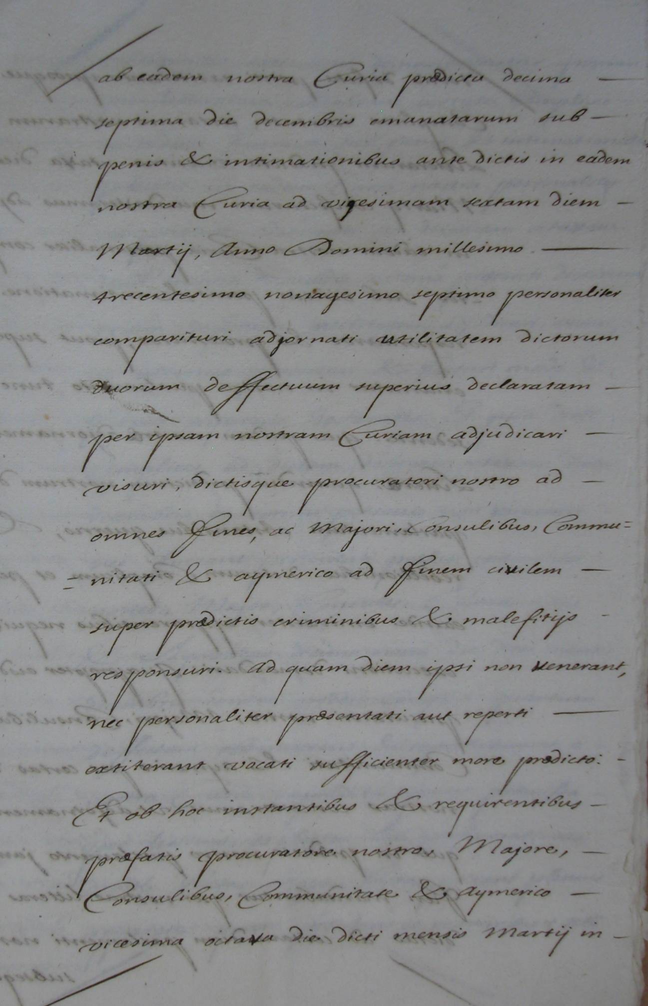 Johannes Tricardi in legibus licenciatus, et locum tenens natus domini senescalli Petragoricensis, notum facimus universis has presentes litteras inspecturis, nos hodierna die infrascripta ad instantiam et requestam egregii et potentis domini Alani, domini de Lebreto, comitis Petragoricensis, vicecomitisque Lemovicensis, et Tartasis, ac domini de Avenis in presentia discretorum virorum magistrorum Petri Baillivi, et Johannis de Pelisses in legibus licenciati advocati, et procuratoris domini nostri Regis in senescallia Petragoricensi vidisse, tenuisse, palpasse et legisse de verbo ad verbum et per notarios et scribas dictae curiae infra scriptos transcribi fecisse quasdam patentes litteras in duplici cauda et cera crocea, ut prima facie apparebat in pendenti sigillatas, non rasas, non viciatas, non cancellatas, nec in aliqua earum parte suspectas, sed prorsus omni vicio et suspicione carentes, quarum tenor talis est : Karolus Dei gratia Francorum Rex, universis presentes litteras inspecturis, salutem. Notum facimus, quod nos de registris criminalibus nostre parlamenti curie extrahi fecimus quoddam arrestum in eadem nostra curia decima nona die julii, anno Domini millesimo tricentesimo nonagesimo nono datum seu prolatum, cuius tenor talis est :ex parte procuratoris nostris generalis pro nobis et dilectorum nostrorum maioris, consulum et communitatis ville et civitatis nostre Petragoricensis : necnon Aymerici de Cabanis militis actorum, contra Archambaudum de Petragorico, Arnaldum Durac capitaneum de Bourdeilhe, Johannem Cotet capitaneum de Alba Ruppe, Bos de Chambrilhac, Bertrandum de Lagandilhie, magistrum Guillermum Jaubert, Leonardum de Ponte, Raymundum Gunbaud, Oliverium Mercuri clericum Mureti, quendam vocatum Cossandum, quendam vocatum Phelippot, quendam vocatum Bastide, Johannem Normani, Bernardum de Sancto Petro generem Bernardi de Massant, Thomelinum Delage, quemdam vocatum Verdoyce, quemdam vocatum Tire-Agulhete, Johannem Du Rat, Perrotum Marches, Vidalotum Marches, Alanum Marches, quemdam vocatum Colet, Bernardum de Massant, Maronem de Ferrezaco, quemdam vocatum Nucay, quemdam vocatum Ramonet, Mondonum Dale, Robinetum Legrasset, Bernardum de Massant, Maronem de Ferrezaco, quemdam vocatum Grungadie, quemdam vocatum Gironnet, Mondonum famulum clerici Mureti, quemdam vocatum Leboure de Sancto Petro, Johannem Barbe de Bone, quemdam vocatum Nandin, quemdam vocatum Lorans, Robinum Le Clergon, Bernardum de Morteriis, Johannem Damouretes, Guillermum Leblonde, quemdam vocatum Finet, Martinum Lespagnol, quemdam vocatum Guilhams, Johannem Gumel, Jacobum Balisterii, quemdam vocatum Guilhamin, Perrotum Escalle, Hennequinum A La Poulanie, Guilhotum Cournaguerre, Gailhardetum de Larcherie, Menautonum de Ponte, Guillermum et Rampicoulz de Villeboys, Mondonum Francisci, Johannem Normani, Johannem de Labernardie, quemdam vocatum Le Camus, Johannem Balisterii, quemdam vocatum Maudicot, Johannem Morelli, Johannem de Sancta Fide, quemdam vocatum Denis, Perrotum Britonis, Andoynetum capitaneum de Fossamaigne, et Martialem Balisterii complices et malefactores in hac parte, fuit in nostra parlamenti curia in ipsorum complicium abtencia propositum nobis alias pro parte dictorum maioris, consulum et communitatis expositum fuisse graviter conquerendo, quod cum certus processus alias motus fuisset et penderet in eadem nostra curia inter ipsos conquerentes dicto procuratore nostro secum adjuncto actores ex una parte; et defunctum Archambaudum quondam comitem Petragoricensem, ac nonnullos alios ejus confederatos seu complices defensores ex altera, occasione plurium et diversorum criminum, excessuum et maleficiorum horribilium et detestabilium per eosdem Comitem et ejus complices in partibus Petragoricensibus dampnabiliter commisorum et perpetratorum.Et super hoc in tantum processum fuisset, quod per arrestum dicte nostre curie dicti Comes et sui complices fuerunt erga dictos conquerentes in certis emendis condempnati et a regno nostro perpetuo banniti, eodem comitatu Petragoricensi nobis confiscato et penitus acquisito, prenominatus Archambaudus filius dicti defuncti comitis noster vassalus et subditus, suique complices et fautores in fortaliciis de Montinhaco, de Alba Ruppe, de Bordeilhe, et de Roucille, ac in aliis locis per ipsum Archambaudum detentis manantes et conversantes in odium et contemptum dicti arresti ante et post prolationem ipsius contra nostras ordinationes regias, per quas omnes guerre et vie facti inter nostros subditos sub pena perditionis corporum et bonorum notorie prohibentur quamplures equitatus, guerras, murtra, homicidia, et alia crimina et maleficia, interveniente juvamine et associatione nonnullorum anglicorum, et aliorum nostrorum et regni nostri innimicorum contra villam et civitatem nostram Petragoricensem, et habitatores ejusdem, et suarum pertinentiarum, necnon contra quamplures nostros subditos et villas dicte patrie Petragoricensis fecerant, commiserant et perpetuaverant, ac facere, comittere et perpetrare non cessabant temere et injuste in prejudicium, dampnum et destructionem rei publice dicte patrie, dictorumque conquerentium, qui propter hoc taliter fuerant et erant gravati et oppressi, quod necessarium sibi aut quamplurimis ipsorum fuerat et erat ipsam patriam omnino relinquere, et alibi se transferre, nisi de remedio iustitie super hoc provideretur eisdem. Quapropter senescallis nostris Petragoricensi, Lemovicensi, Xantonensi et Caturcensi, ceterisque justiciariis nostris, aut eorum locatenentibus, et eorum cuilibet per certas litteras nostras decima octava die aprilis ante Pascha, anno Domini millesimo trecentesimo nonagesimo sexto a nobis obtentas mandaveramus committendo, quathenus de et super eisdem criminibus et maleficiis, et aliis pro parte dictorum conquerentium declarandis, se diliginter et secrete informarent, et quos de ipsis per informationem factam seu faciendam, famam vel publicam, aut vehementes presumptiones, culpabiles, aut suspectos invenirent, ubicu