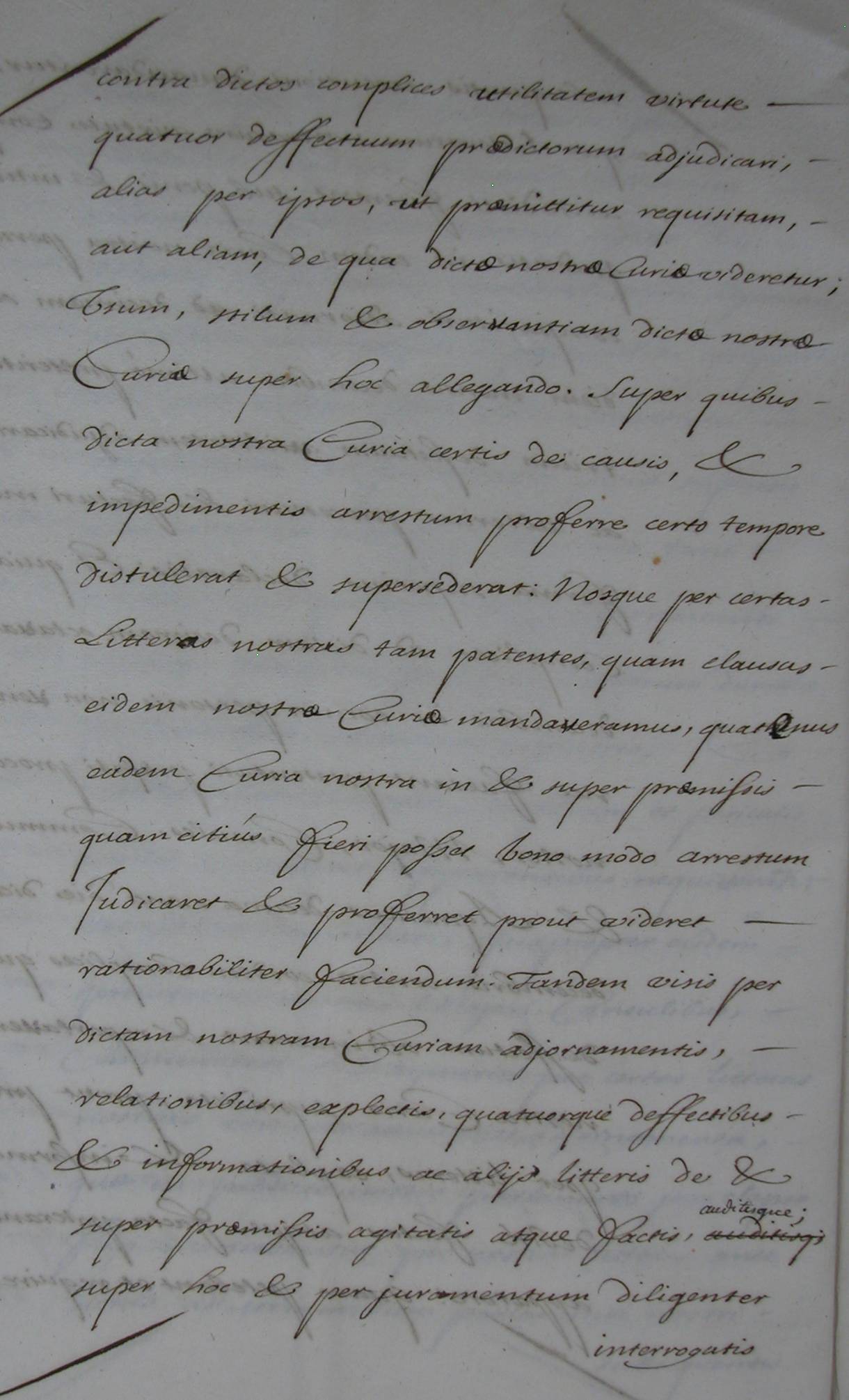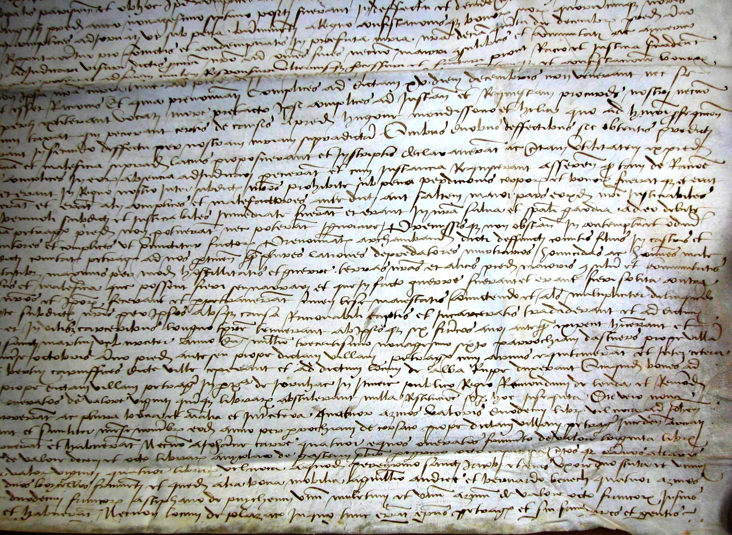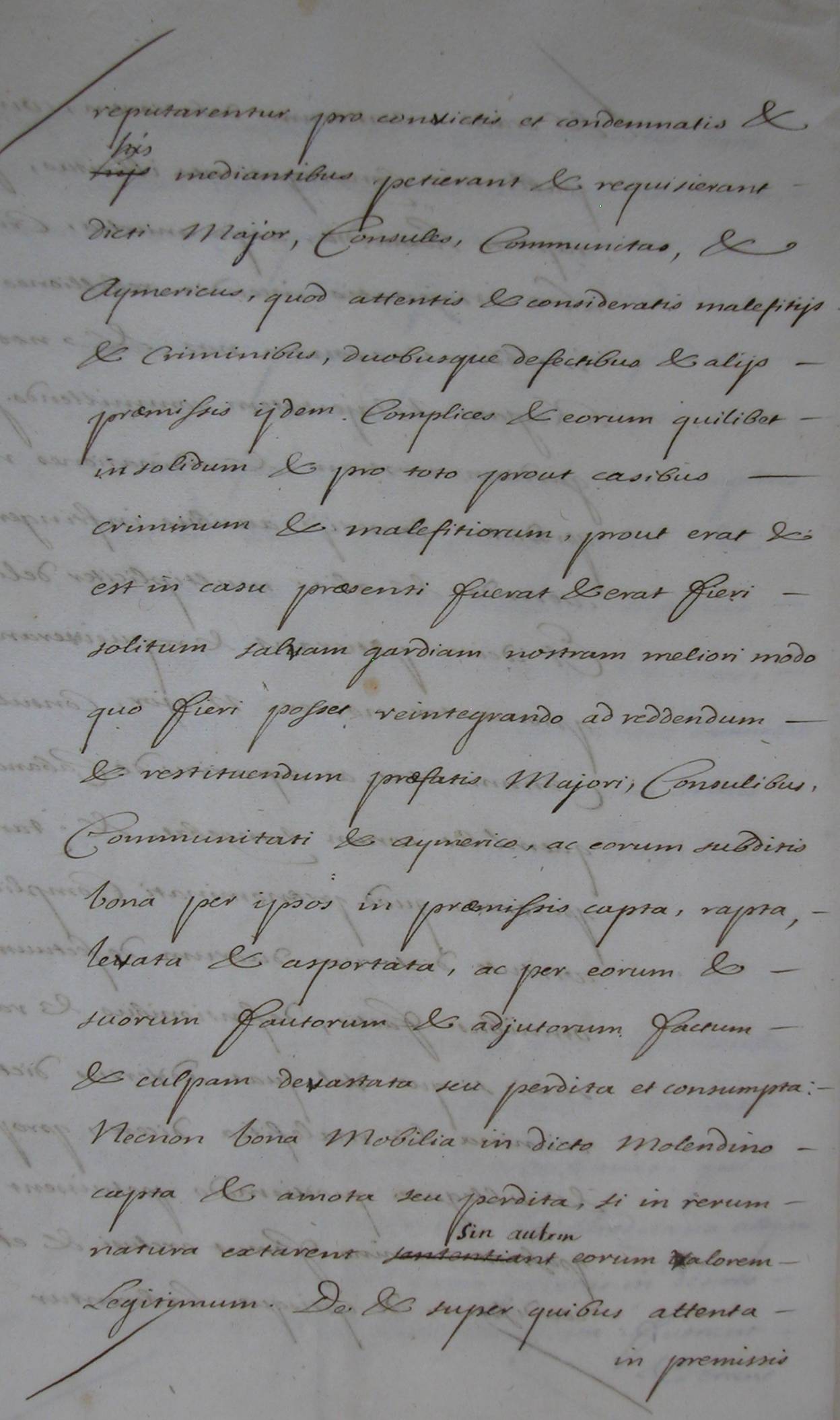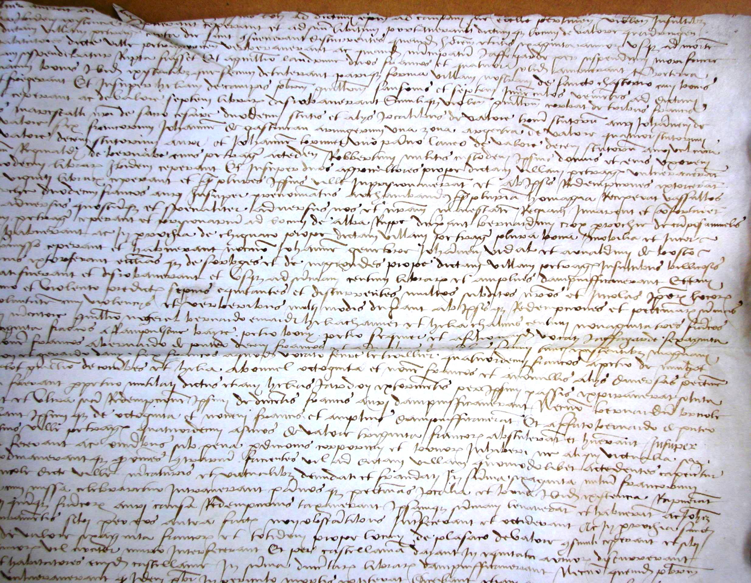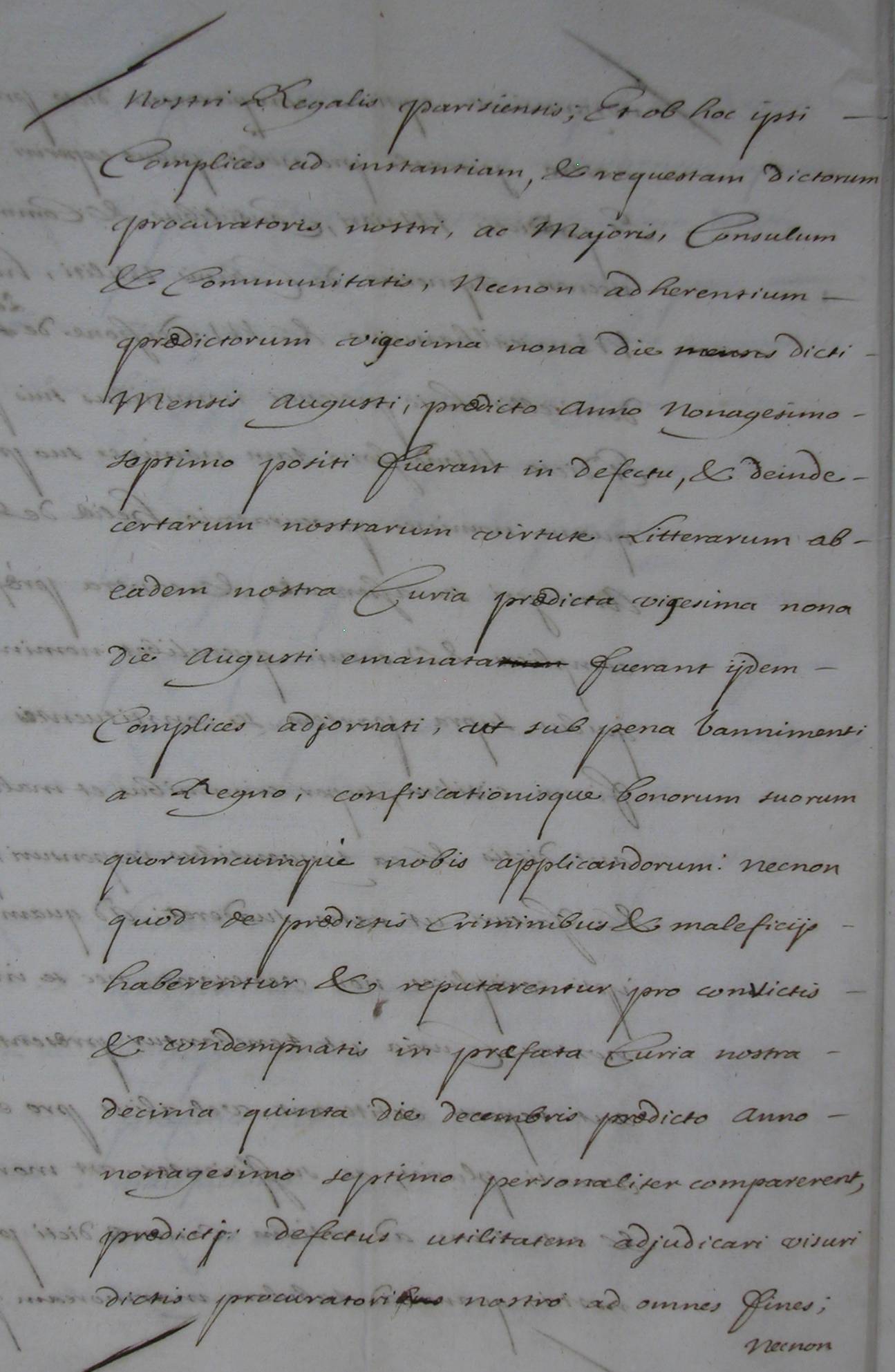 Johannes Tricardi in legibus licenciatus, et locum tenens natus domini senescalli Petragoricensis, notum facimus universis has presentes litteras inspecturis, nos hodierna die infrascripta ad instantiam et requestam egregii et potentis domini Alani, domini de Lebreto, comitis Petragoricensis, vicecomitisque Lemovicensis, et Tartasis, ac domini de Avenis in presentia discretorum virorum magistrorum Petri Baillivi, et Johannis de Pelisses in legibus licenciati advocati, et procuratoris domini nostri Regis in senescallia Petragoricensi vidisse, tenuisse, palpasse et legisse de verbo ad verbum et per notarios et scribas dictae curiae infra scriptos transcribi fecisse quasdam patentes litteras in duplici cauda et cera crocea, ut prima facie apparebat in pendenti sigillatas, non rasas, non viciatas, non cancellatas, nec in aliqua earum parte suspectas, sed prorsus omni vicio et suspicione carentes, quarum tenor talis est : Karolus Dei gratia Francorum Rex, universis presentes litteras inspecturis, salutem. Notum facimus, quod nos de registris criminalibus nostre parlamenti curie extrahi fecimus quoddam arrestum in eadem nostra curia decima nona die julii, anno Domini millesimo tricentesimo nonagesimo nono datum seu prolatum, cuius tenor talis est :ex parte procuratoris nostris generalis pro nobis et dilectorum nostrorum maioris, consulum et communitatis ville et civitatis nostre Petragoricensis : necnon Aymerici de Cabanis militis actorum, contra Archambaudum de Petragorico, Arnaldum Durac capitaneum de Bourdeilhe, Johannem Cotet capitaneum de Alba Ruppe, Bos de Chambrilhac, Bertrandum de Lagandilhie, magistrum Guillermum Jaubert, Leonardum de Ponte, Raymundum Gunbaud, Oliverium Mercuri clericum Mureti, quendam vocatum Cossandum, quendam vocatum Phelippot, quendam vocatum Bastide, Johannem Normani, Bernardum de Sancto Petro generem Bernardi de Massant, Thomelinum Delage, quemdam vocatum Verdoyce, quemdam vocatum Tire-Agulhete, Johannem Du Rat, Perrotum Marches, Vidalotum Marches, Alanum Marches, quemdam vocatum Colet, Bernardum de Massant, Maronem de Ferrezaco, quemdam vocatum Nucay, quemdam vocatum Ramonet, Mondonum Dale, Robinetum Legrasset, Bernardum de Massant, Maronem de Ferrezaco, quemdam vocatum Grungadie, quemdam vocatum Gironnet, Mondonum famulum clerici Mureti, quemdam vocatum Leboure de Sancto Petro, Johannem Barbe de Bone, quemdam vocatum Nandin, quemdam vocatum Lorans, Robinum Le Clergon, Bernardum de Morteriis, Johannem Damouretes, Guillermum Leblonde, quemdam vocatum Finet, Martinum Lespagnol, quemdam vocatum Guilhams, Johannem Gumel, Jacobum Balisterii, quemdam vocatum Guilhamin, Perrotum Escalle, Hennequinum A La Poulanie, Guilhotum Cournaguerre, Gailhardetum de Larcherie, Menautonum de Ponte, Guillermum et Rampicoulz de Villeboys, Mondonum Francisci, Johannem Normani, Johannem de Labernardie, quemdam vocatum Le Camus, Johannem Balisterii, quemdam vocatum Maudicot, Johannem Morelli, Johannem de Sancta Fide, quemdam vocatum Denis, Perrotum Britonis, Andoynetum capitaneum de Fossamaigne, et Martialem Balisterii complices et malefactores in hac parte, fuit in nostra parlamenti curia in ipsorum complicium abtencia propositum nobis alias pro parte dictorum maioris, consulum et communitatis expositum fuisse graviter conquerendo, quod cum certus processus alias motus fuisset et penderet in eadem nostra curia inter ipsos conquerentes dicto procuratore nostro secum adjuncto actores ex una parte; et defunctum Archambaudum quondam comitem Petragoricensem, ac nonnullos alios ejus confederatos seu complices defensores ex altera, occasione plurium et diversorum criminum, excessuum et maleficiorum horribilium et detestabilium per eosdem Comitem et ejus complices in partibus Petragoricensibus dampnabiliter commisorum et perpetratorum.Et super hoc in tantum processum fuisset, quod per arrestum dicte nostre curie dicti Comes et sui complices fuerunt erga dictos conquerentes in certis emendis condempnati et a regno nostro perpetuo banniti, eodem comitatu Petragoricensi nobis confiscato et penitus acquisito, prenominatus Archambaudus filius dicti defuncti comitis noster vassalus et subditus, suique complices et fautores in fortaliciis de Montinhaco, de Alba Ruppe, de Bordeilhe, et de Roucille, ac in aliis locis per ipsum Archambaudum detentis manantes et conversantes in odium et contemptum dicti arresti ante et post prolationem ipsius contra nostras ordinationes regias, per quas omnes guerre et vie facti inter nostros subditos sub pena perditionis corporum et bonorum notorie prohibentur quamplures equitatus, guerras, murtra, homicidia, et alia crimina et maleficia, interveniente juvamine et associatione nonnullorum anglicorum, et aliorum nostrorum et regni nostri innimicorum contra villam et civitatem nostram Petragoricensem, et habitatores ejusdem, et suarum pertinentiarum, necnon contra quamplures nostros subditos et villas dicte patrie Petragoricensis fecerant, commiserant et perpetuaverant, ac facere, comittere et perpetrare non cessabant temere et injuste in prejudicium, dampnum et destructionem rei publice dicte patrie, dictorumque conquerentium, qui propter hoc taliter fuerant et erant gravati et oppressi, quod necessarium sibi aut quamplurimis ipsorum fuerat et erat ipsam patriam omnino relinquere, et alibi se transferre, nisi de remedio iustitie super hoc provideretur eisdem. Quapropter senescallis nostris Petragoricensi, Lemovicensi, Xantonensi et Caturcensi, ceterisque justiciariis nostris, aut eorum locatenentibus, et eorum cuilibet per certas litteras nostras decima octava die aprilis ante Pascha, anno Domini millesimo trecentesimo nonagesimo sexto a nobis obtentas mandaveramus committendo, quathenus de et super eisdem criminibus et maleficiis, et aliis pro parte dictorum conquerentium declarandis, se diliginter et secrete informarent, et quos de ipsis per informationem factam seu faciendam, famam vel publicam, aut vehementes presumptiones, culpabiles, aut suspectos invenirent, ubicu