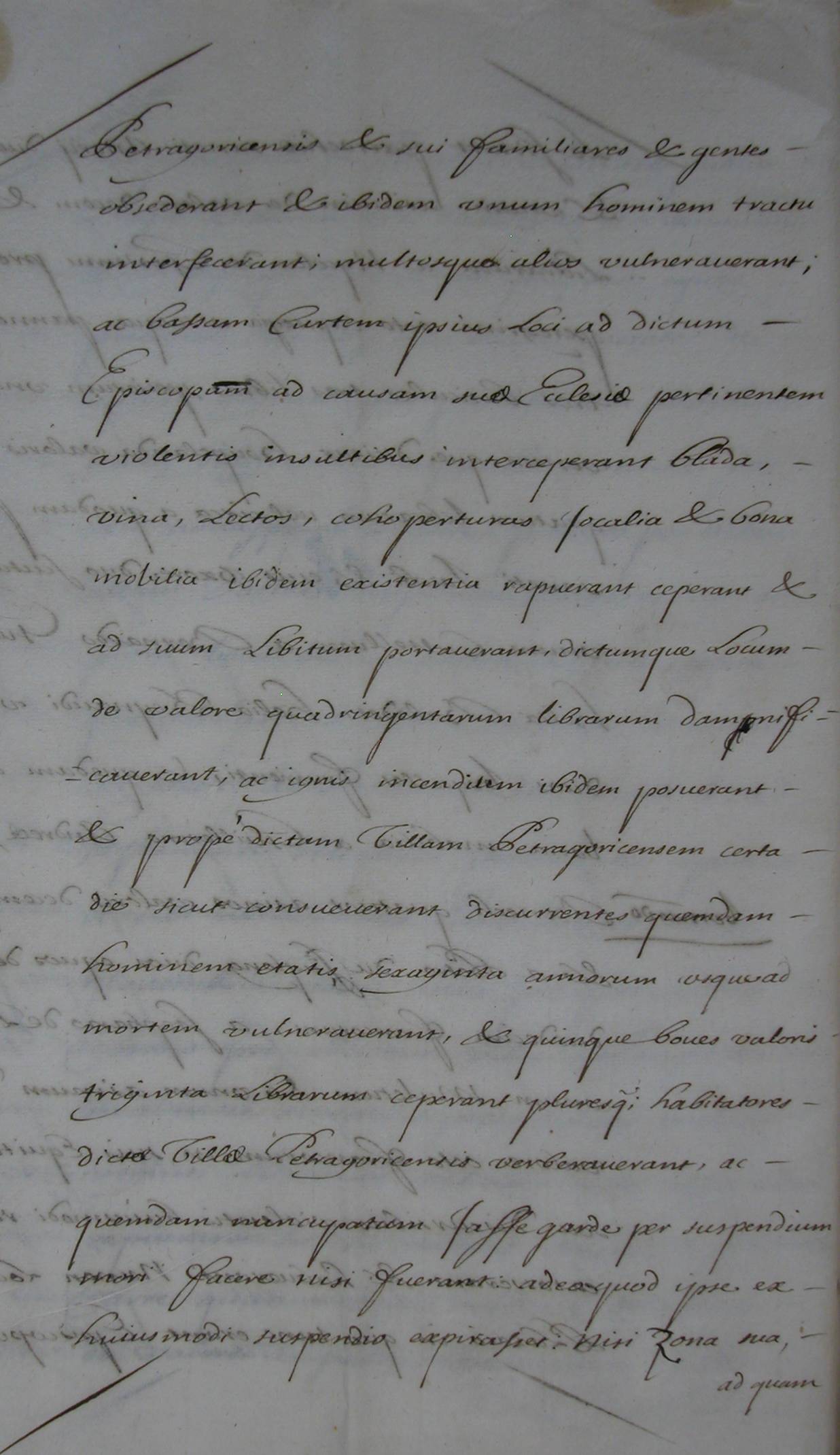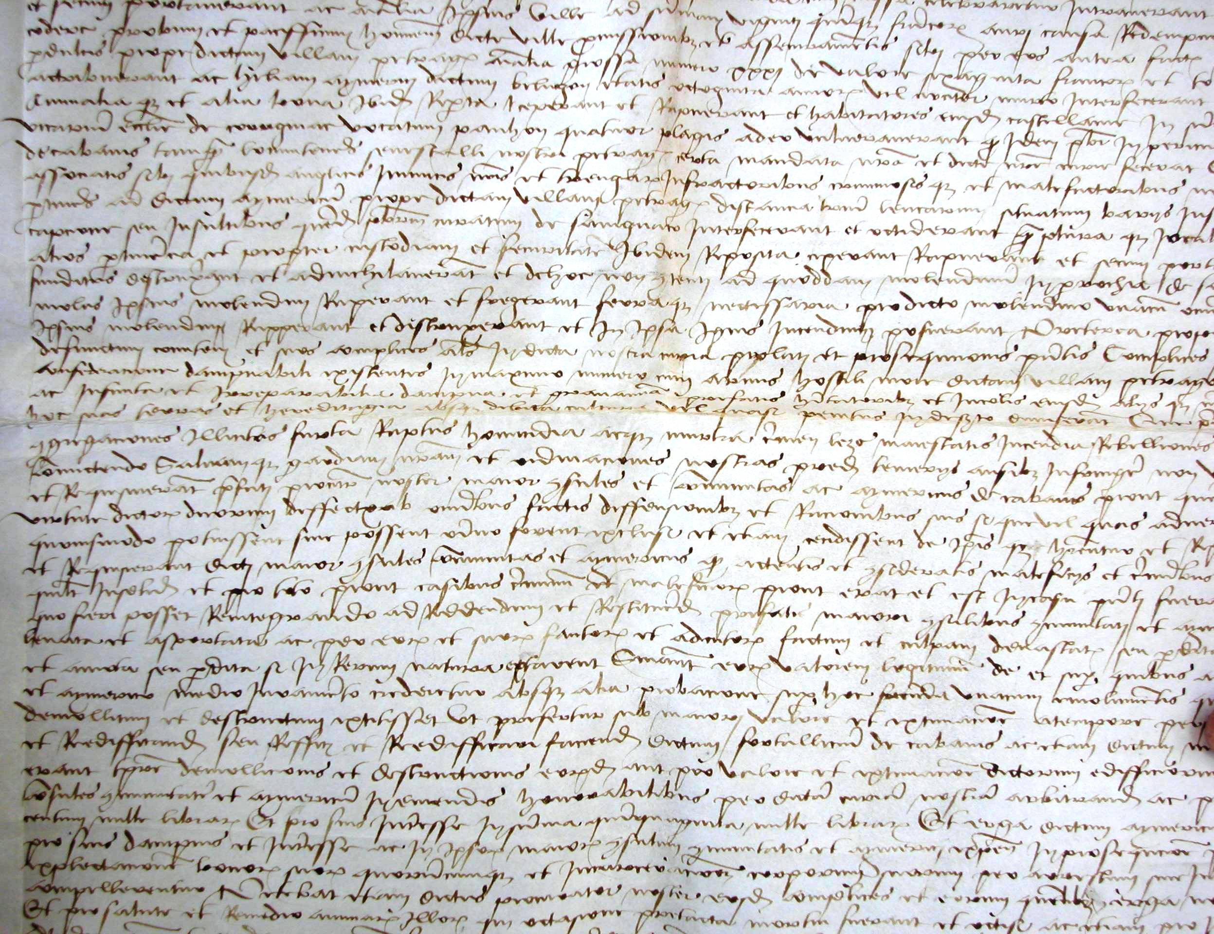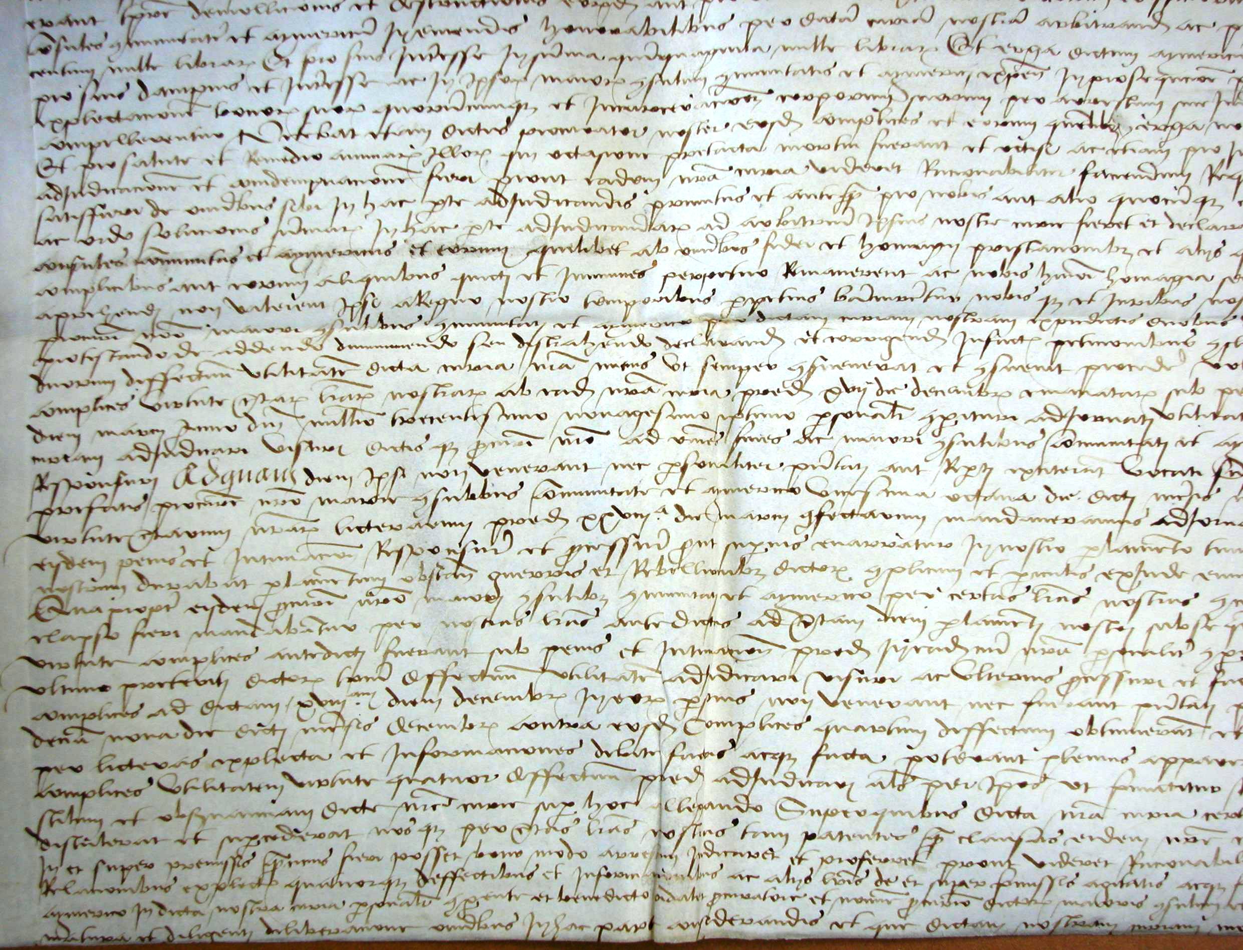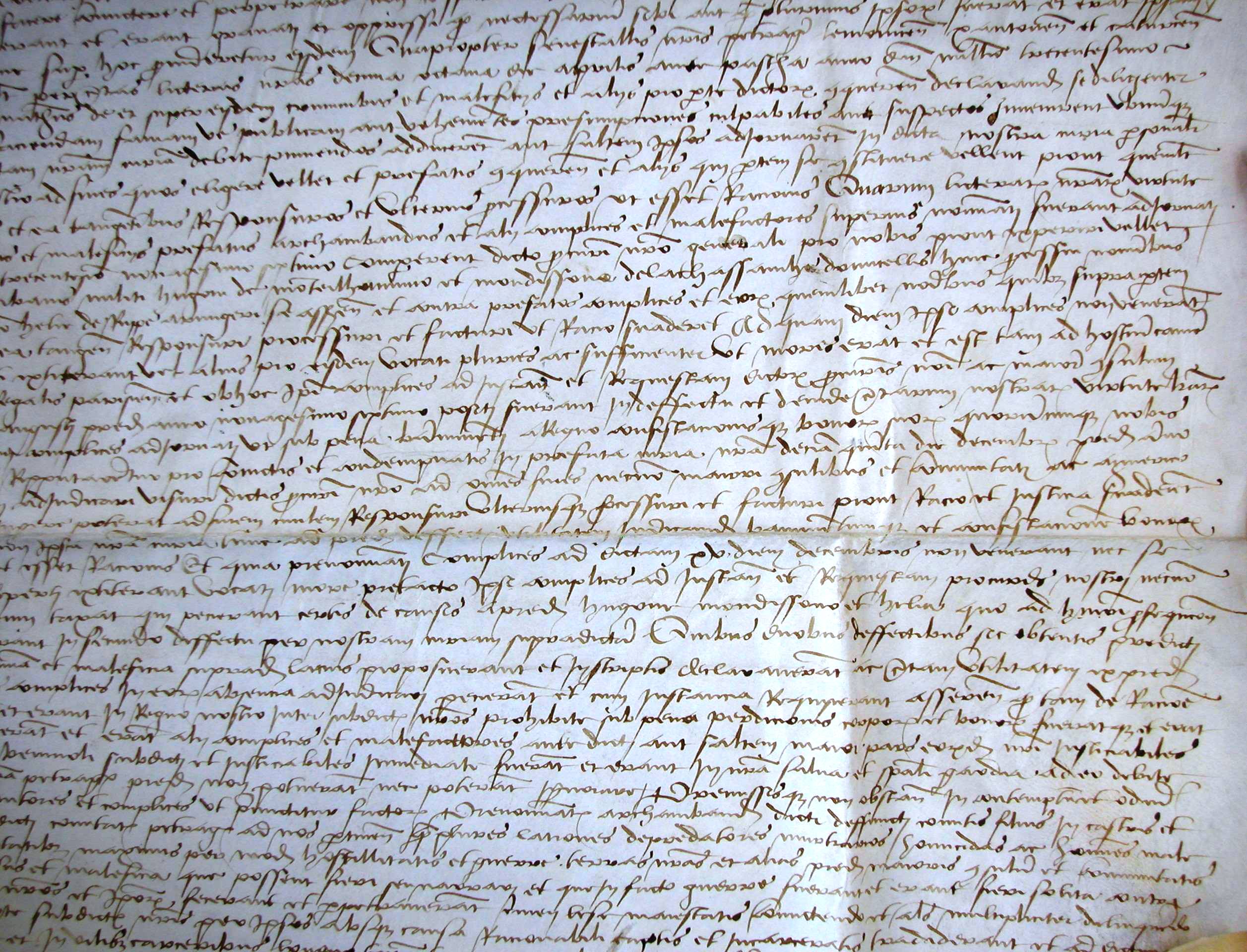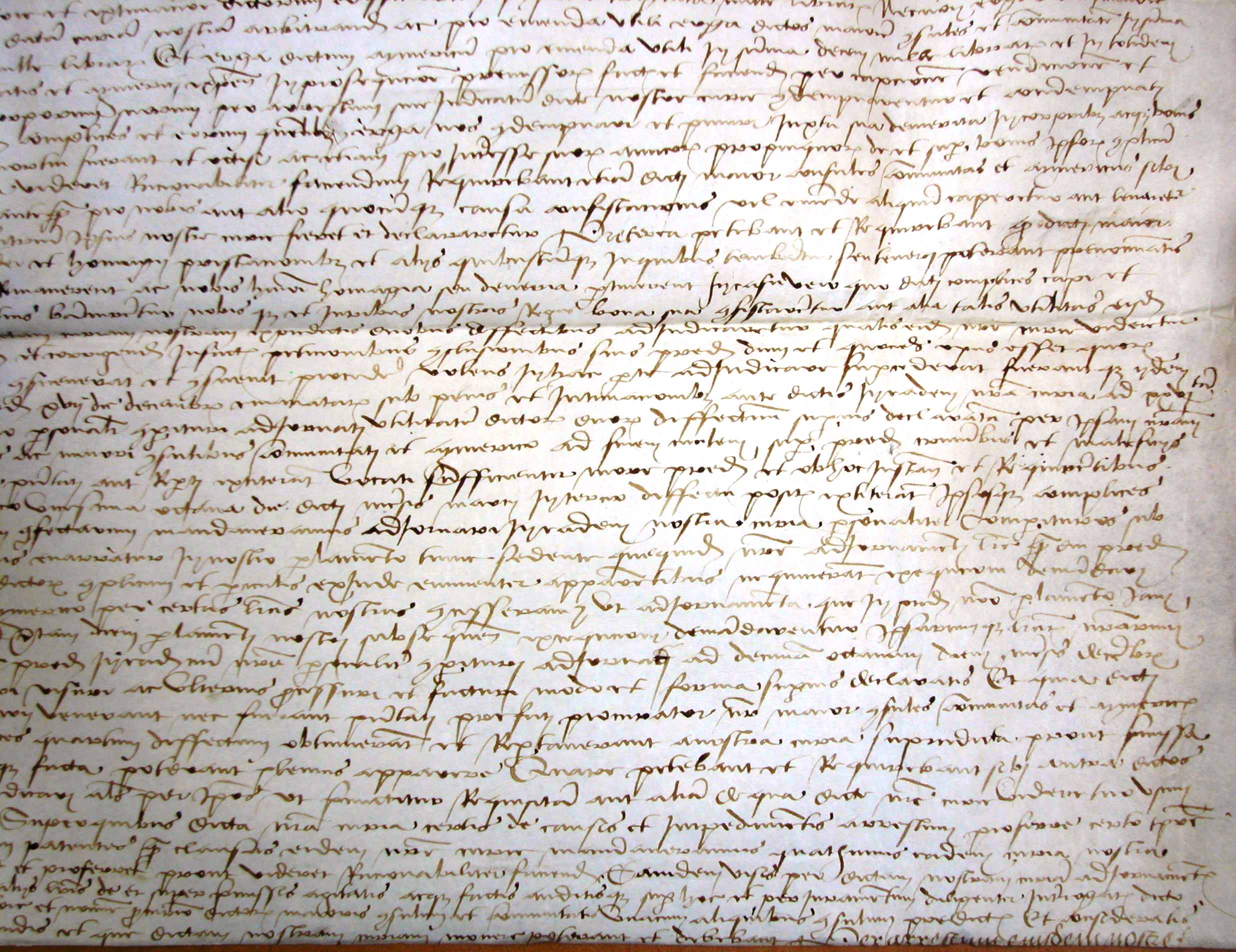 Johannes Tricardi in legibus licenciatus, et locum tenens natus domini senescalli Petragoricensis, notum facimus universis has presentes litteras inspecturis, nos hodierna die infrascripta ad instantiam et requestam egregii et potentis domini Alani, domini de Lebreto, comitis Petragoricensis, vicecomitisque Lemovicensis, et Tartasis, ac domini de Avenis in presentia discretorum virorum magistrorum Petri Baillivi, et Johannis de Pelisses in legibus licenciati advocati, et procuratoris domini nostri Regis in senescallia Petragoricensi vidisse, tenuisse, palpasse et legisse de verbo ad verbum et per notarios et scribas dictae curiae infra scriptos transcribi fecisse quasdam patentes litteras in duplici cauda et cera crocea, ut prima facie apparebat in pendenti sigillatas, non rasas, non viciatas, non cancellatas, nec in aliqua earum parte suspectas, sed prorsus omni vicio et suspicione carentes, quarum tenor talis est : Karolus Dei gratia Francorum Rex, universis presentes litteras inspecturis, salutem. Notum facimus, quod nos de registris criminalibus nostre parlamenti curie extrahi fecimus quoddam arrestum in eadem nostra curia decima nona die julii, anno Domini millesimo tricentesimo nonagesimo nono datum seu prolatum, cuius tenor talis est :ex parte procuratoris nostris generalis pro nobis et dilectorum nostrorum maioris, consulum et communitatis ville et civitatis nostre Petragoricensis : necnon Aymerici de Cabanis militis actorum, contra Archambaudum de Petragorico, Arnaldum Durac capitaneum de Bourdeilhe, Johannem Cotet capitaneum de Alba Ruppe, Bos de Chambrilhac, Bertrandum de Lagandilhie, magistrum Guillermum Jaubert, Leonardum de Ponte, Raymundum Gunbaud, Oliverium Mercuri clericum Mureti, quendam vocatum Cossandum, quendam vocatum Phelippot, quendam vocatum Bastide, Johannem Normani, Bernardum de Sancto Petro generem Bernardi de Massant, Thomelinum Delage, quemdam vocatum Verdoyce, quemdam vocatum Tire-Agulhete, Johannem Du Rat, Perrotum Marches, Vidalotum Marches, Alanum Marches, quemdam vocatum Colet, Bernardum de Massant, Maronem de Ferrezaco, quemdam vocatum Nucay, quemdam vocatum Ramonet, Mondonum Dale, Robinetum Legrasset, Bernardum de Massant, Maronem de Ferrezaco, quemdam vocatum Grungadie, quemdam vocatum Gironnet, Mondonum famulum clerici Mureti, quemdam vocatum Leboure de Sancto Petro, Johannem Barbe de Bone, quemdam vocatum Nandin, quemdam vocatum Lorans, Robinum Le Clergon, Bernardum de Morteriis, Johannem Damouretes, Guillermum Leblonde, quemdam vocatum Finet, Martinum Lespagnol, quemdam vocatum Guilhams, Johannem Gumel, Jacobum Balisterii, quemdam vocatum Guilhamin, Perrotum Escalle, Hennequinum A La Poulanie, Guilhotum Cournaguerre, Gailhardetum de Larcherie, Menautonum de Ponte, Guillermum et Rampicoulz de Villeboys, Mondonum Francisci, Johannem Normani, Johannem de Labernardie, quemdam vocatum Le Camus, Johannem Balisterii, quemdam vocatum Maudicot, Johannem Morelli, Johannem de Sancta Fide, quemdam vocatum Denis, Perrotum Britonis, Andoynetum capitaneum de Fossamaigne, et Martialem Balisterii complices et malefactores in hac parte, fuit in nostra parlamenti curia in ipsorum complicium abtencia propositum nobis alias pro parte dictorum maioris, consulum et communitatis expositum fuisse graviter conquerendo, quod cum certus processus alias motus fuisset et penderet in eadem nostra curia inter ipsos conquerentes dicto procuratore nostro secum adjuncto actores ex una parte; et defunctum Archambaudum quondam comitem Petragoricensem, ac nonnullos alios ejus confederatos seu complices defensores ex altera, occasione plurium et diversorum criminum, excessuum et maleficiorum horribilium et detestabilium per eosdem Comitem et ejus complices in partibus Petragoricensibus dampnabiliter commisorum et perpetratorum.Et super hoc in tantum processum fuisset, quod per arrestum dicte nostre curie dicti Comes et sui complices fuerunt erga dictos conquerentes in certis emendis condempnati et a regno nostro perpetuo banniti, eodem comitatu Petragoricensi nobis confiscato et penitus acquisito, prenominatus Archambaudus filius dicti defuncti comitis noster vassalus et subditus, suique complices et fautores in fortaliciis de Montinhaco, de Alba Ruppe, de Bordeilhe, et de Roucille, ac in aliis locis per ipsum Archambaudum detentis manantes et conversantes in odium et contemptum dicti arresti ante et post prolationem ipsius contra nostras ordinationes regias, per quas omnes guerre et vie facti inter nostros subditos sub pena perditionis corporum et bonorum notorie prohibentur quamplures equitatus, guerras, murtra, homicidia, et alia crimina et maleficia, interveniente juvamine et associatione nonnullorum anglicorum, et aliorum nostrorum et regni nostri innimicorum contra villam et civitatem nostram Petragoricensem, et habitatores ejusdem, et suarum pertinentiarum, necnon contra quamplures nostros subditos et villas dicte patrie Petragoricensis fecerant, commiserant et perpetuaverant, ac facere, comittere et perpetrare non cessabant temere et injuste in prejudicium, dampnum et destructionem rei publice dicte patrie, dictorumque conquerentium, qui propter hoc taliter fuerant et erant gravati et oppressi, quod necessarium sibi aut quamplurimis ipsorum fuerat et erat ipsam patriam omnino relinquere, et alibi se transferre, nisi de remedio iustitie super hoc provideretur eisdem. Quapropter senescallis nostris Petragoricensi, Lemovicensi, Xantonensi et Caturcensi, ceterisque justiciariis nostris, aut eorum locatenentibus, et eorum cuilibet per certas litteras nostras decima octava die aprilis ante Pascha, anno Domini millesimo trecentesimo nonagesimo sexto a nobis obtentas mandaveramus committendo, quathenus de et super eisdem criminibus et maleficiis, et aliis pro parte dictorum conquerentium declarandis, se diliginter et secrete informarent, et quos de ipsis per informationem factam seu faciendam, famam vel publicam, aut vehementes presumptiones, culpabiles, aut suspectos invenirent, ubicu