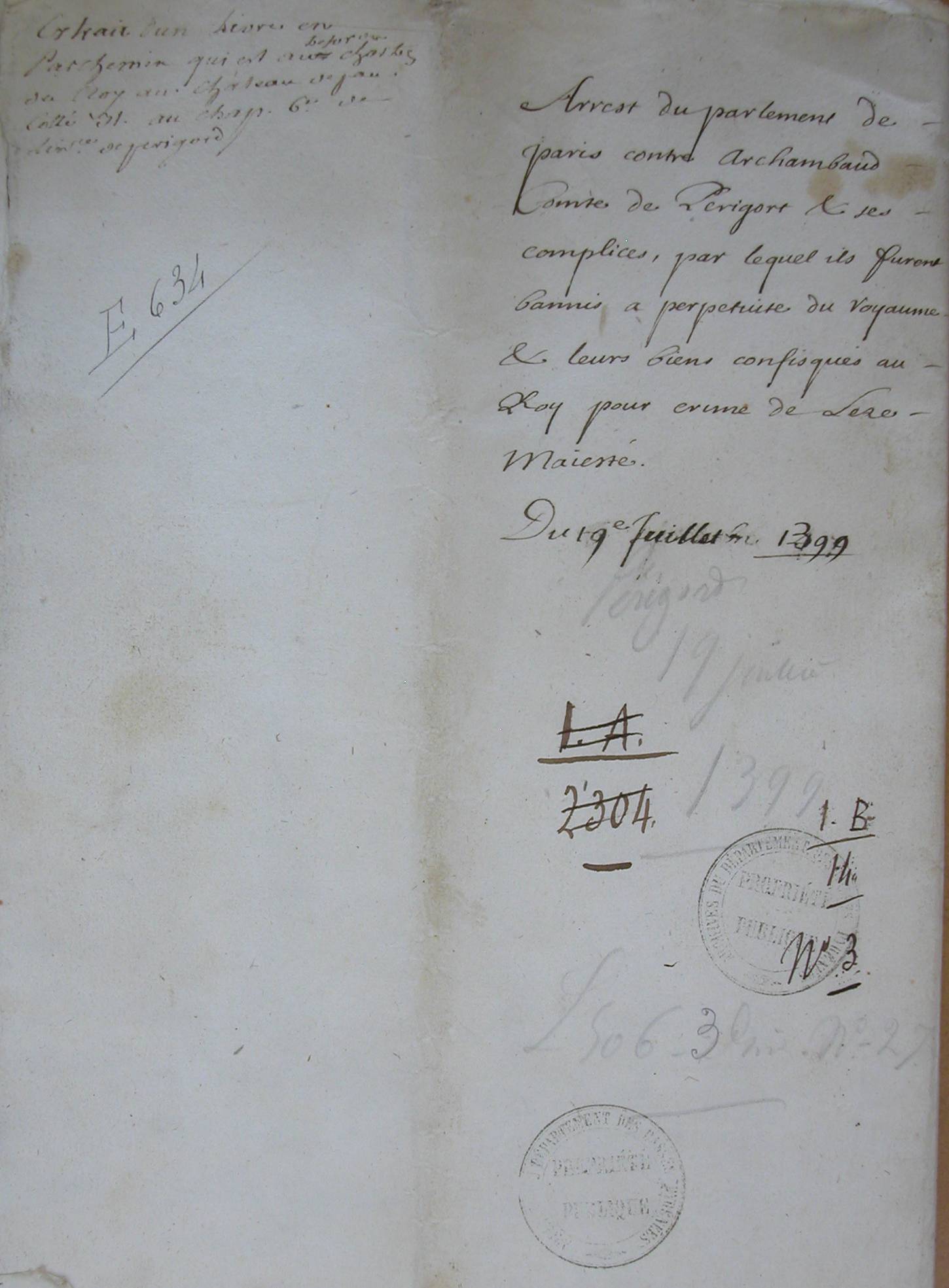 - enregistré sous la cote n° 31 du chapitre 6 (arrêts et sentences judiciaires) dans l'inventaire de Jean Fabre en 1546, (registre E 607 aux AD 64), sous le résumé suivant: "Vidimus de l’arrêt donné en la Cour de Parlement de Paris contre Archambaud comte de Périgord fils de autre Archambaud aussi comte et ses complices pour plusieurs crimes, délits et excès par eux commis, à plein mentionnés audit arrêt, par lequel furent condamnés à 40.000 livres d’amende envers les consuls de Périgueux et à 15.000 livres d’amende envers Aymeri de Cabanis et bannis du royaume de France et tous et chacuns leurs biens pour cause de lèse-majesté, confisqués par le roi, prononcé die decima nona julii 1399"