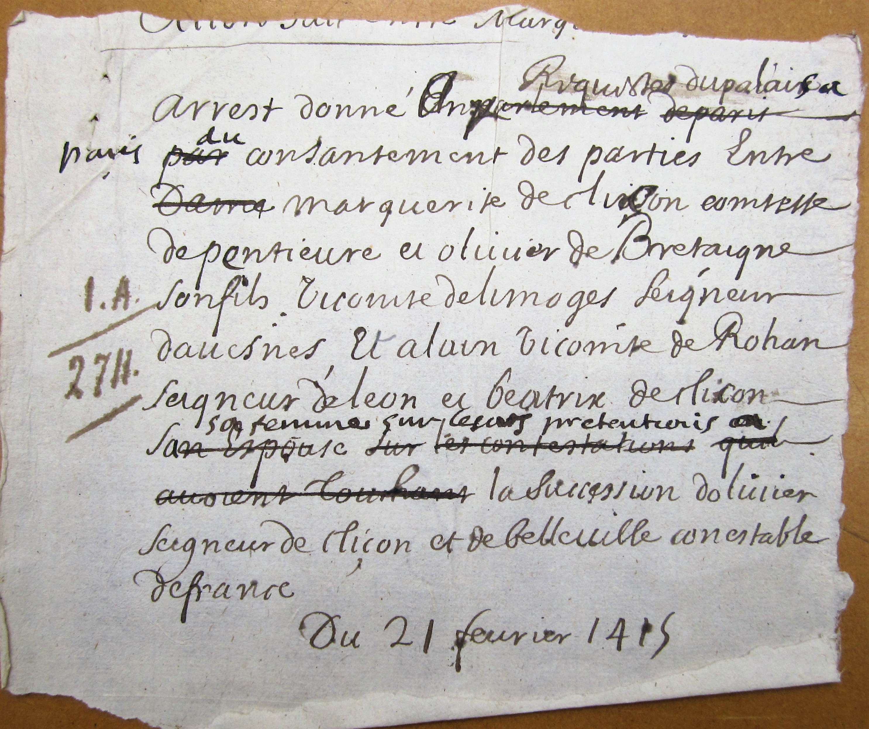 (copie) donné aux Requêtes du Palais entre Marguerite de Clisson,