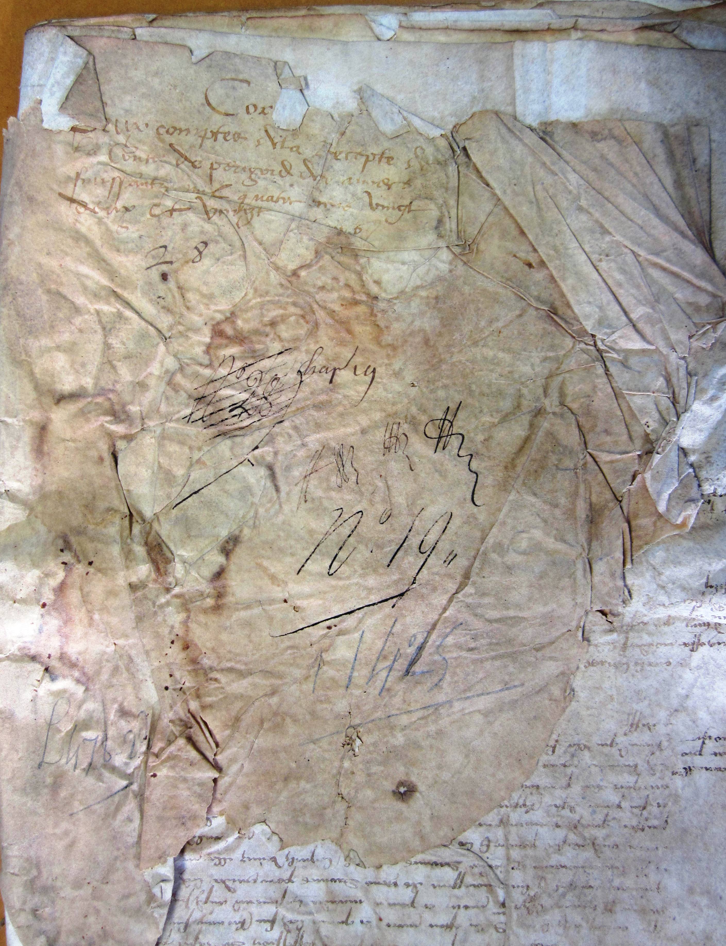 1424-1425. Compte de Girault de Bonnys, receveur du domaine de Périgord pour le duc d'Orléans : gages de Girard Baille, juge ; Pierre de Berdalon, procureur du comté de Périgord ; Mainfroy de Salignac, capitaine de Montignac ; Regnauld Servot, capitaine d'Auberoche ; Raymond Pauste, capitaine de Bourdeille ; Hélie Chabrol, juge d'appel ; façon d'échelles pour monter dans la tour du château de Montignac, etc.