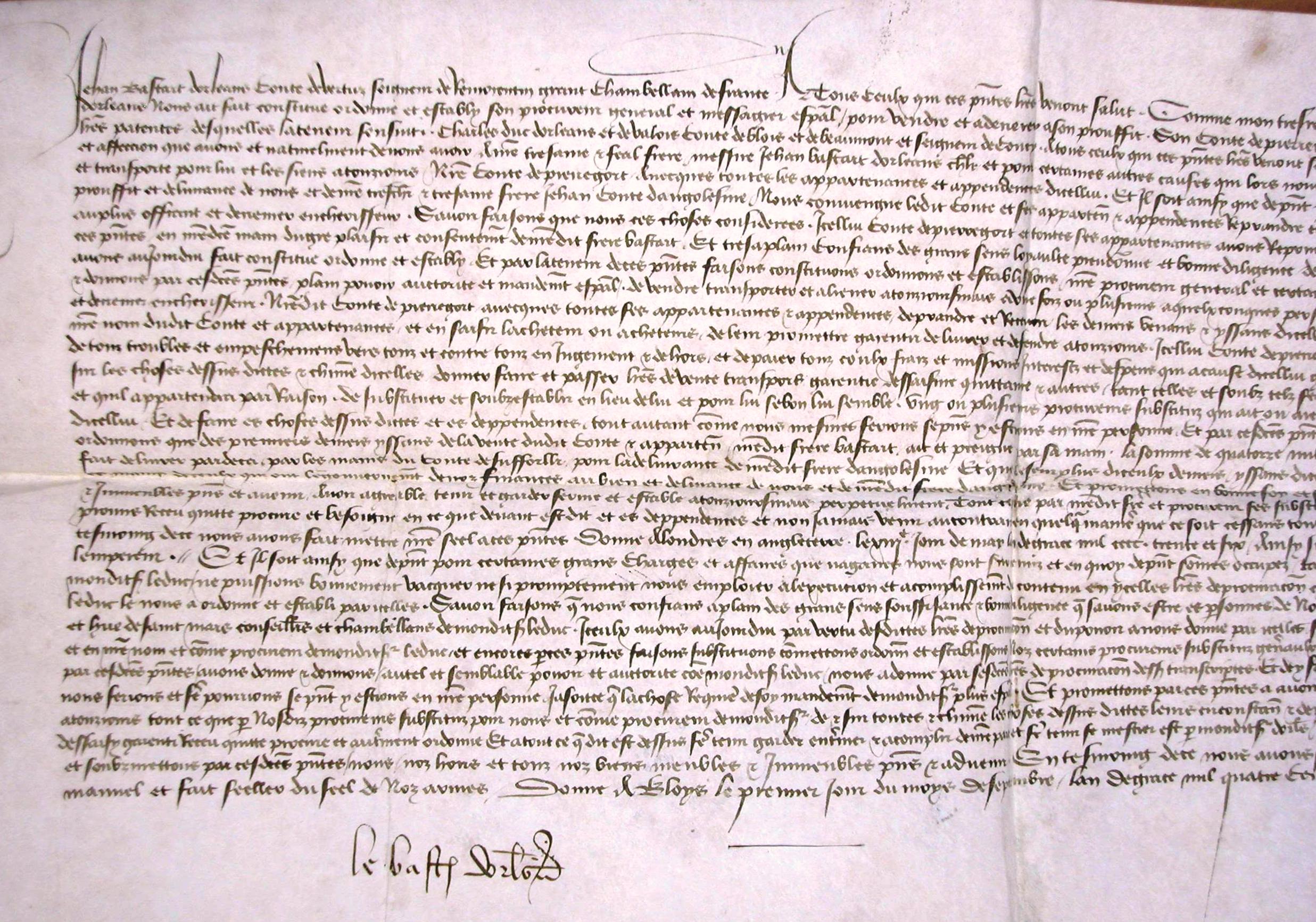 Vente au plus offrant du comté de Périgord (signature autographe du bâtard d'Orléans)