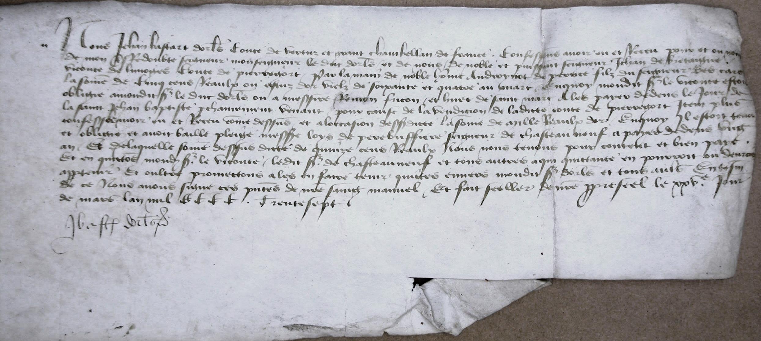 Quittance donnée par le bâtard d'Orléans à Jean de Bretagne, vicomte de Limoges, pour la vente du comté de Périgord (signature autographe du bâtard d'Orléans)