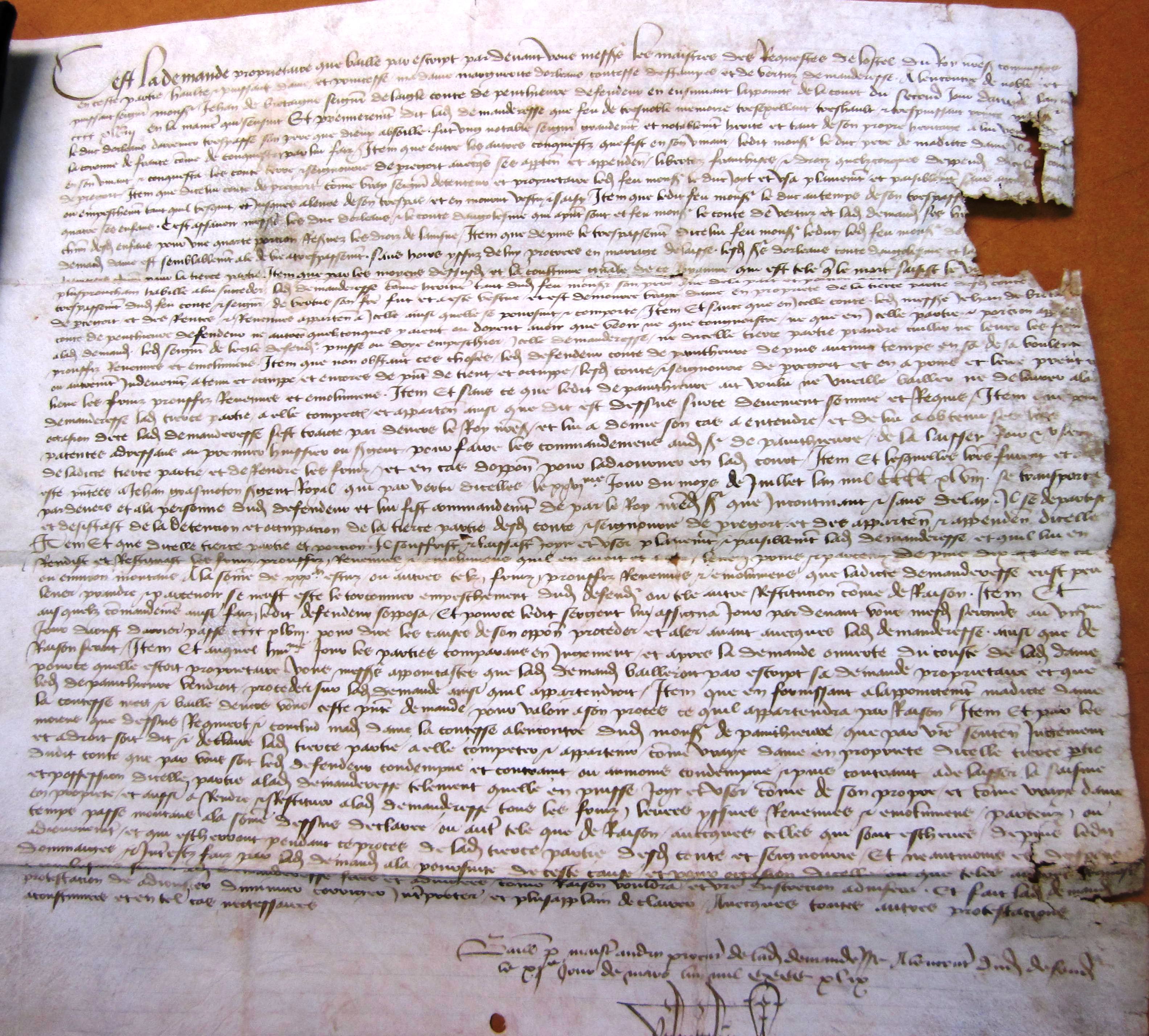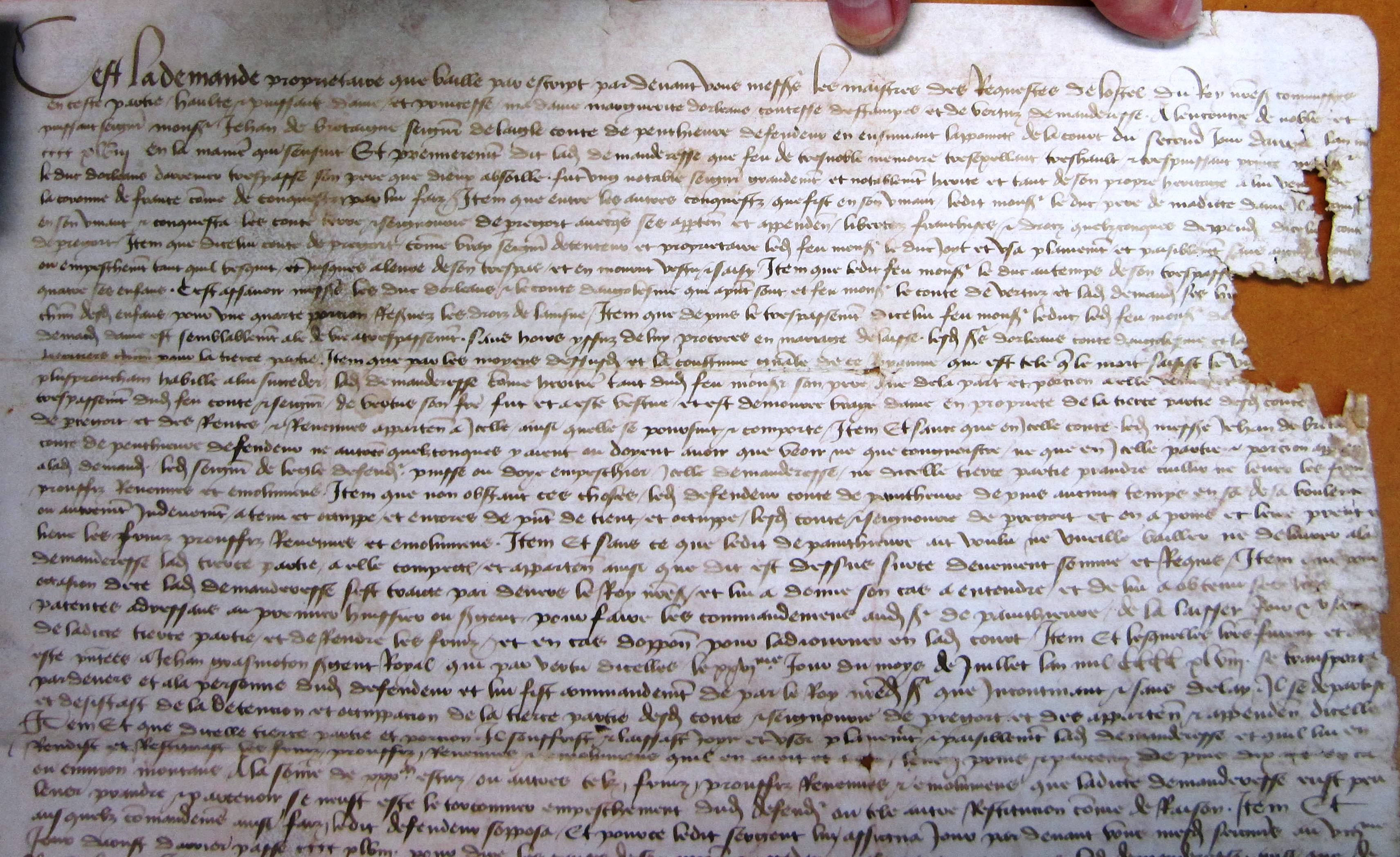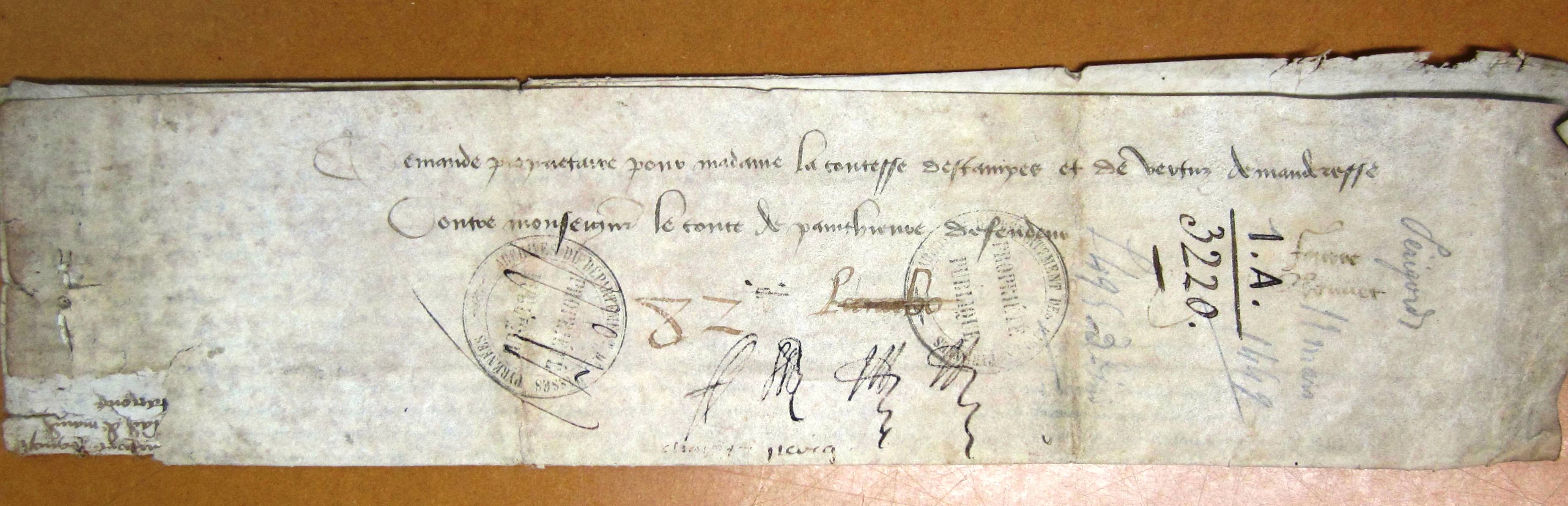 Demande par Marguerite d'Orléans, comtesse d'Etampes et de Vertus, contre monseigneur le comte de Penthièvre, touchant le comté de Périgord (1448-1449).