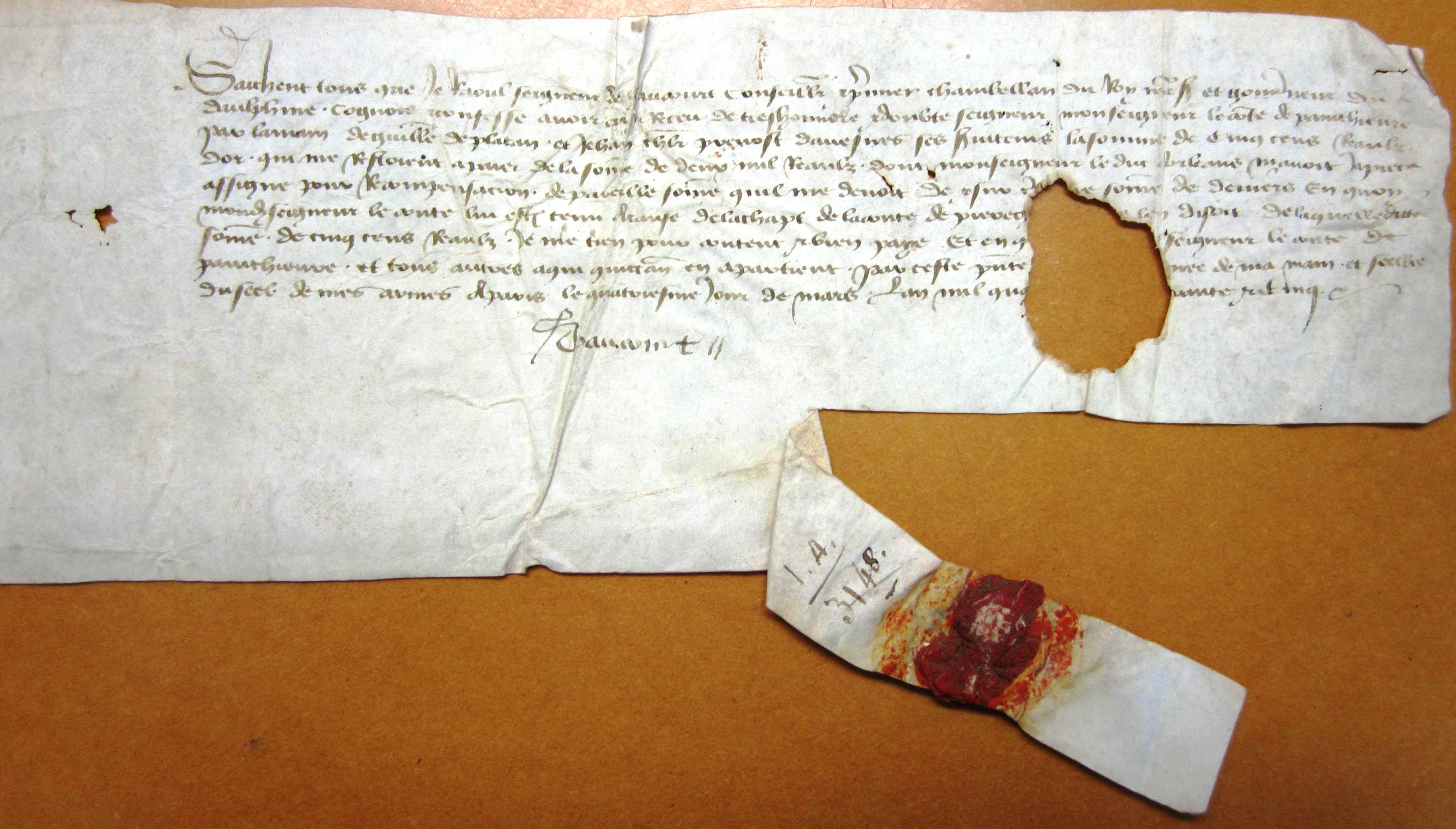 Quittance par Raoul de Gaucourt gouverneur du Dauphiné, de 500 réaux reçus du comte de de Penthievre, sur une somme totale de 2000 réaux assignée autrefois par le duc d'Orleans (1445 v. st.).