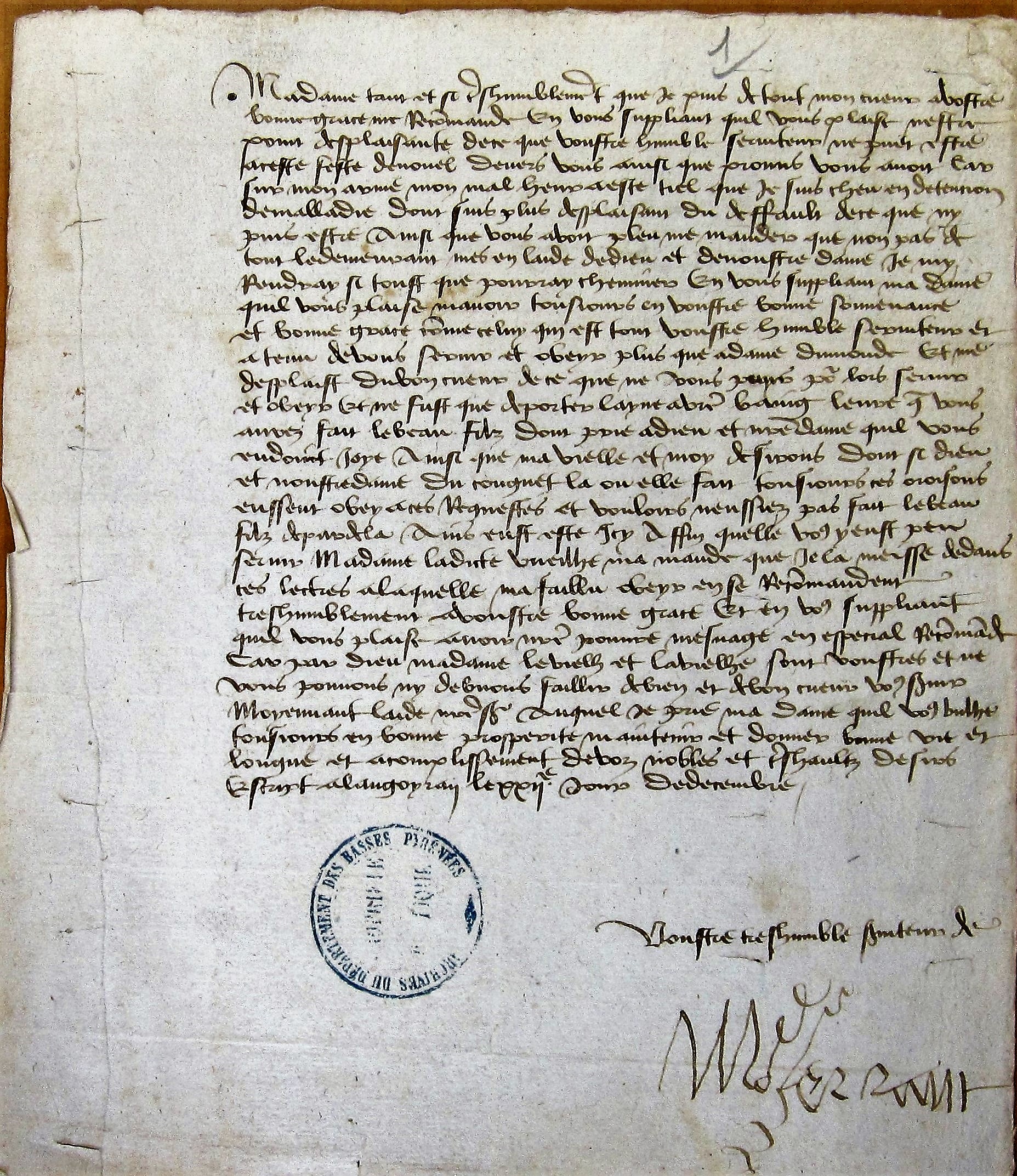 Lettres du sieur de Montferrant à Françoise de Bretagne, comtesse de Périgord : il regrette de ne pas être près d'elle lorsqu'elle accouchera, pour porter l'eau dans son bain