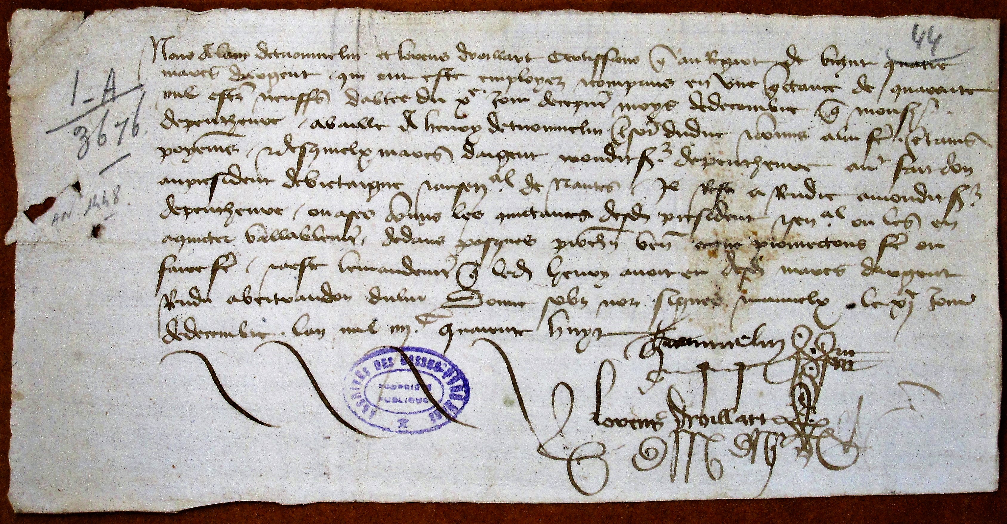 Reçu pour une somme de 24 marcs d'argent issus d'une somme de 40.000 écus baillés par Jean de Bretagne comte de Périgord (1448)