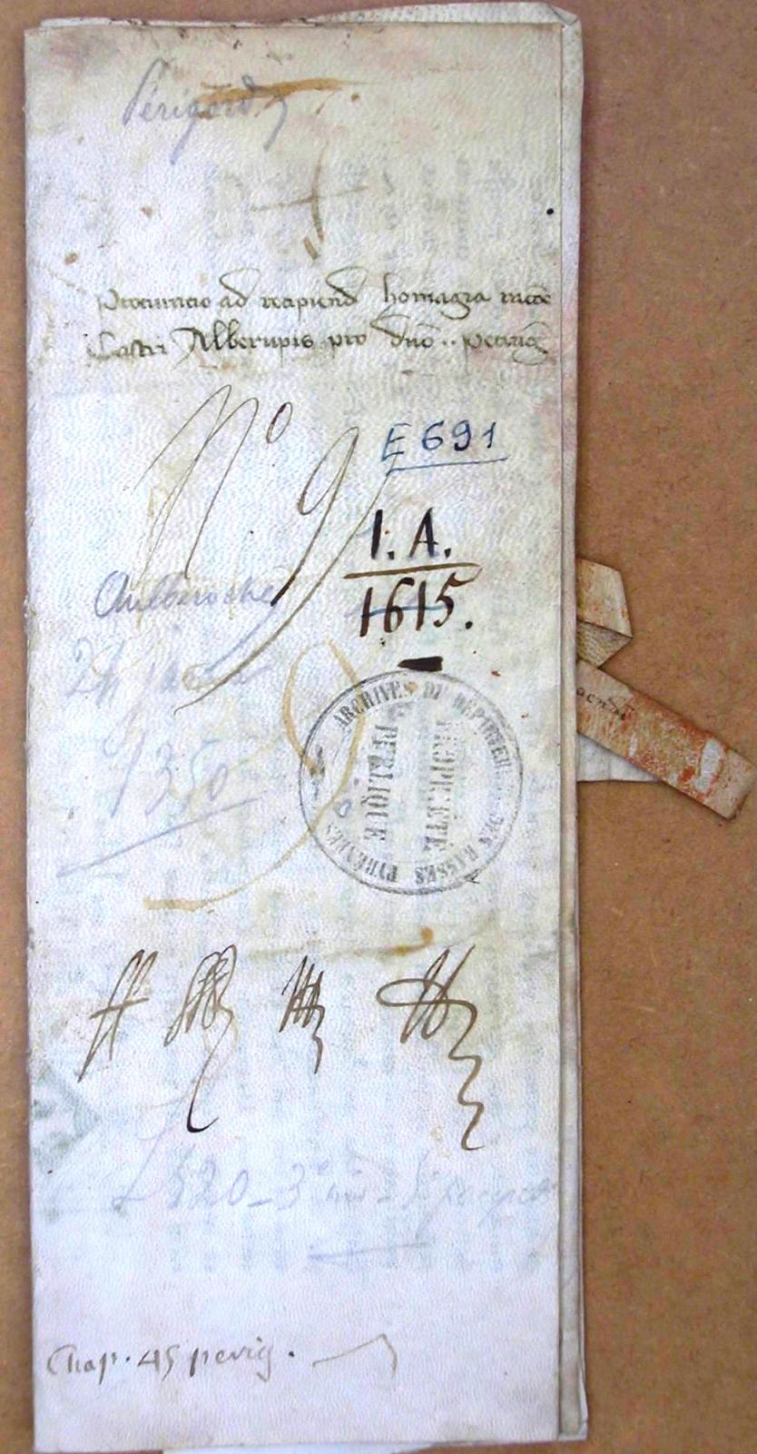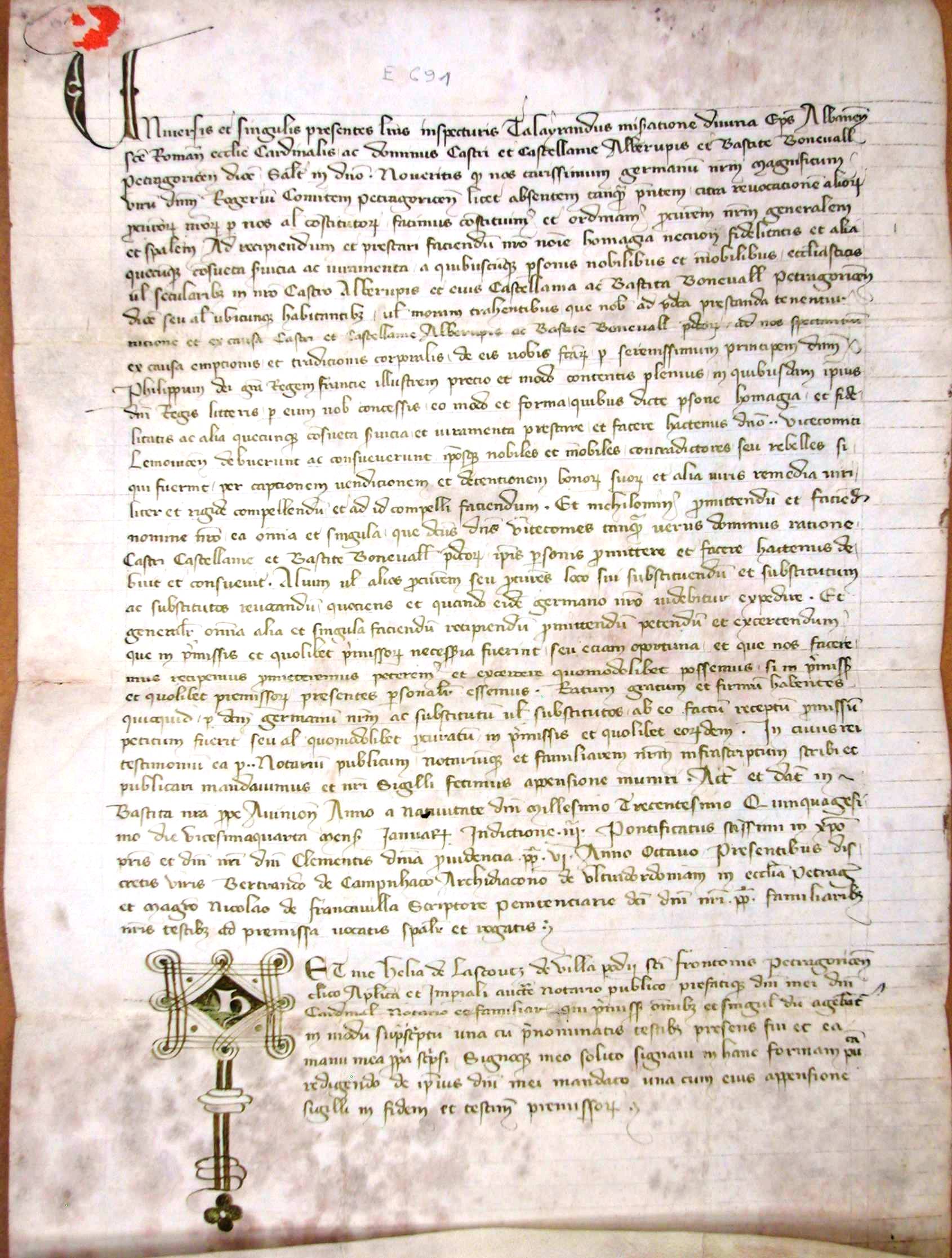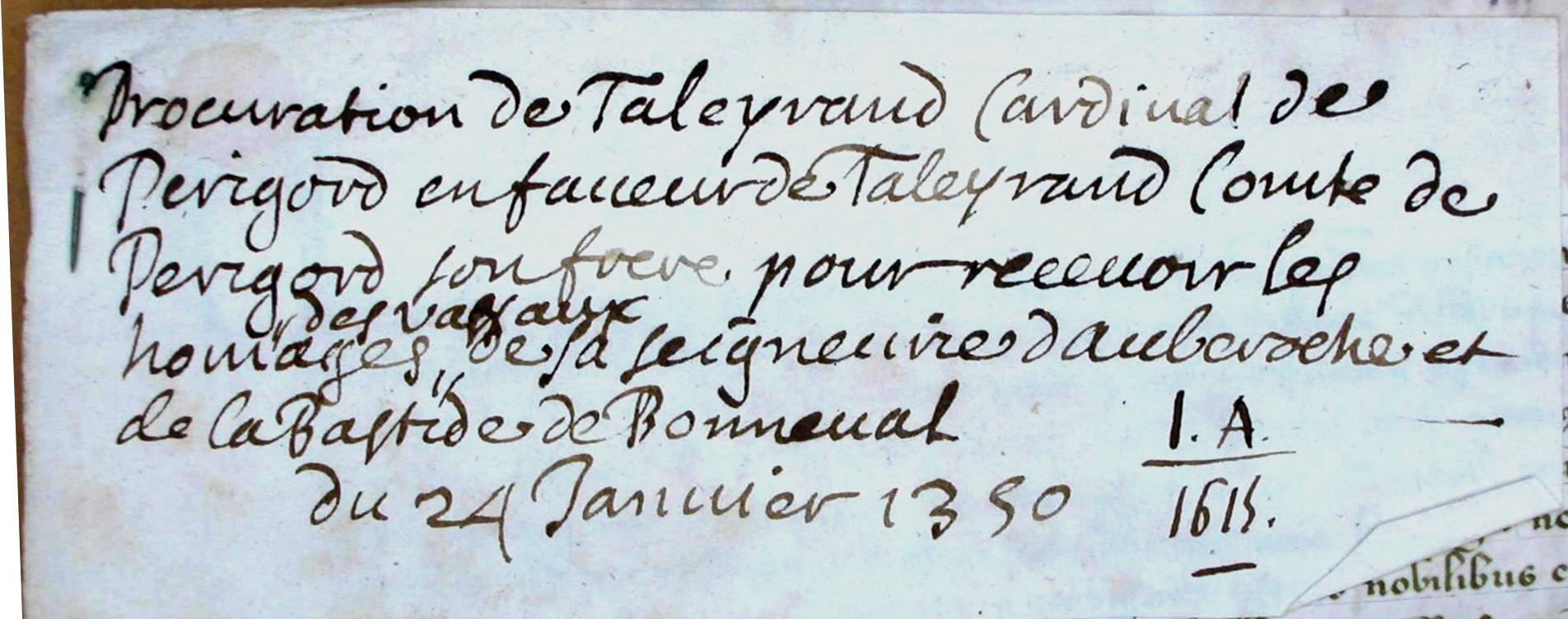 Procuration donnée par Talayrand cardinal évêque d'Albe, et seigneur d'Auberoche et de la bastide de Bonneval, à Roger-Bernard, comte de Périgord, son frère, pour se faire rendre hommage par tous ses vassaux dans les terres d'Auberoche et Bonneval. (1350 v. st.)