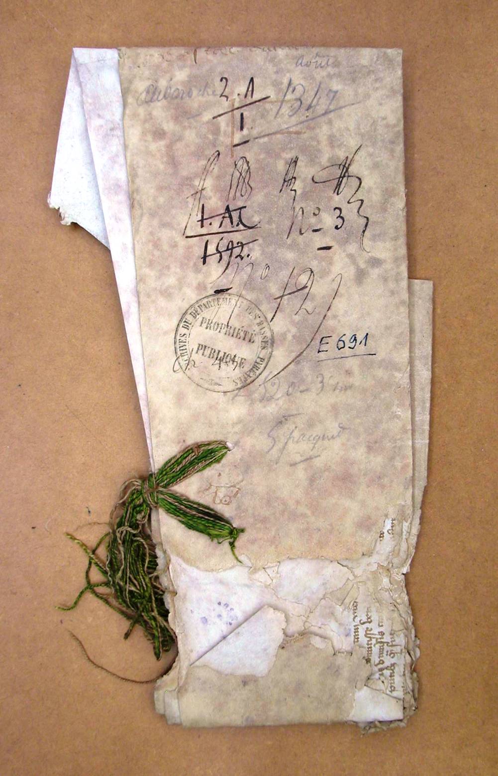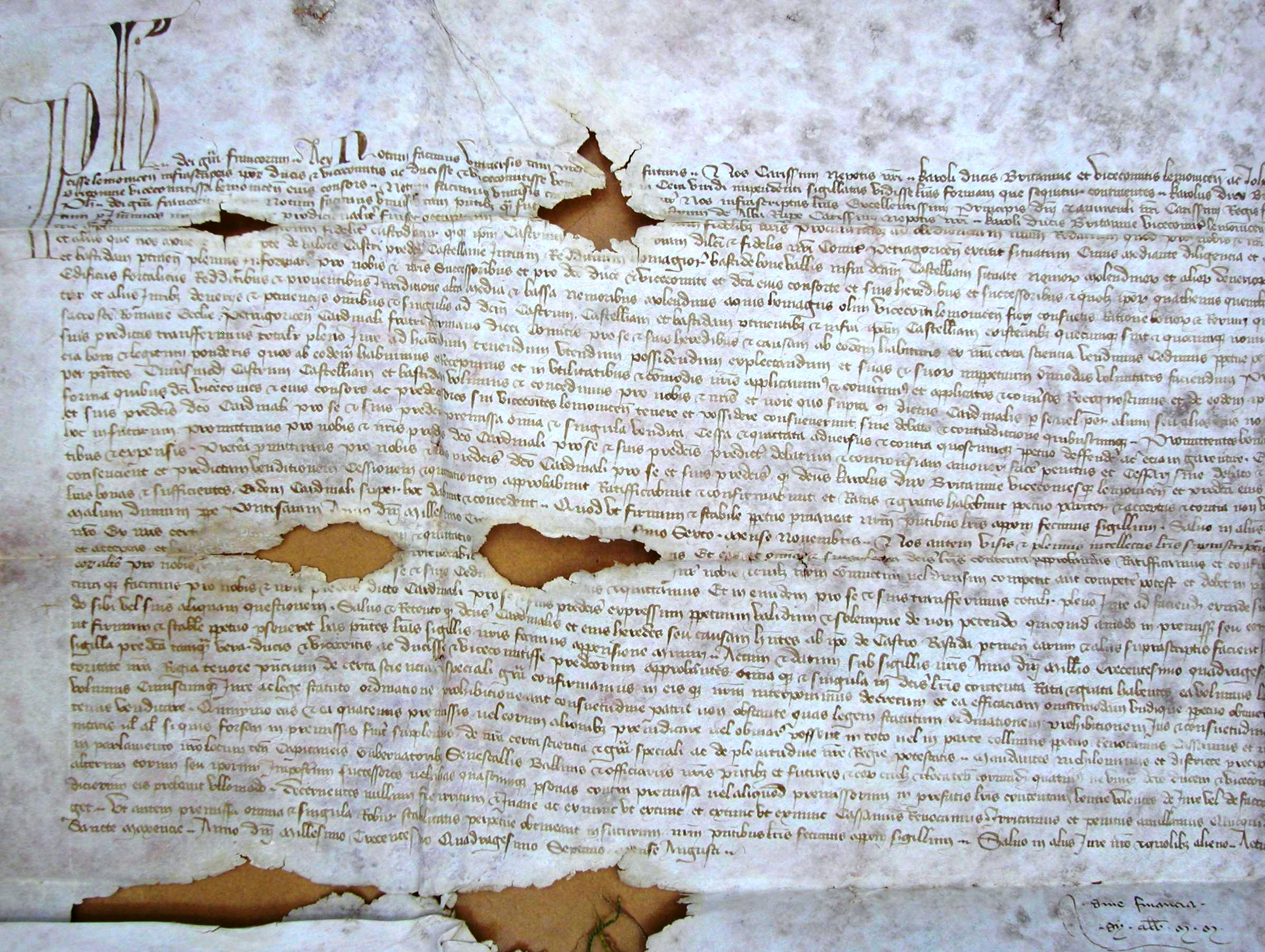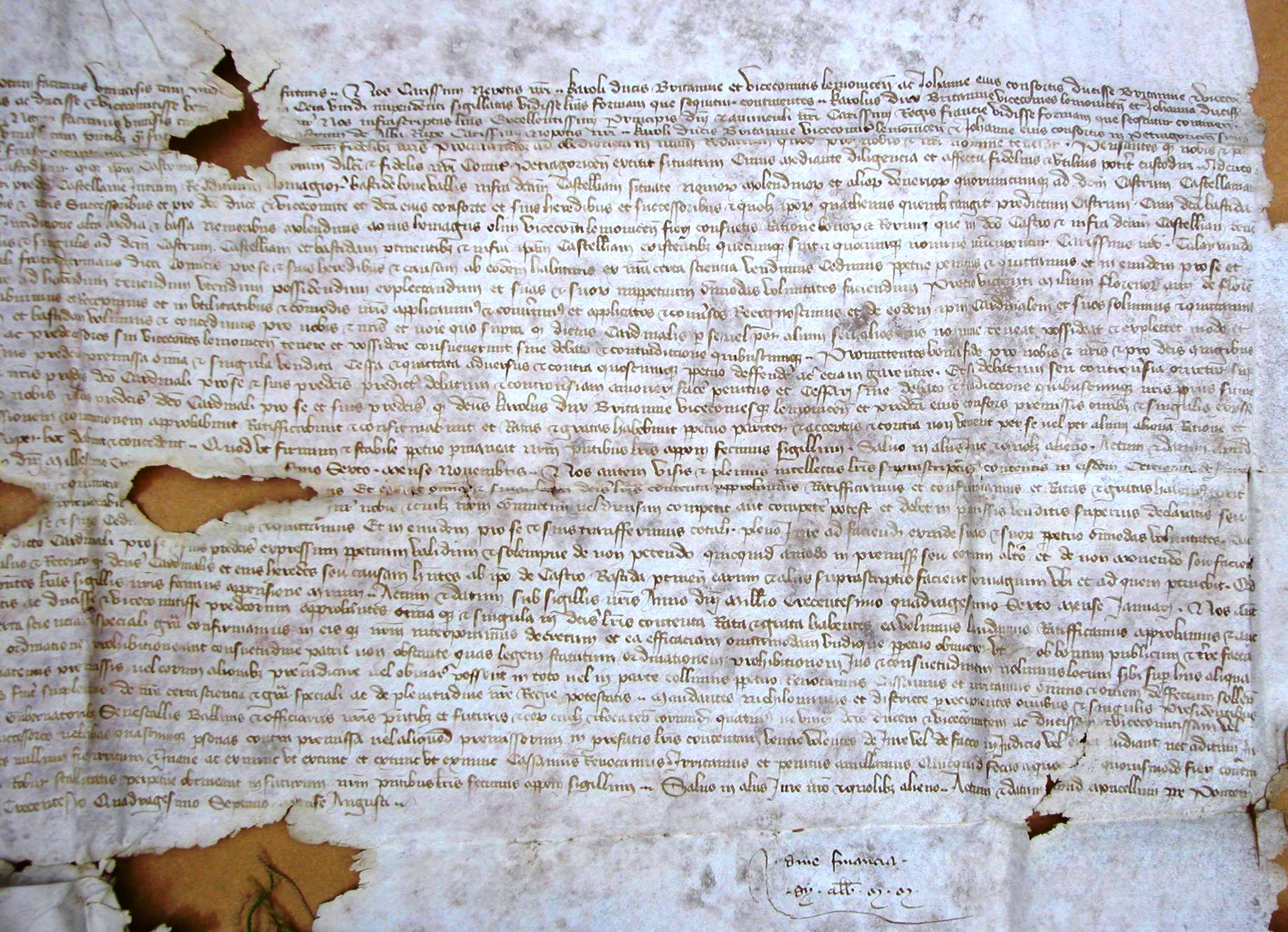 Lettres de Charles de Blois duc de Bretagne et vicomte de Limoges et de Jeanne duchesse de Bretagne, sa femme, par lesquelles ils ratifient la vente de la châtellenie d'Auberoche, faite par le roi au cardinal de Périgord (1347).