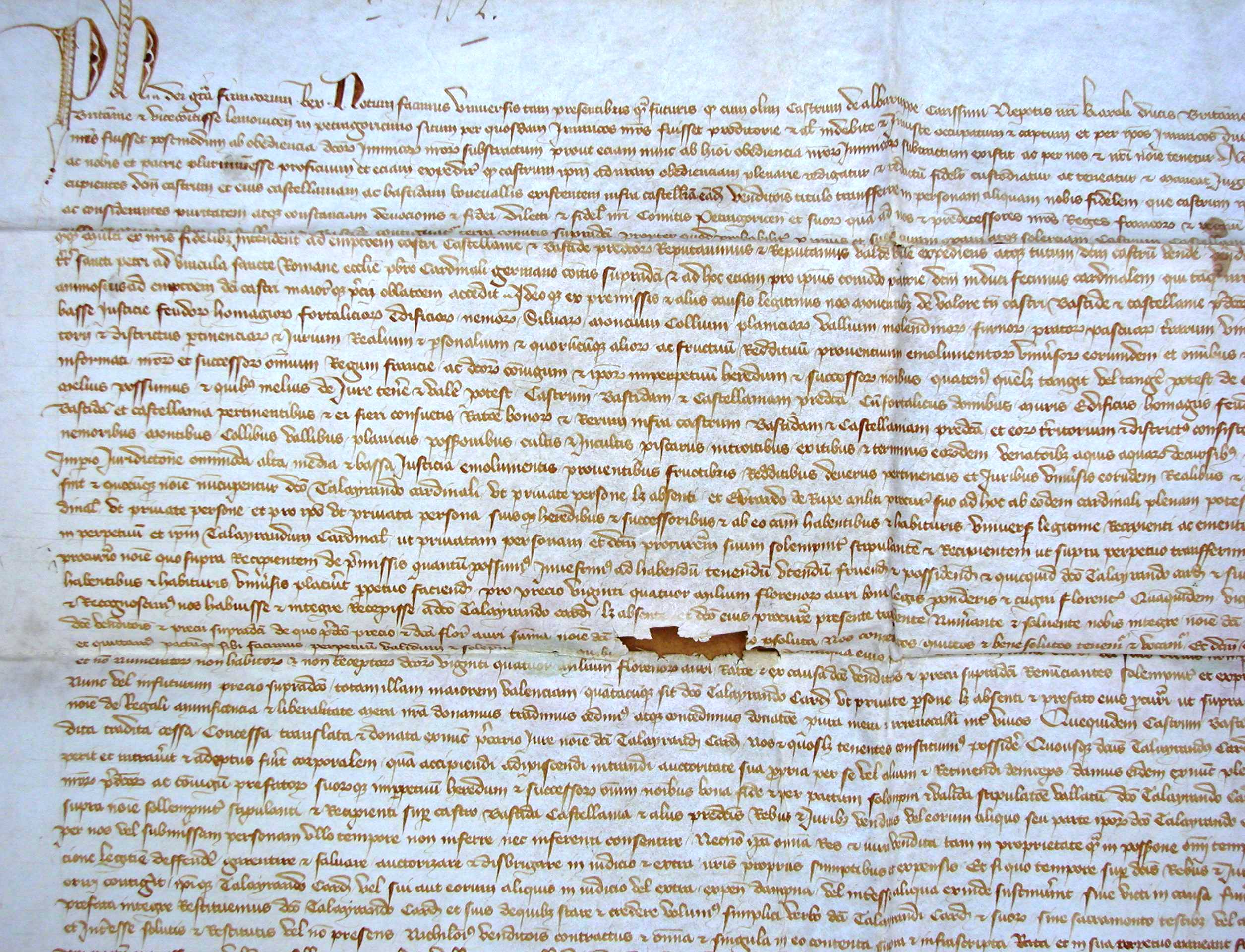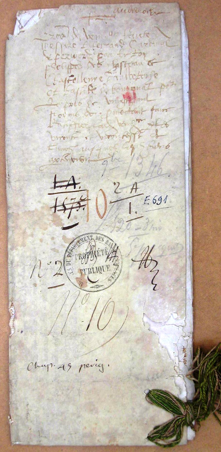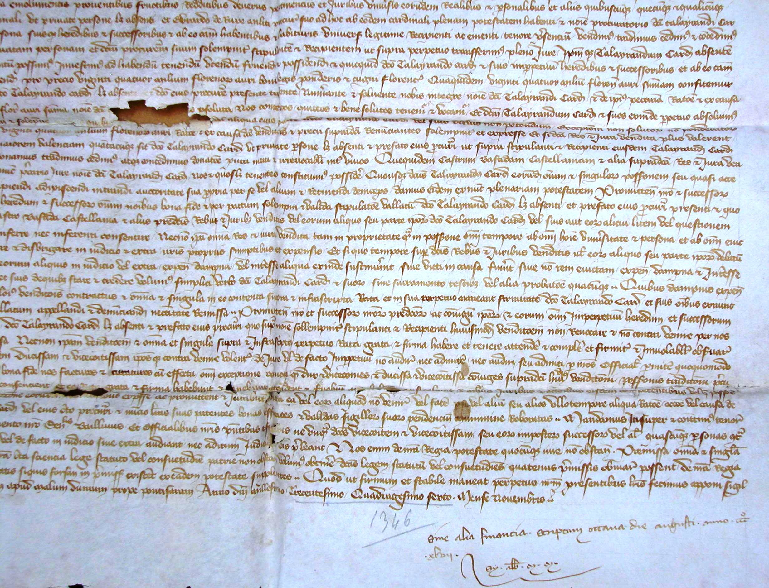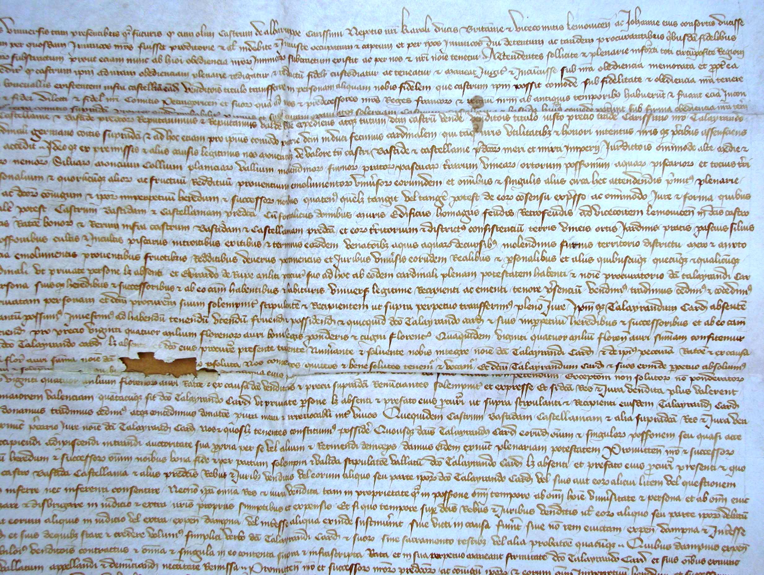 Vente du château d'Auberoche et de la bastide de Bonneval, pour le prix de 24000 florins d'or, promettant de faire ratifier cette vente à Charles duc de Bretagne vicomte de Limoges et à Jeanne sa femme, auxquels la châtellenie d'Auberoche appartenait. (1346)
