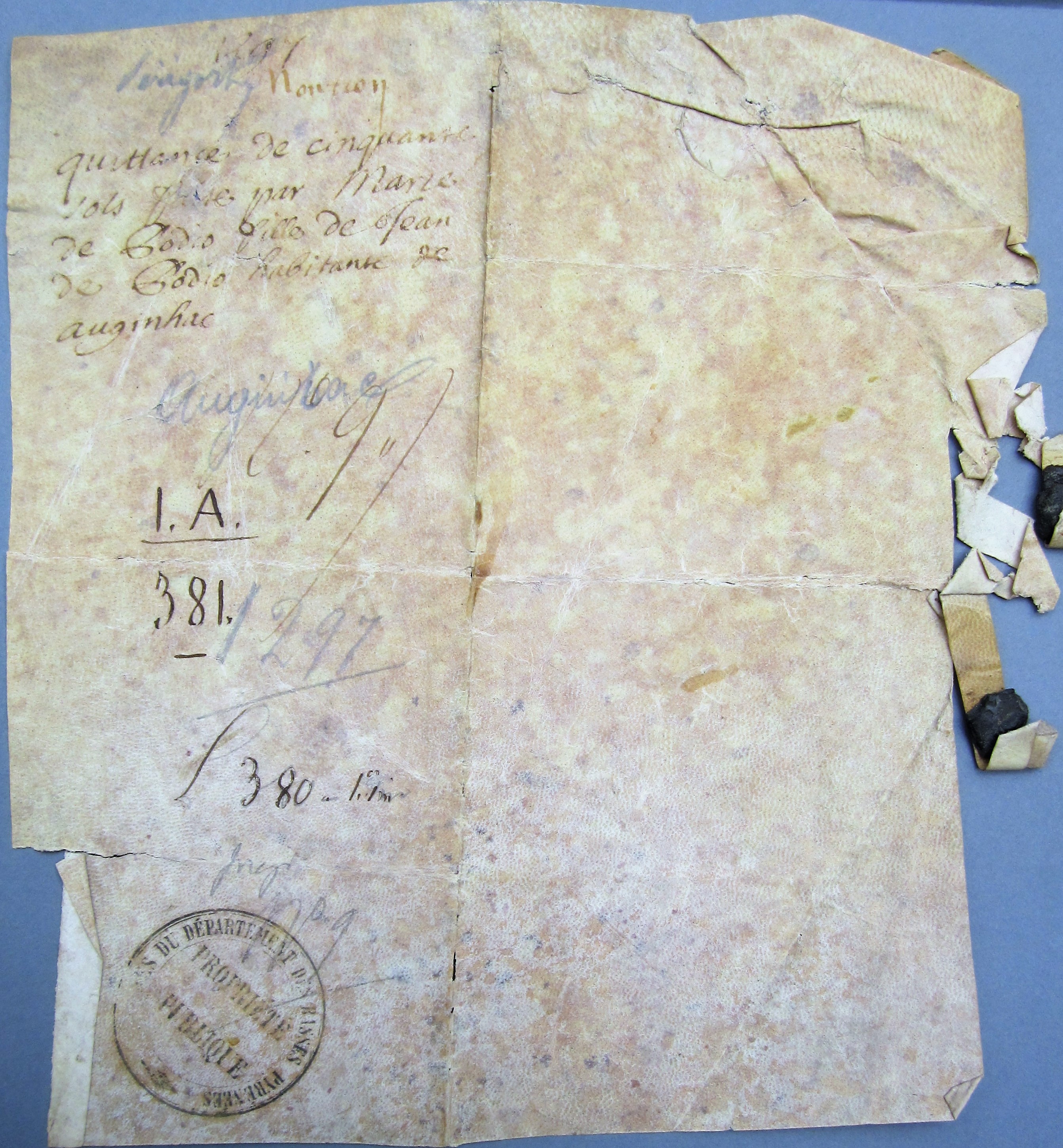 Quittance de 50 sous de Limoges par Marie Du Puy, d'Augignac à Gui de Magnac, pour un legs fait par Guillaume de Magnac (1297)