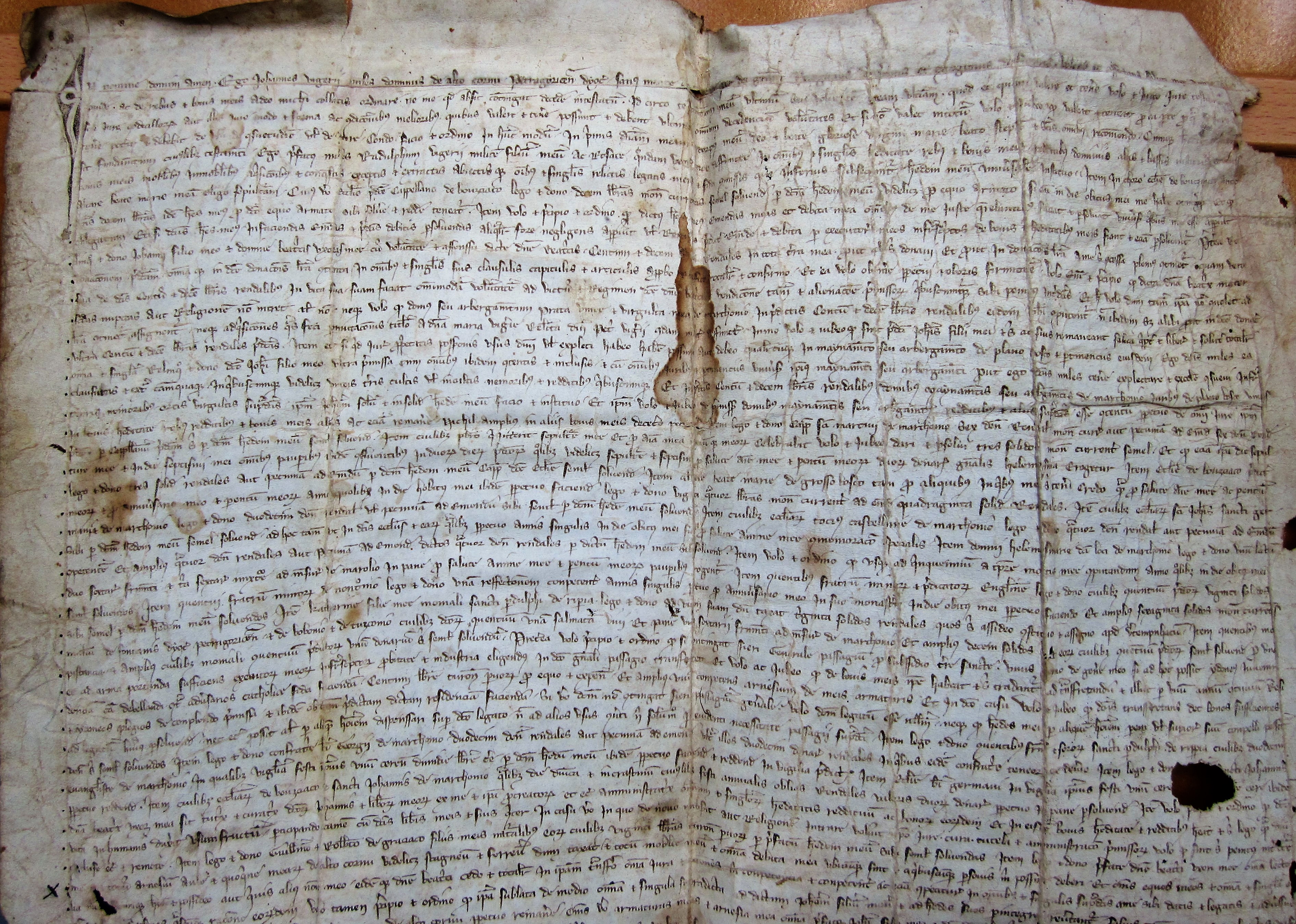 [50] De quoquid testamento ultimo seu ultima voluntate vel dispositione extrema, sigillo dicti domini decani Engolismensis sigillatos, ego Bertrandus de S[ancto] Guignies, / […] sumptum seu transcriptum (extraxi) manu (qualibet) mea propria (mo suo scripsi) meo solito & p…co signam publicam in formas publicas redigendo & de sigillo Engolismensis episcopis / […] sigillare feci in testimonium premissorum, a nobili viro Radulpho Vigerii, milite, domino de Javerlhaco & de Alto Cornu, vocatus & requisitus. Constat de interlineas / superius factas et positas […] dict…, renduales, filium meum, cedo, filiabus, veros & quibus [……… …]repiant ; huius visio, lectio et inspectio actas & factas fuerunt apud Altum Cornu, in aula veteri dicti loci, / […] regnante nostro domino Karolo, Dei gracia Francorum rege, …… illustre, testibus presentibus ad premissa vocatis Robberto Vigerii de Colompnhes, Johanne de Santor, presbitero, & [55] […] sumpto seu transcripto signum predictum in testimonium premissorum duxi apponendum, salvo jure domini Regis et ecclesiae praedictorum et quolibet alieno. (A.D. H-V, 1E3/146 ; parchemin, avec de grandes lacunes)
