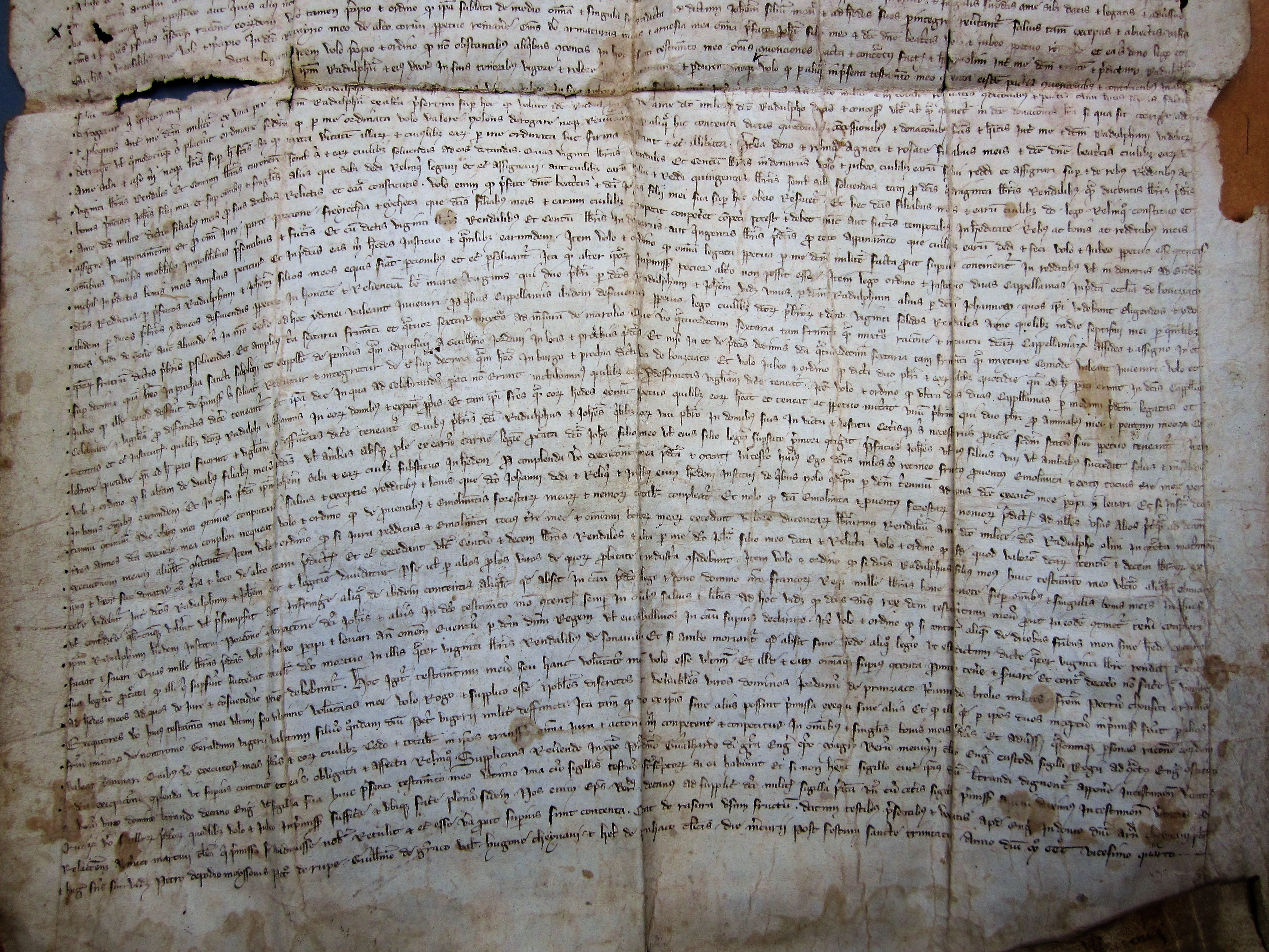 In nomine Domini amen. sumptum seu transcriptum inspecturis et infrascript…, unacum in presentia testimonium subscriptorum ad hec vocatorum specialiter et rogatorum, ……sse …… et diligenter ins…isse et de verbo ad verbum perlegisse quode… testamentum seu dispositionem / ] …… …… …… …sse et in aliqua …… …… sub omnibus suspicione taren… et de vero et incisio sigillo venerabilis decani Engolismensis sigillatum, cuius tenor sequerit in hunc modum :