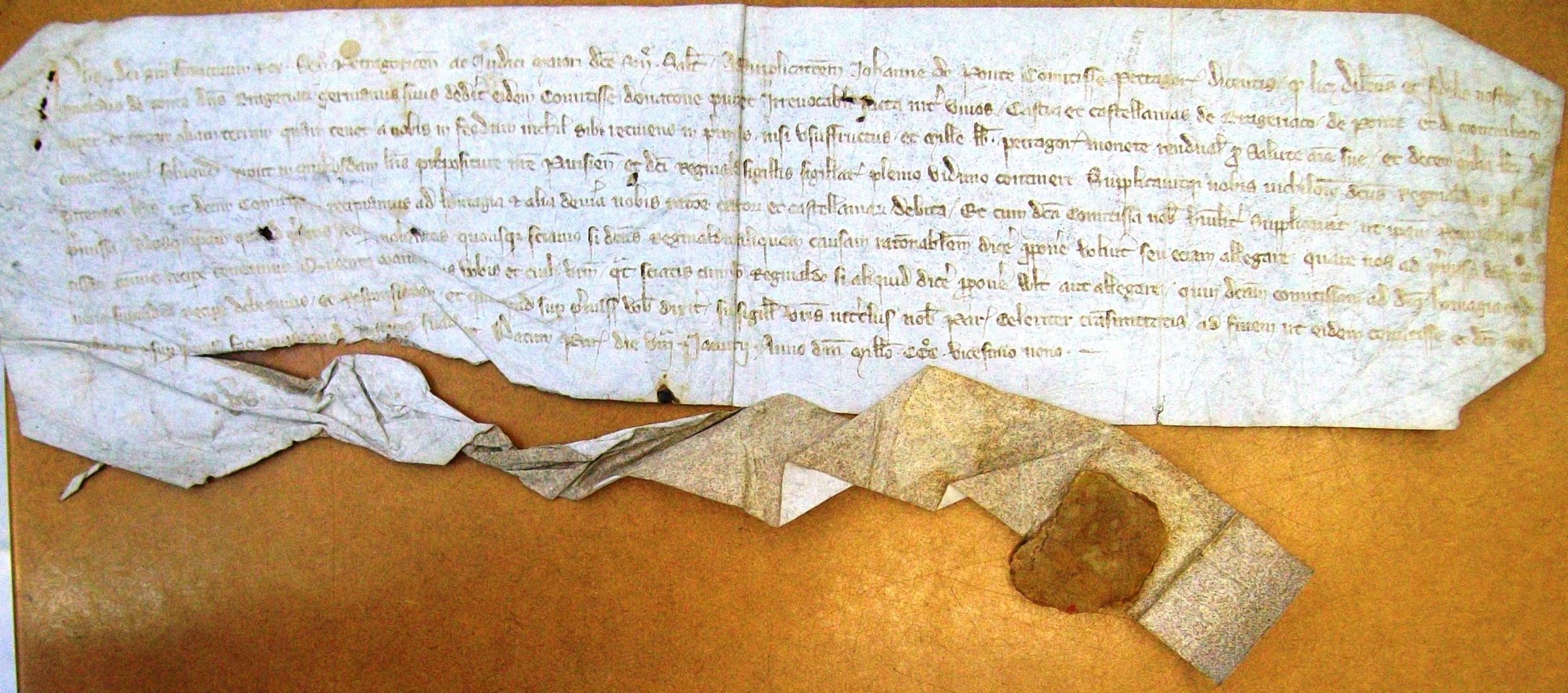 Ratification par Philippe de Valois de la donation des châteaux de Bergerac, Pons et Montignac, faite par Regnaud de Pons à Jeanne, comtesse de Périgord, sa soeur (1329).