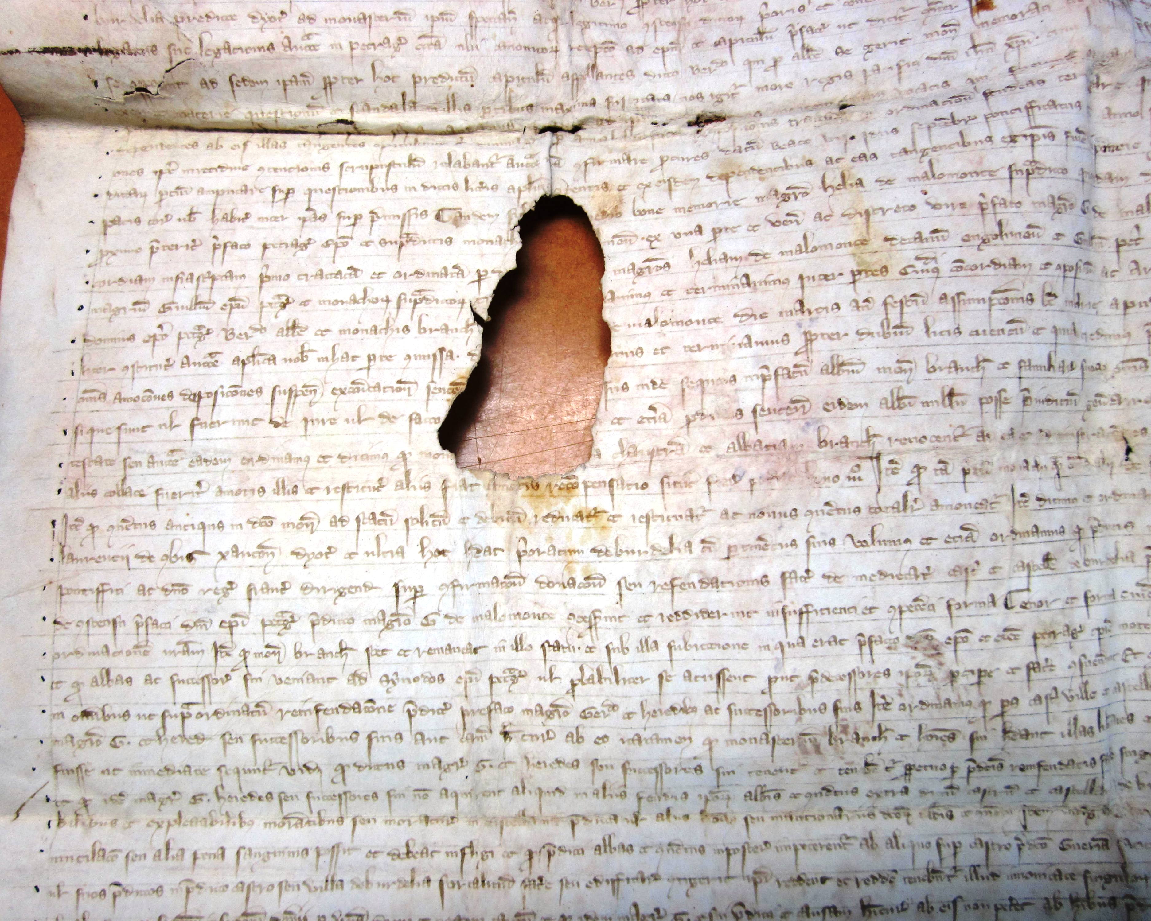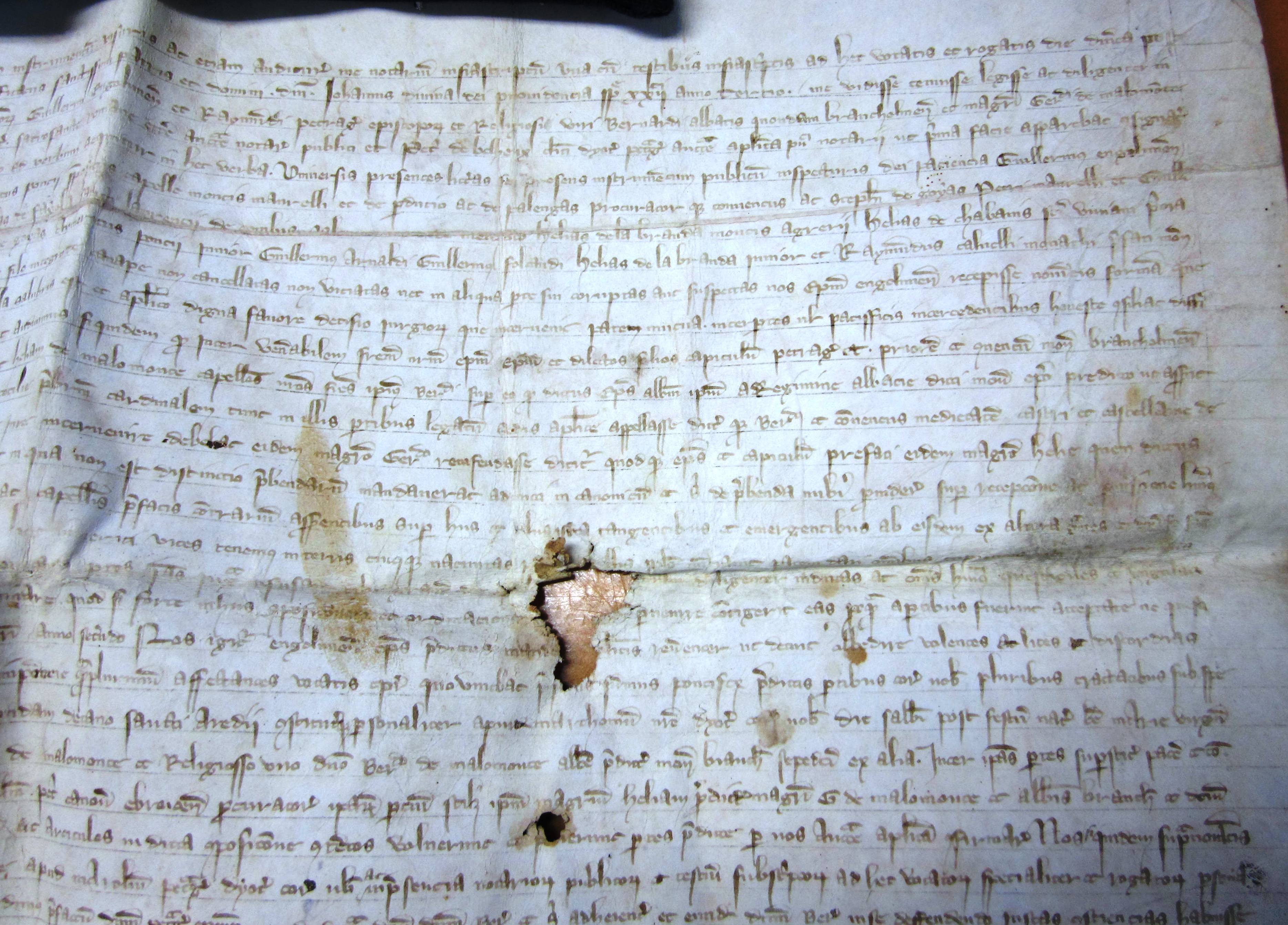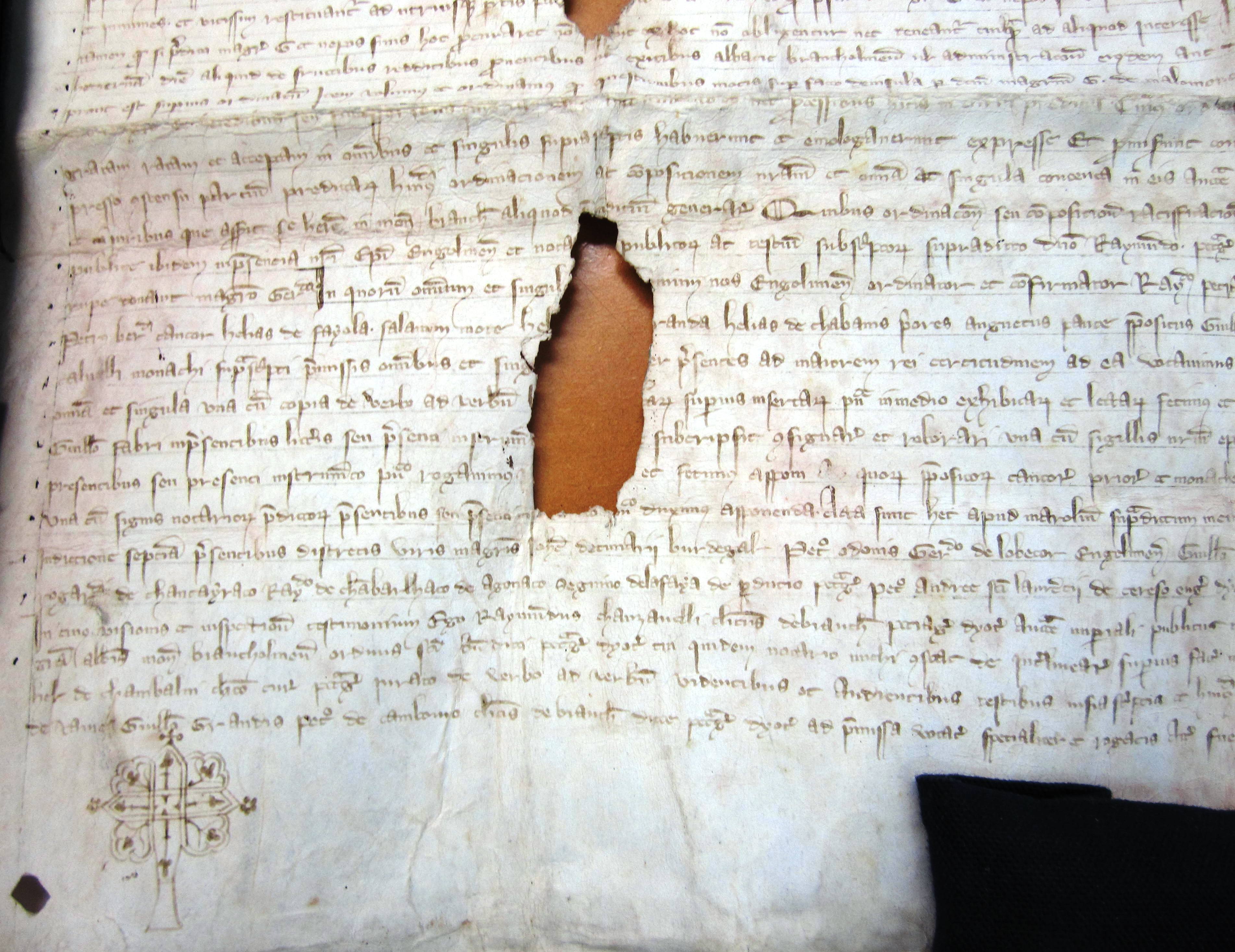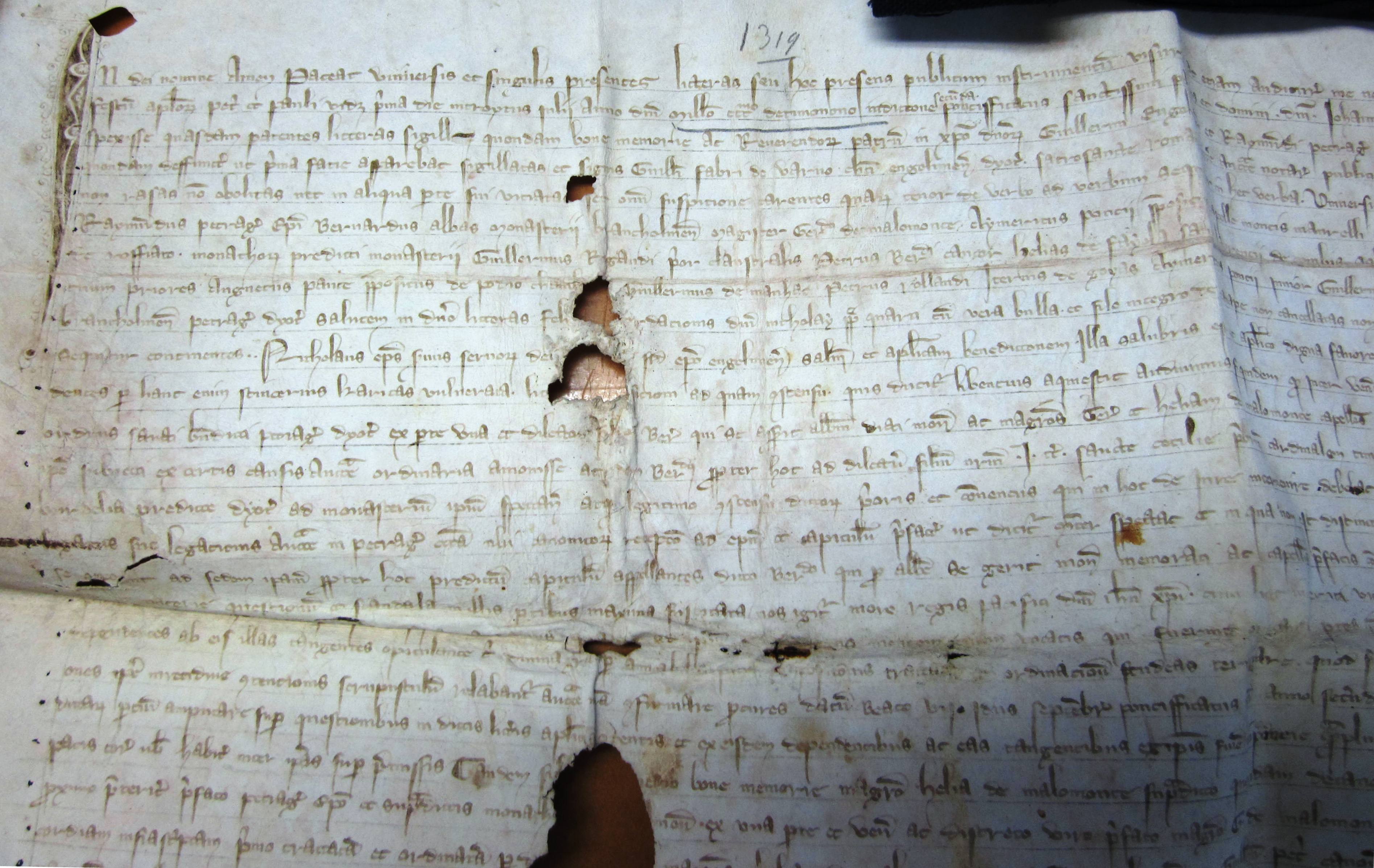 Acte par lequel Bernard de Maumont, abbé de Brantôme, donna à foi et hommage à Gérald de Maumont son frère la moitié de la terre et châtellenie de Bourdeille, ce qui fut confirmé par sentence arbitrale, et l’hommage réservé à l’abbaye de Brantôme (août 1294) (vidimus de 1319).