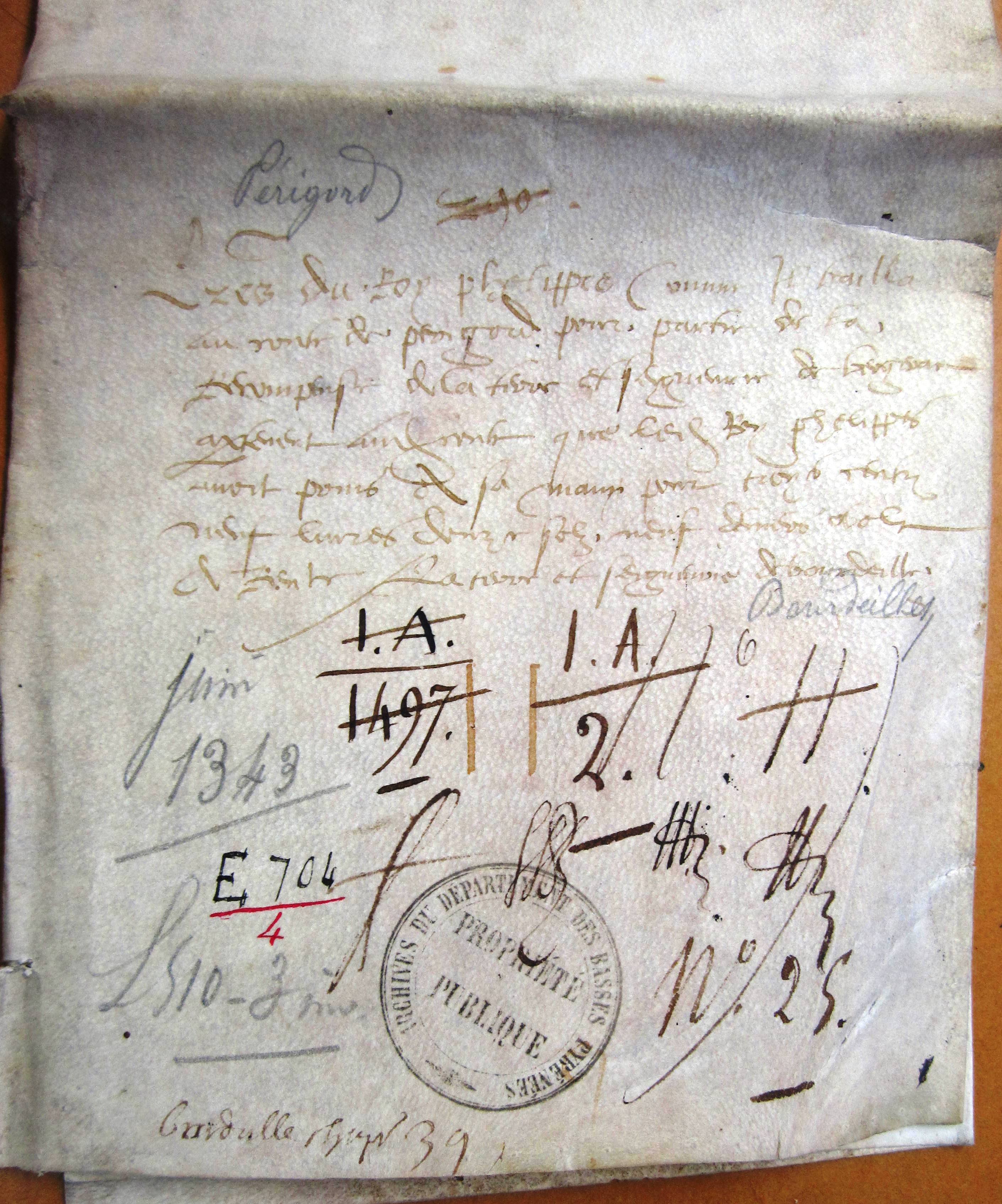 - chapitre 39 (Bourdeille), document cotté n° 11 dans l'inventaire de Jean Fabri - E 607, f° 373 v°.