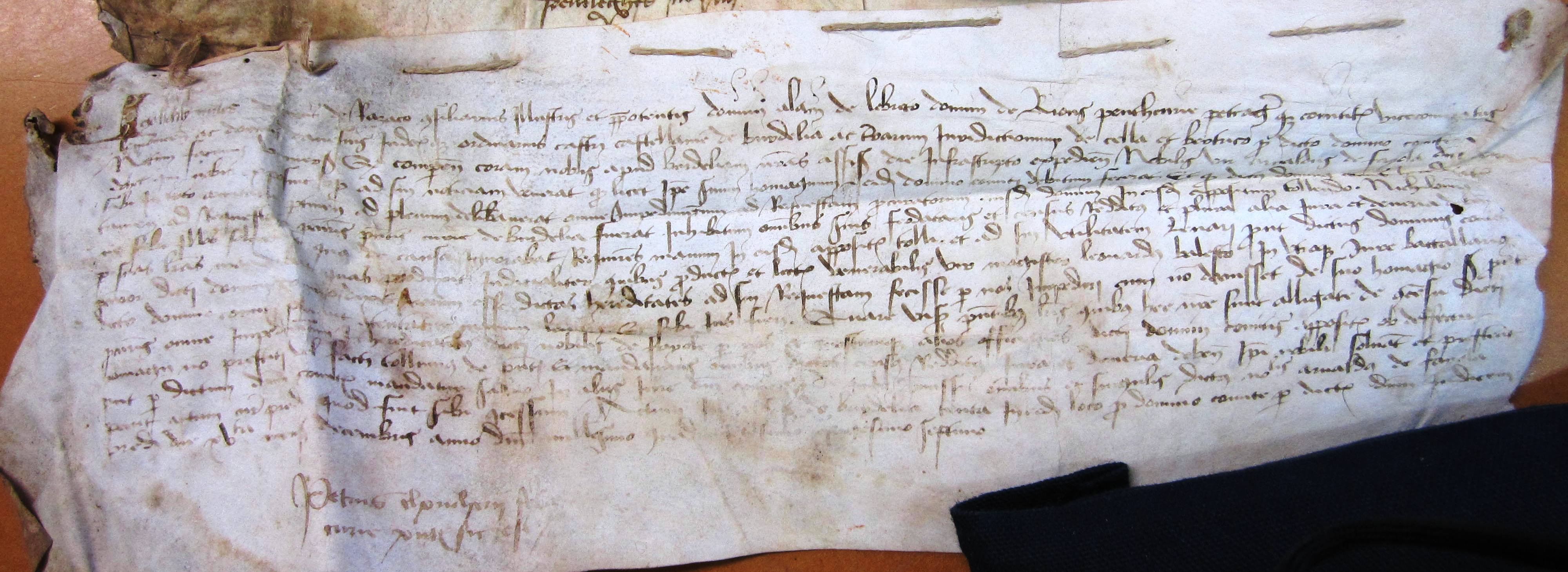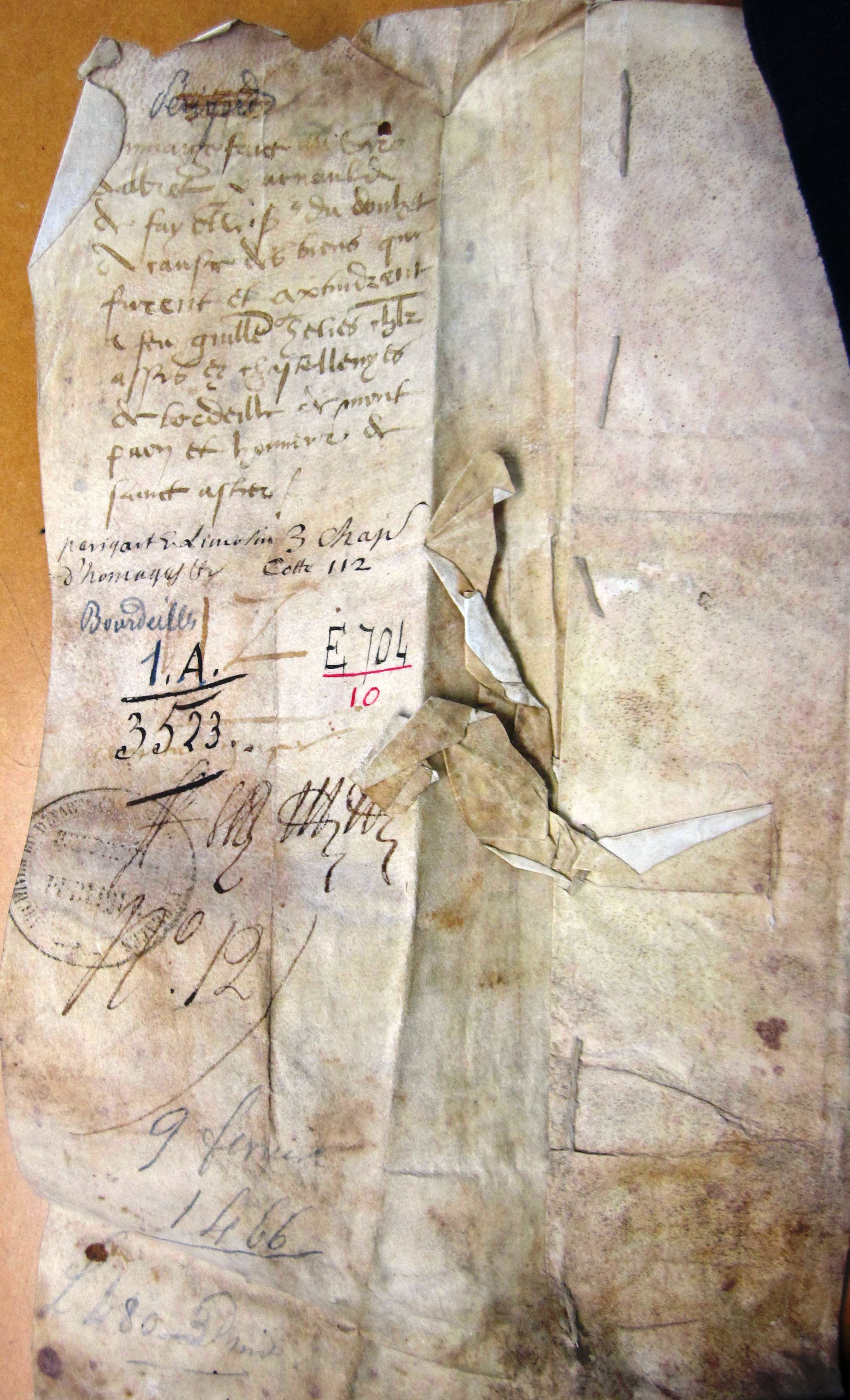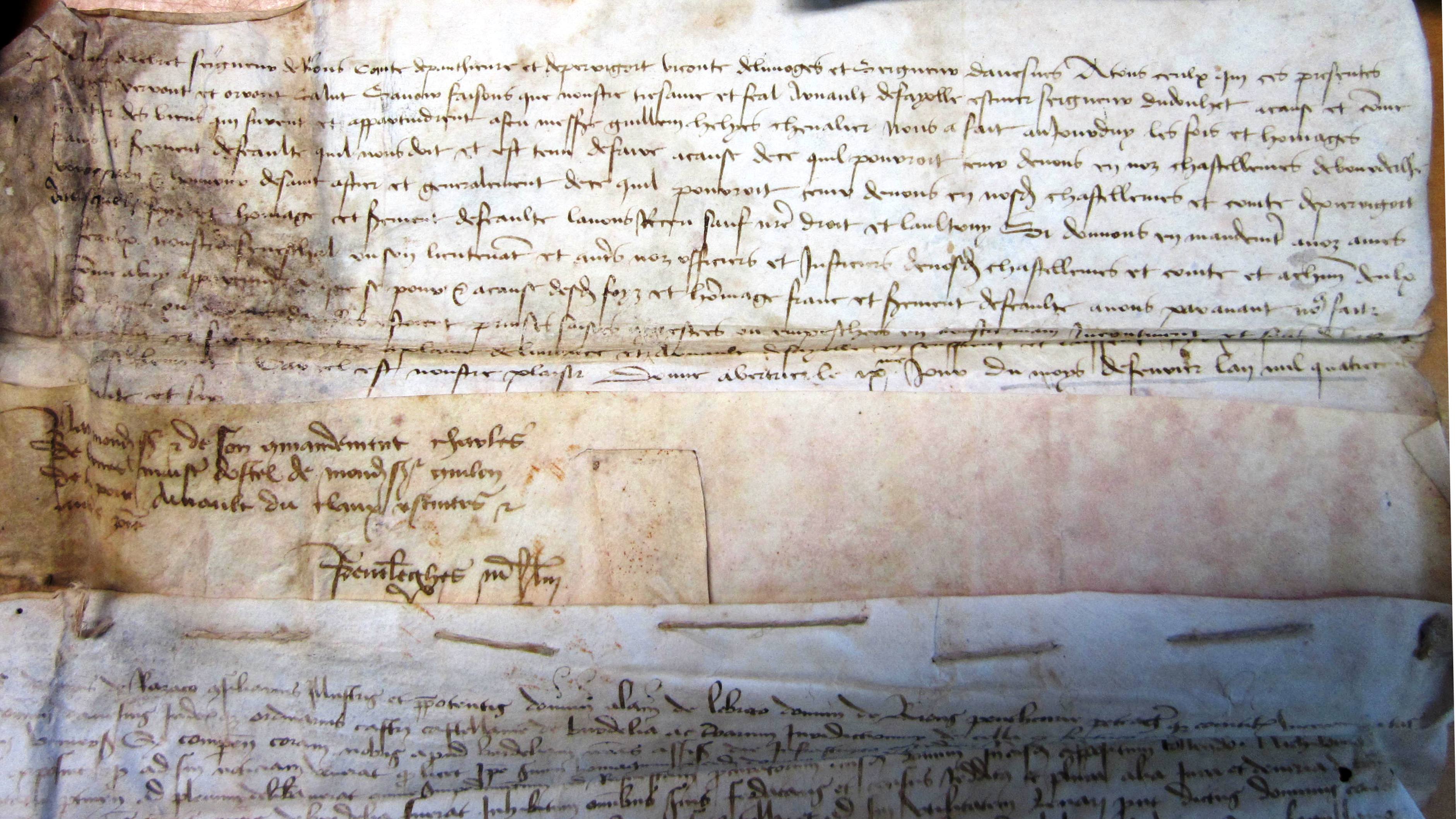 Hommage prêté à Alain d'Albret par Arnaud de Fayolle, pour l'héritage de Guillaume Hélie, chevalier, situé dans les châtellenies de Bourdeille et de Montpon (1466).