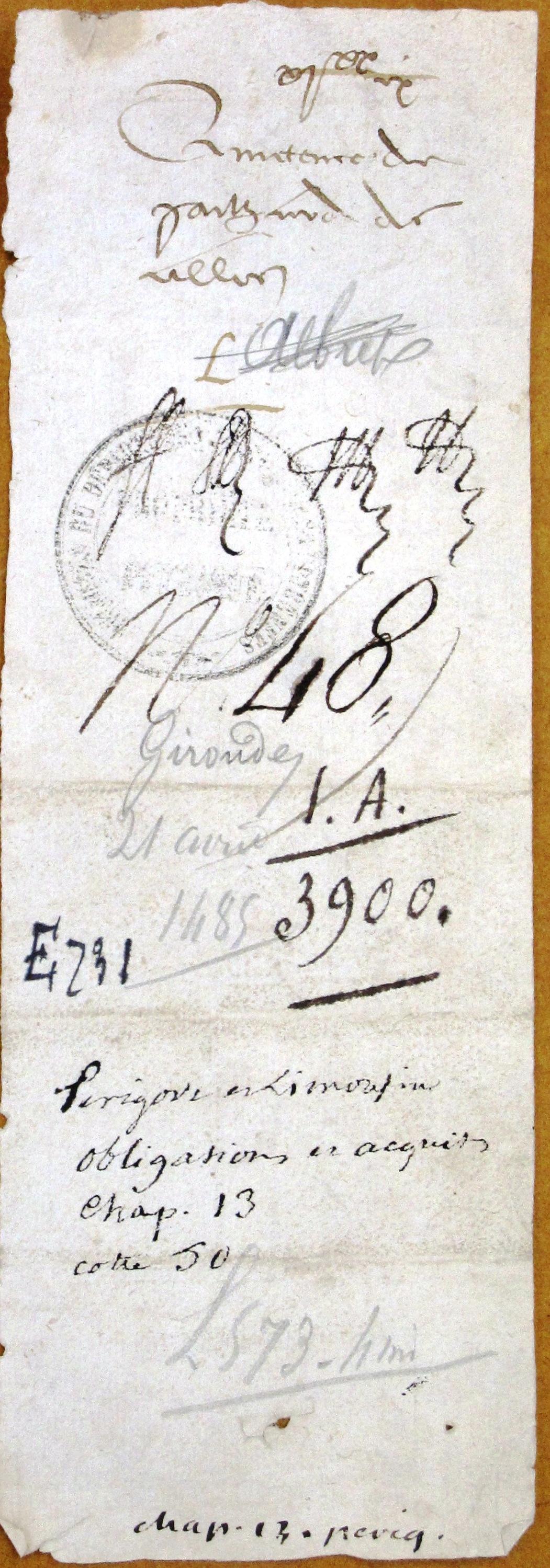 de Gironde, de 3 francs bordelais et 20 ardits reçus par les