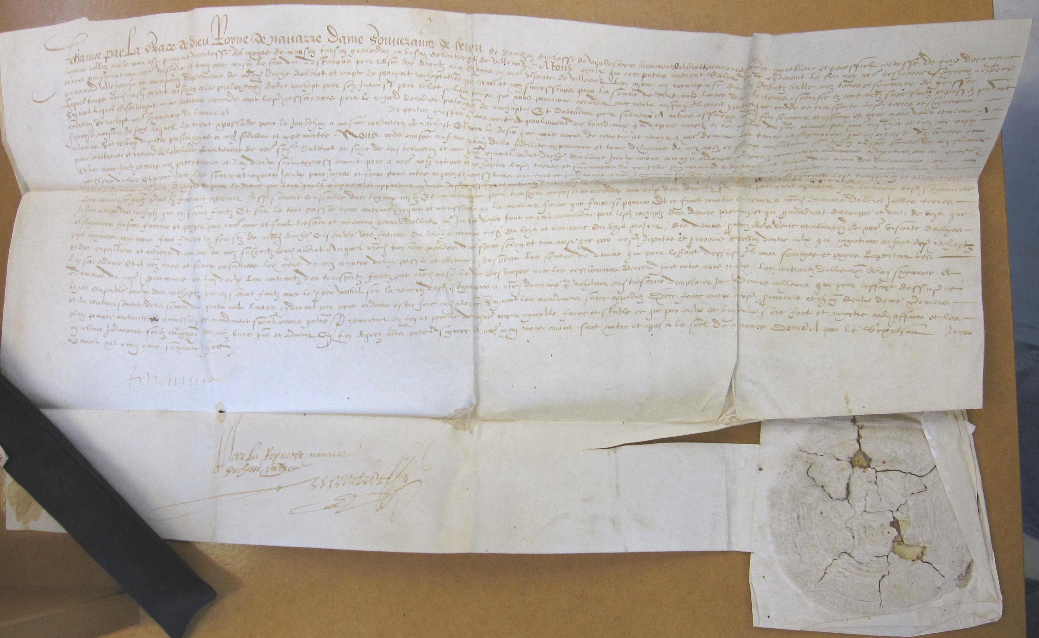 Procuration donnée par Jeanne d'Albret aux officiers de la Chambre des Comptes de Nérac pour vendre à réméré les terres de Gensac, Puynormand et Villefranche (1568).