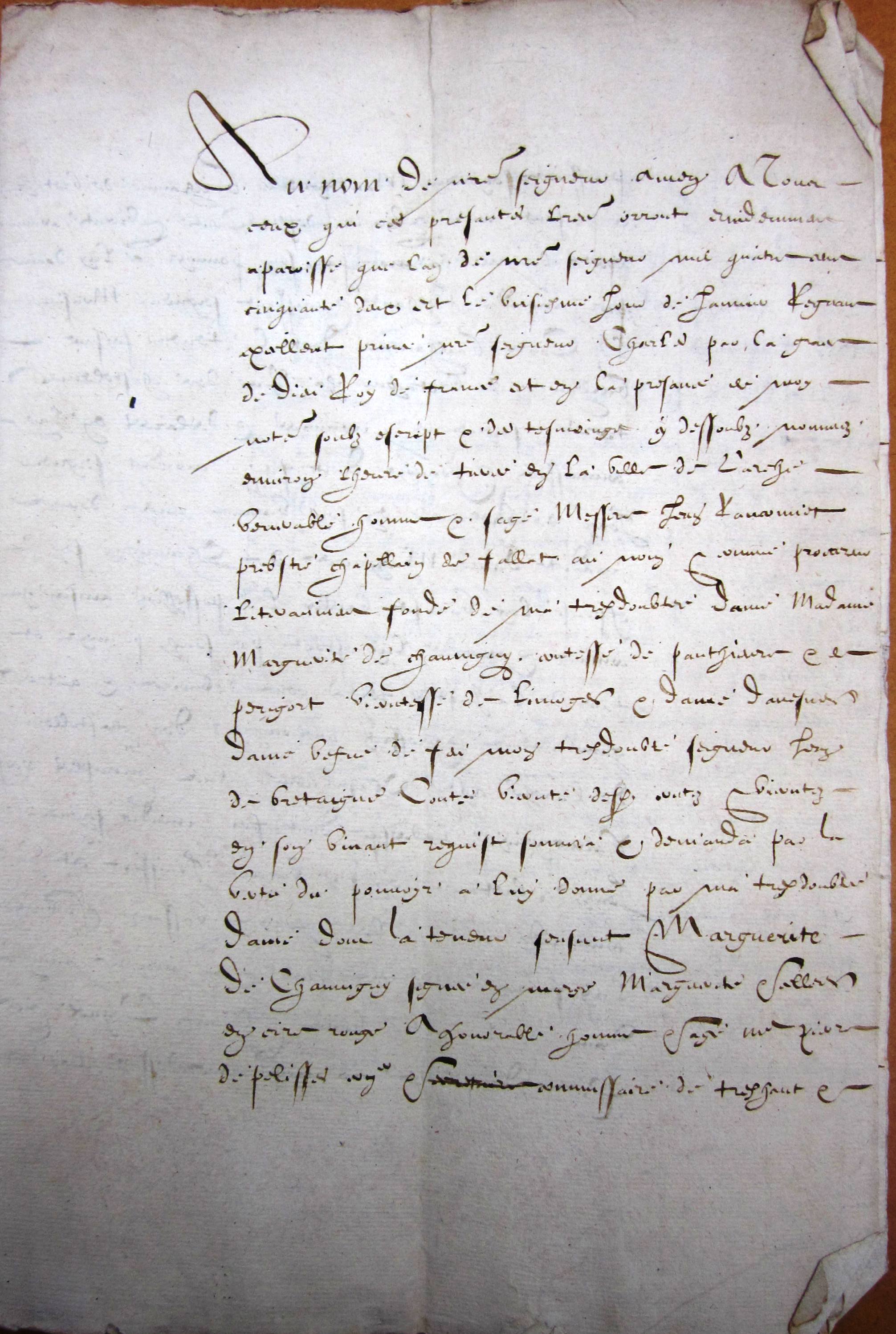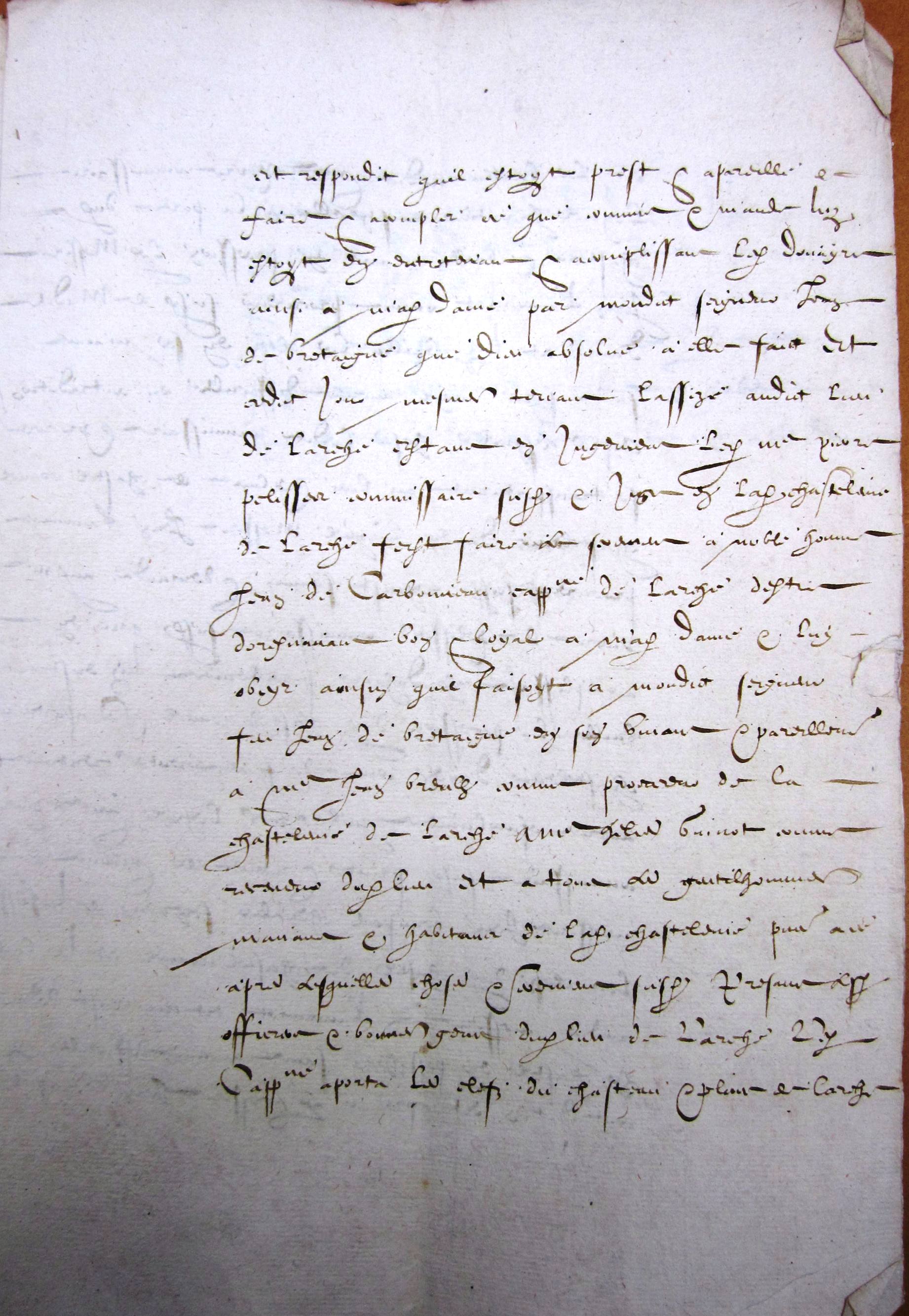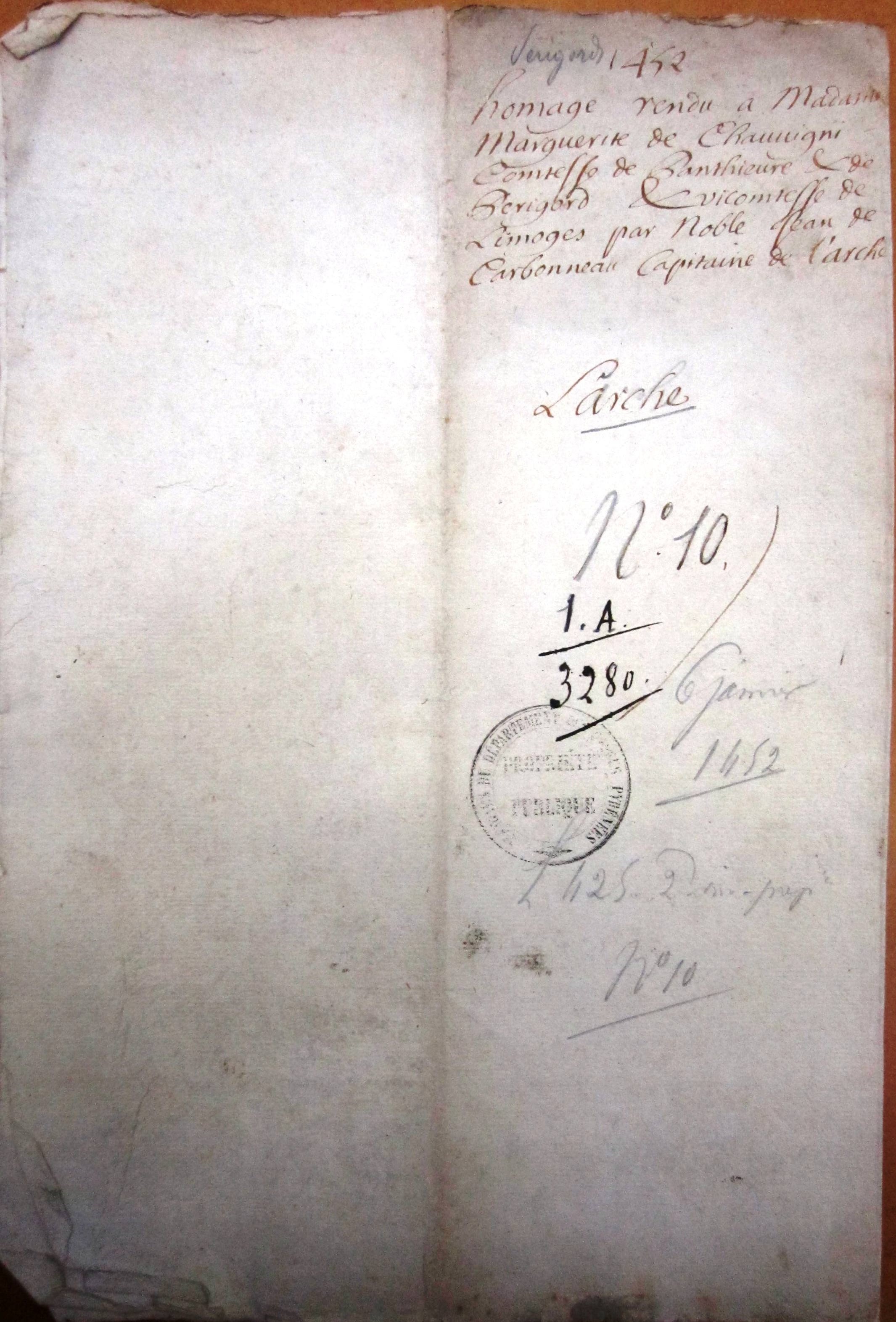 Hommage rendu à Marguerite de Chauvigny comtesse de Périgord pour Larche par noble Jean de Carbonneau capitaine de Larche (6 janvier 1452 v. st.).