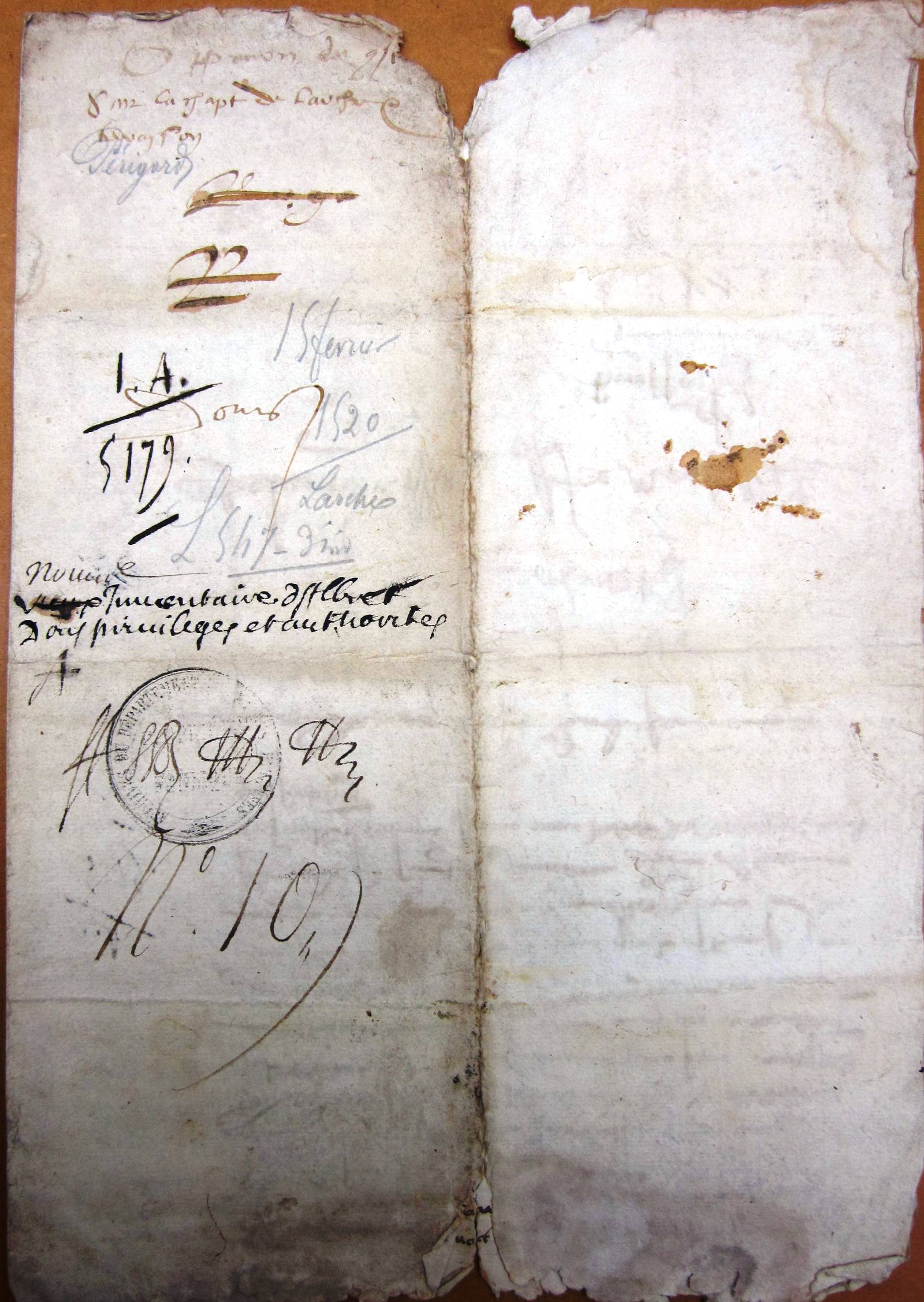 Acte concernant le contrat de vente des seigneuries de Larche et Terrasson par René de Bretagne à Amanieu cardinal d'Albret (15 fevrier 1520 - v. st).