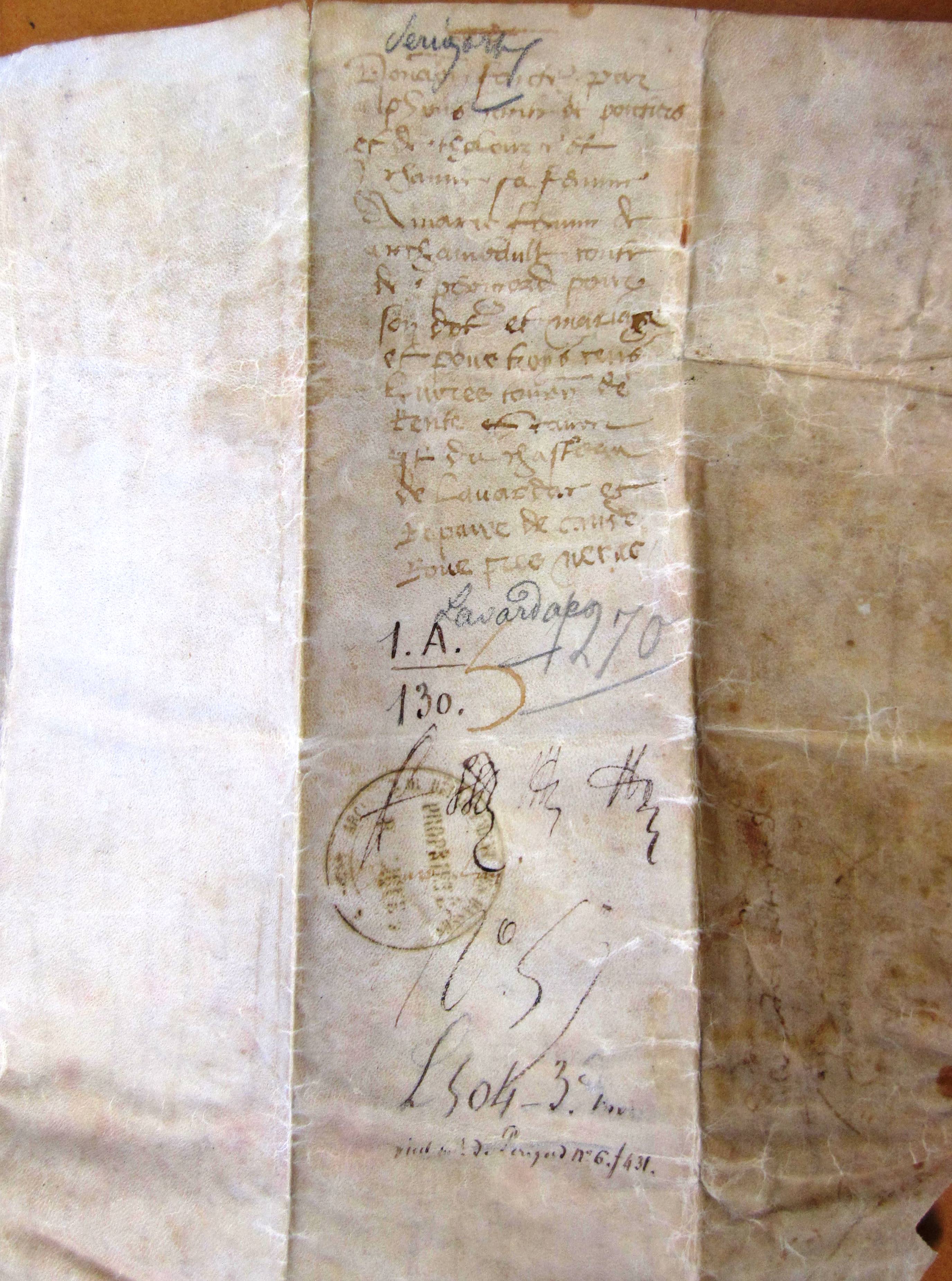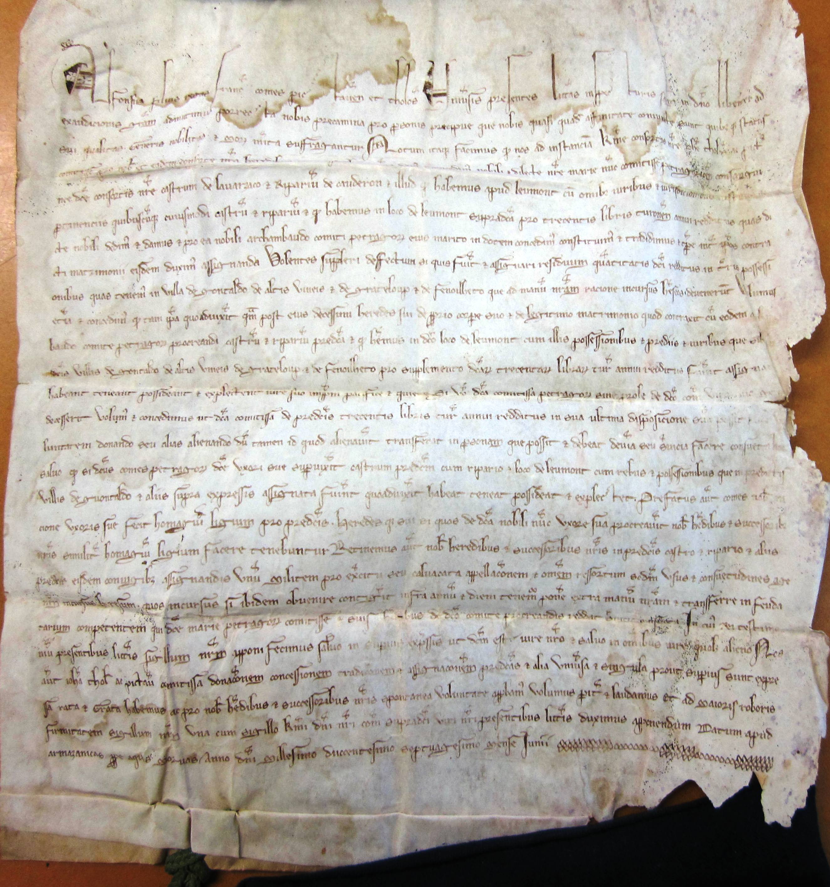 Donation des seigneuries de Lavardac et Cauderoue par Alphonse, comte de Poitiers, à Archambaud III, comte de Périgord, et à Marie, sa femme (original de 1270).